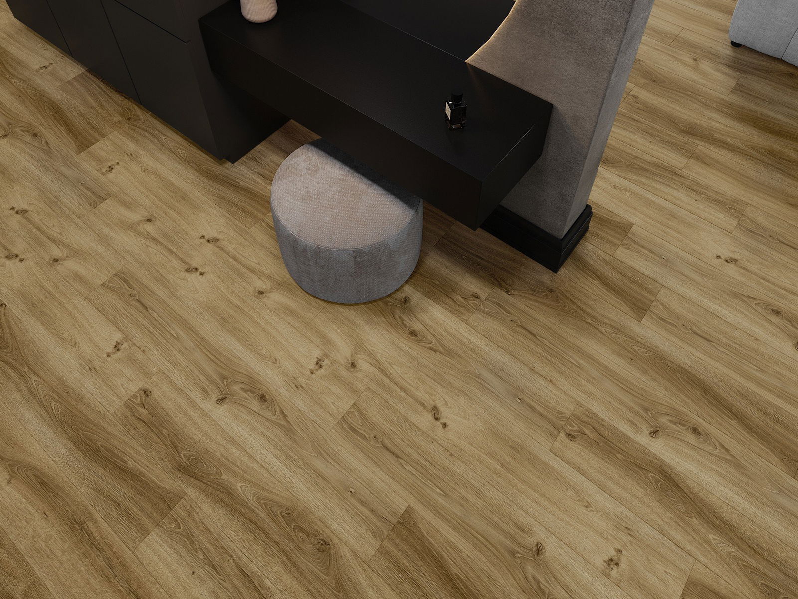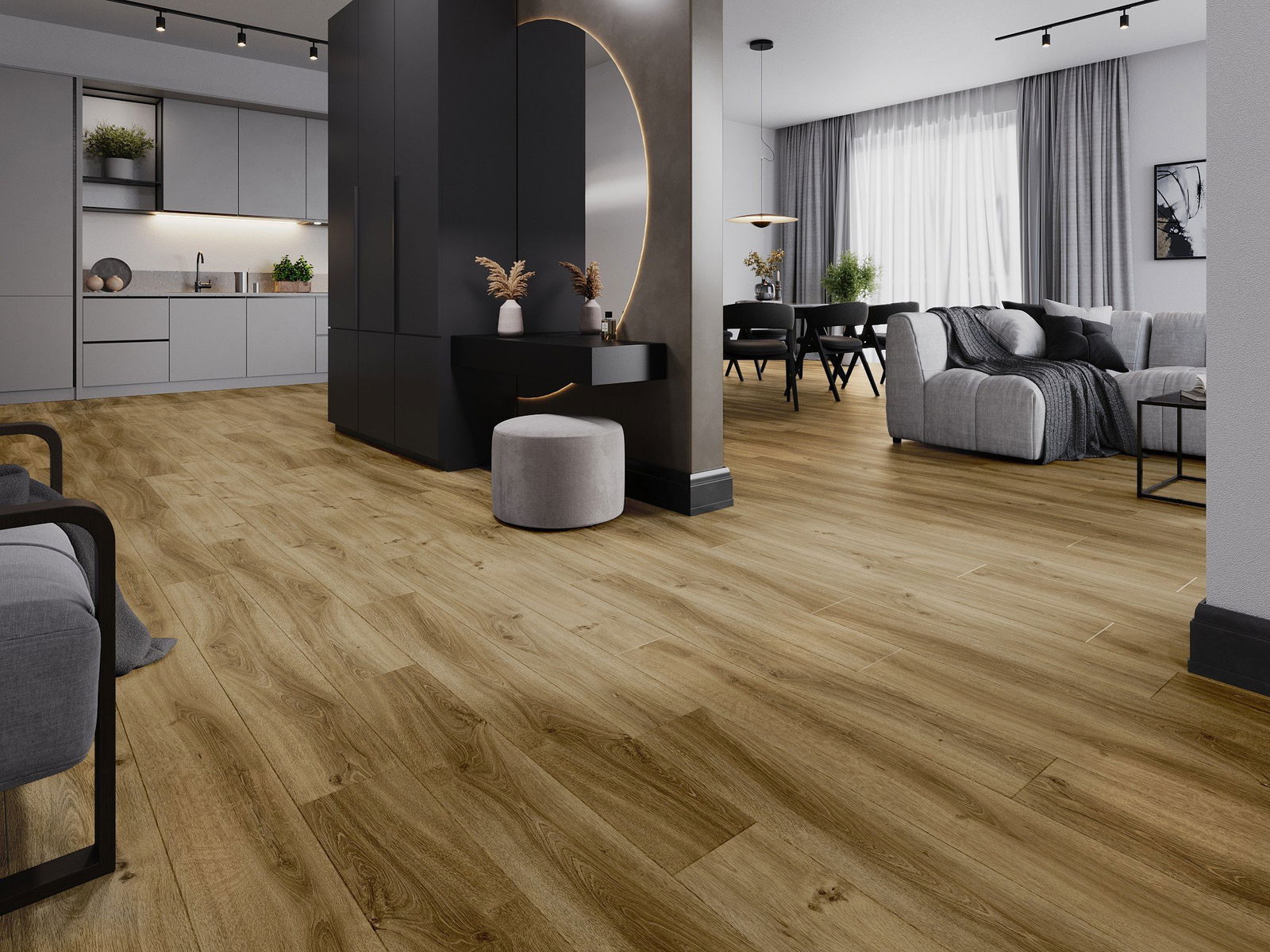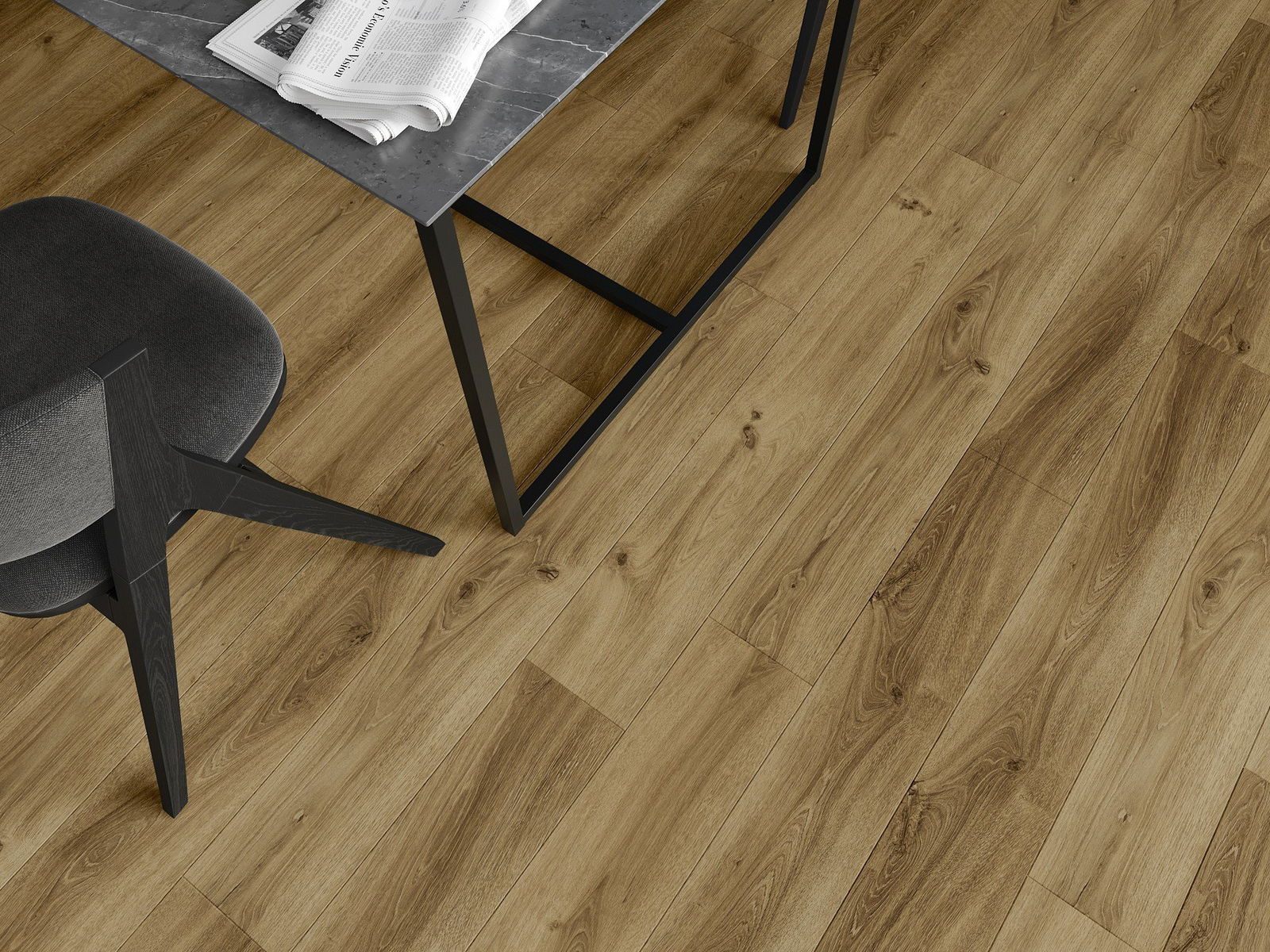 Panele posiadają 4-stronną fugę - każdy bok został wyfrezowany w taki sposób, by po ułożeniu powstało łączenie w kształcie litery V. Taki design sprawia, że podłoga nabiera wyraźniejszej struktury, co nadaje jej głębi i estetycznego charakteru. Efekt ten jest szczególnie ceniony w nowoczesnych aranżacjach, gdzie detale podkreślają wyjątkowy wygląd wnętrza.