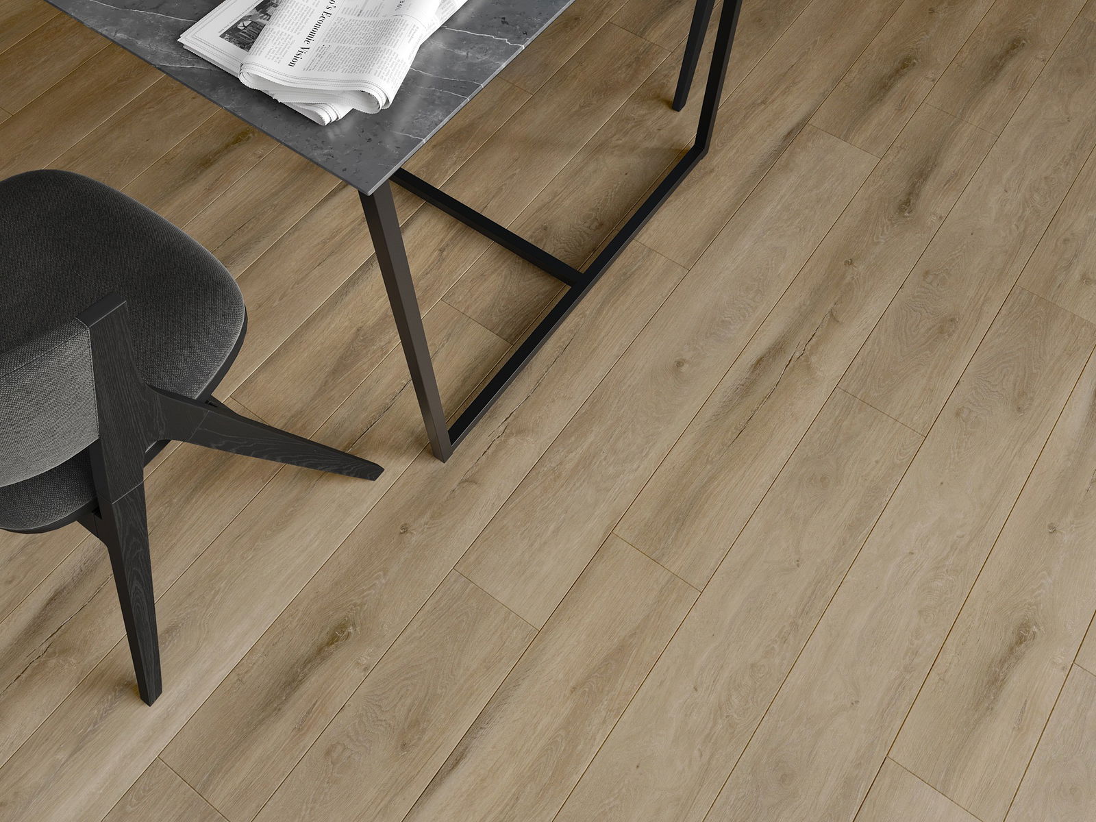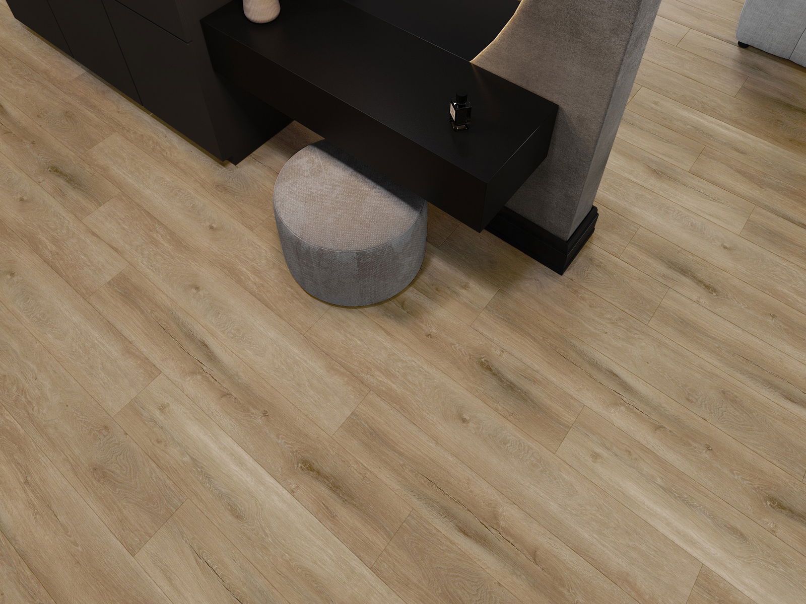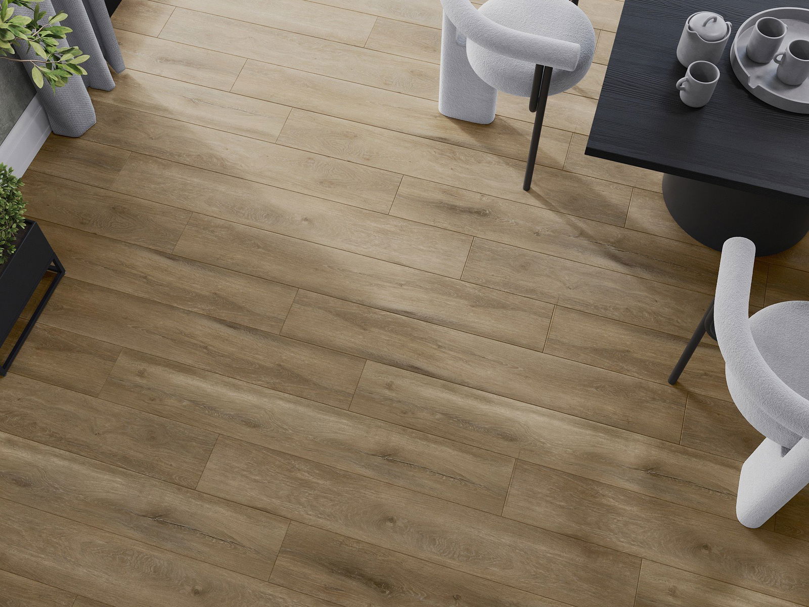 Panele posiadają 4-stronną fugę - każdy bok został wyfrezowany w taki sposób, by po ułożeniu powstało łączenie w kształcie litery V. Taki design sprawia, że podłoga nabiera wyraźniejszej struktury, co nadaje jej głębi i estetycznego charakteru. Efekt ten jest szczególnie ceniony w nowoczesnych aranżacjach, gdzie detale podkreślają wyjątkowy wygląd wnętrza.