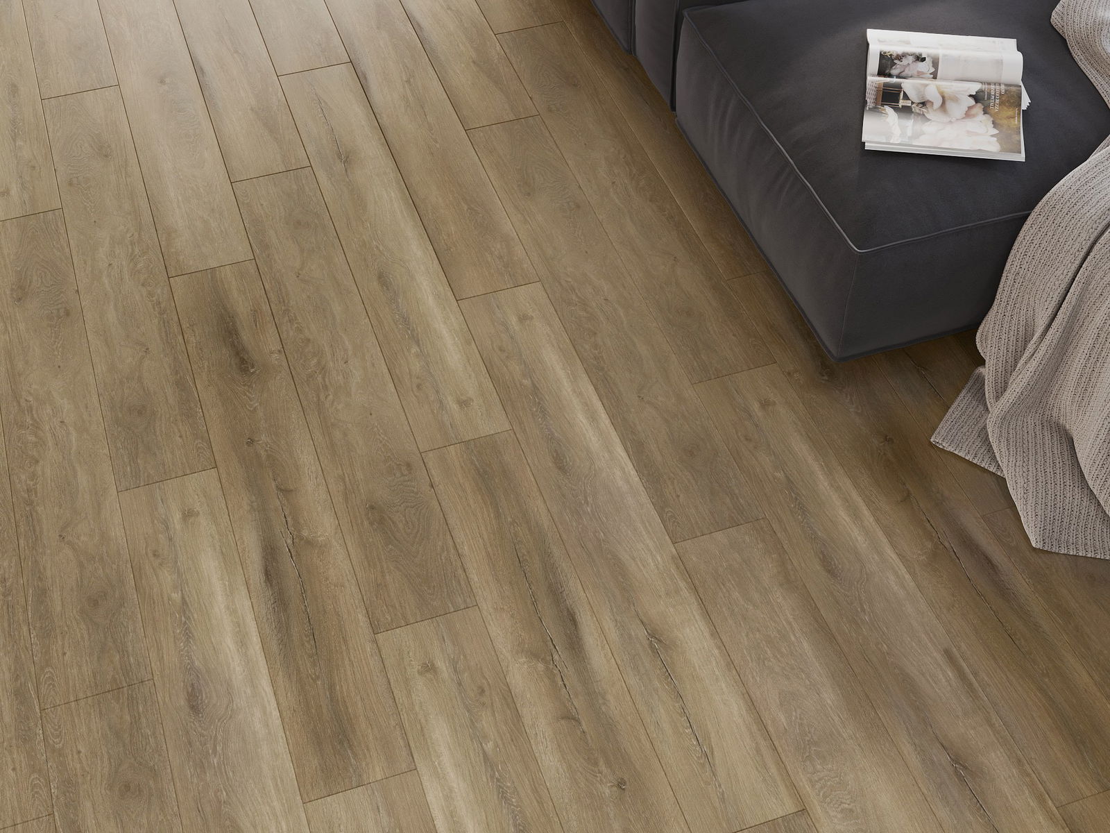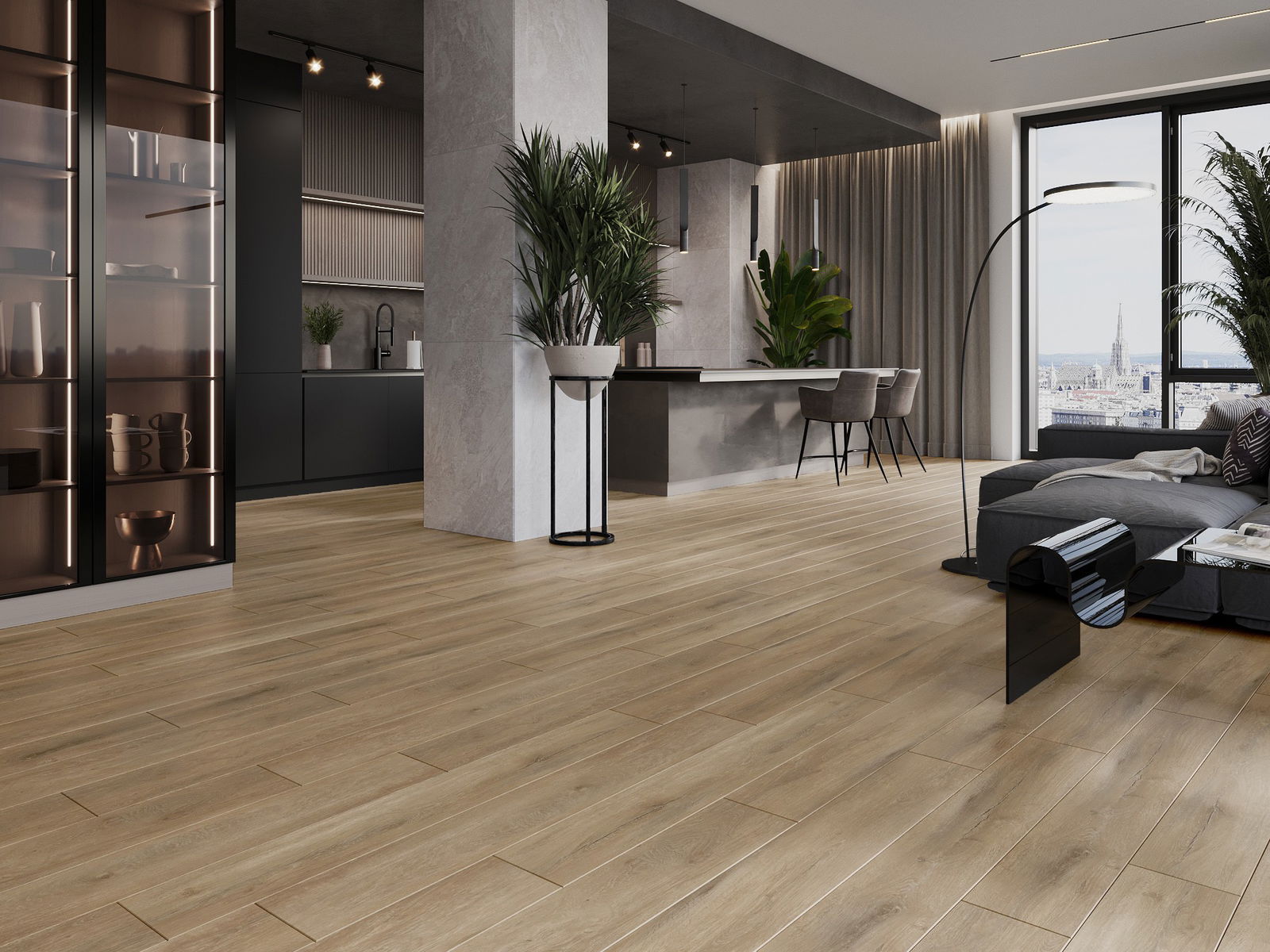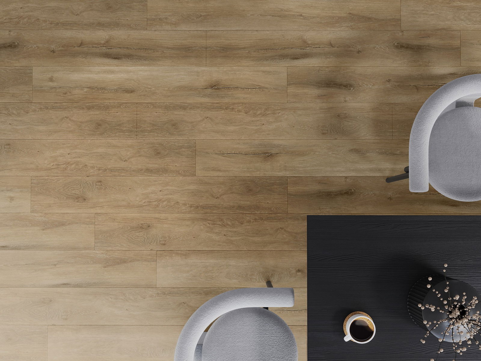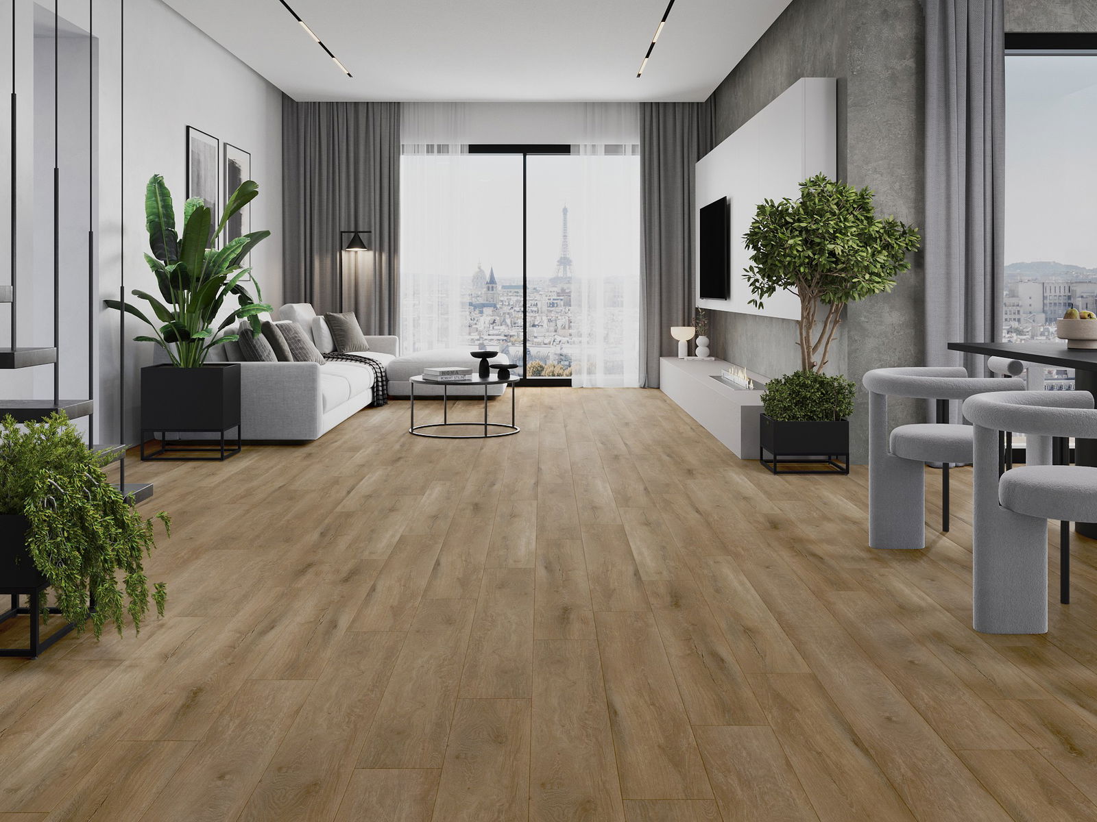 Panele posiadają 4-stronną fugę - każdy bok został wyfrezowany w taki sposób, by po ułożeniu powstało łączenie w kształcie litery V. Taki design sprawia, że podłoga nabiera wyraźniejszej struktury, co nadaje jej głębi i estetycznego charakteru. Efekt ten jest szczególnie ceniony w nowoczesnych aranżacjach, gdzie detale podkreślają wyjątkowy wygląd wnętrza.