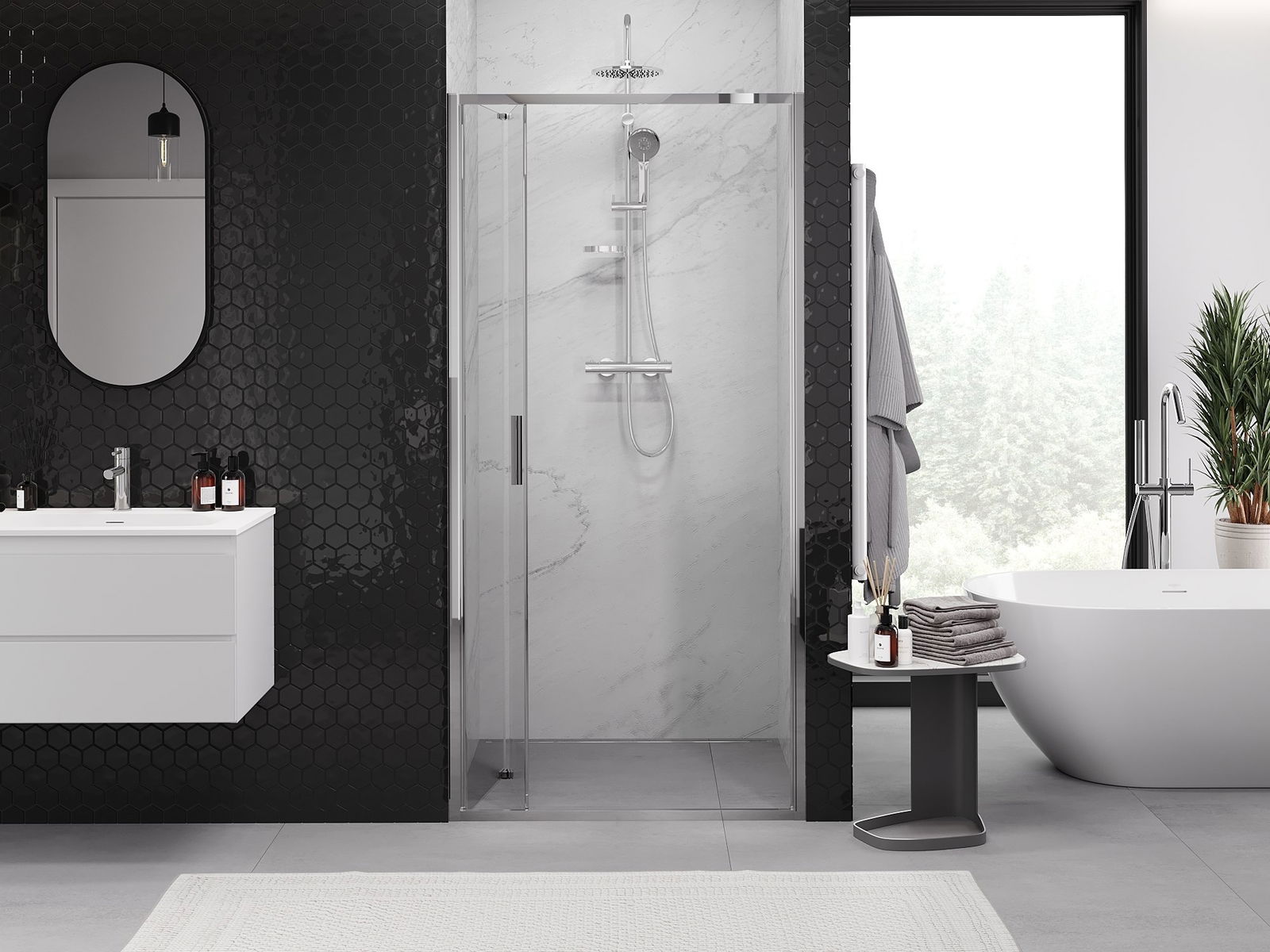 Możliwość składania drzwi, zarówno do zewnątrz, jak i do wewnątrz, pozwala uzyskać więcej przestrzeni podczas niekorzystania z prysznica. Jest to idealne rozwiązanie do mniejszych łazienek, maksymalnie wykorzystujące dostępną powierzchnię.