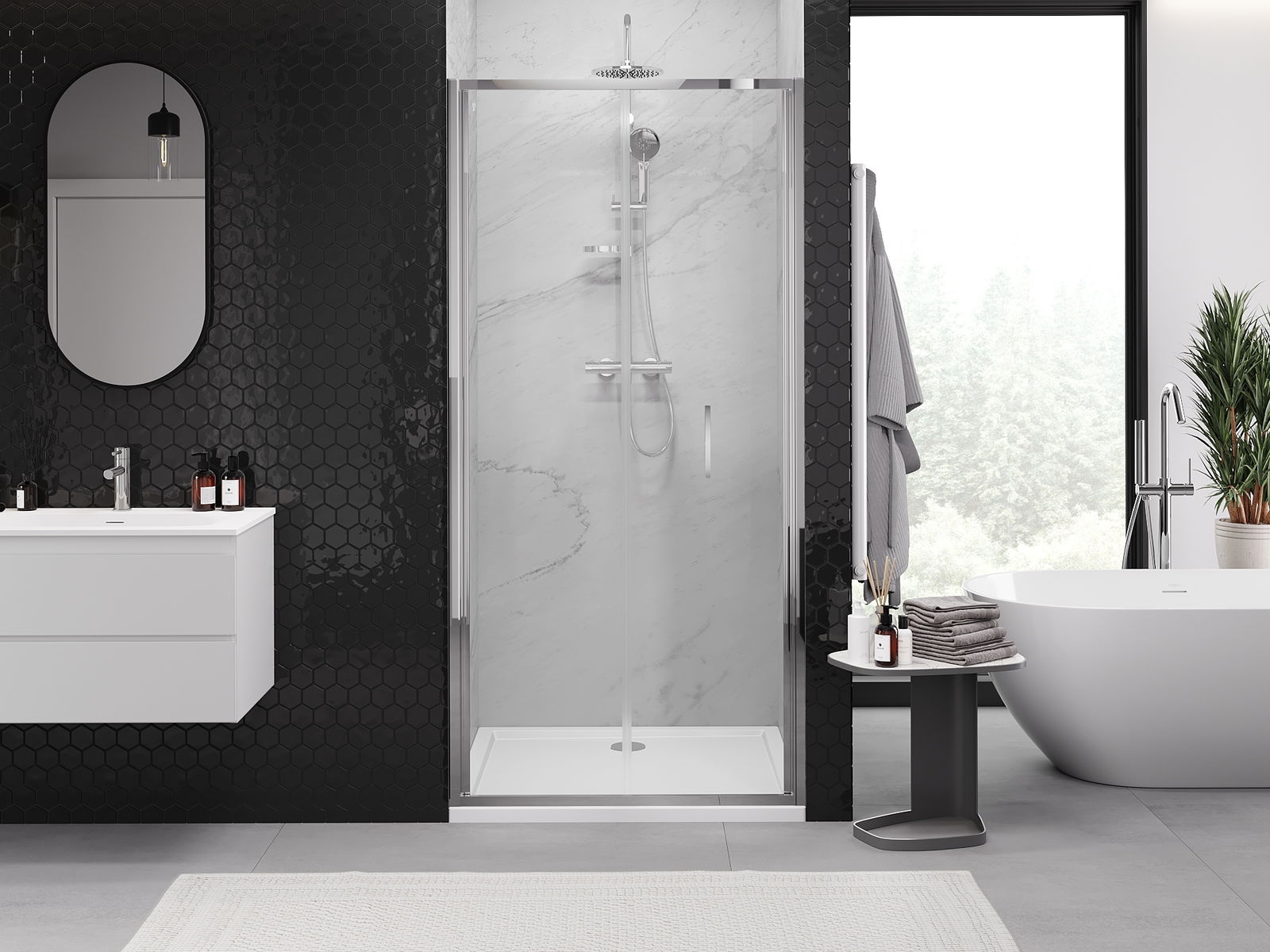 Możliwość składania drzwi, zarówno do zewnątrz, jak i do wewnątrz, pozwala uzyskać więcej przestrzeni podczas niekorzystania z prysznica. Jest to idealne rozwiązanie do mniejszych łazienek, maksymalnie wykorzystujące dostępną powierzchnię.