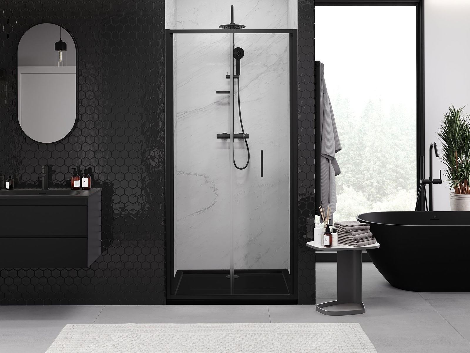 Możliwość składania drzwi, zarówno do zewnątrz, jak i do wewnątrz, pozwala uzyskać więcej przestrzeni podczas niekorzystania z prysznica. Jest to idealne rozwiązanie do mniejszych łazienek, maksymalnie wykorzystujące dostępną powierzchnię.