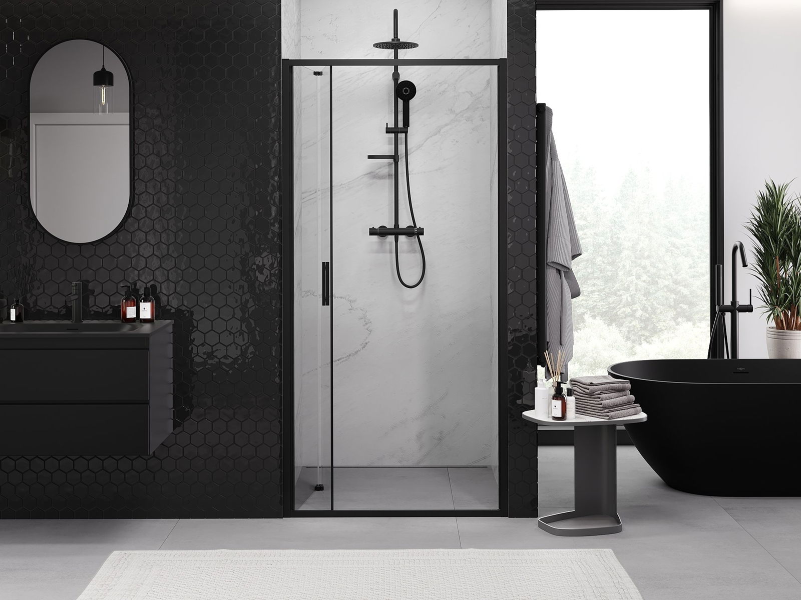 Możliwość składania drzwi, zarówno do zewnątrz, jak i do wewnątrz, pozwala uzyskać więcej przestrzeni podczas niekorzystania z prysznica. Jest to idealne rozwiązanie do mniejszych łazienek, maksymalnie wykorzystujące dostępną powierzchnię.
