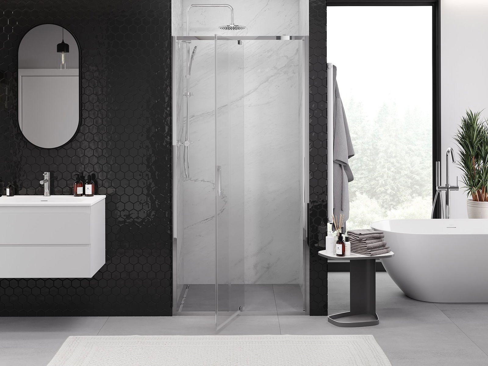 Poręczny i wygodny uchwyt został wykonany z trwałego i odpornego metalu. Modny kształt w połączeniu z wykończeniem dopasowanym do koloru profili nadaje całości nowoczesnego i stylowego wyglądu, podkreślając estetykę każdej łazienki.