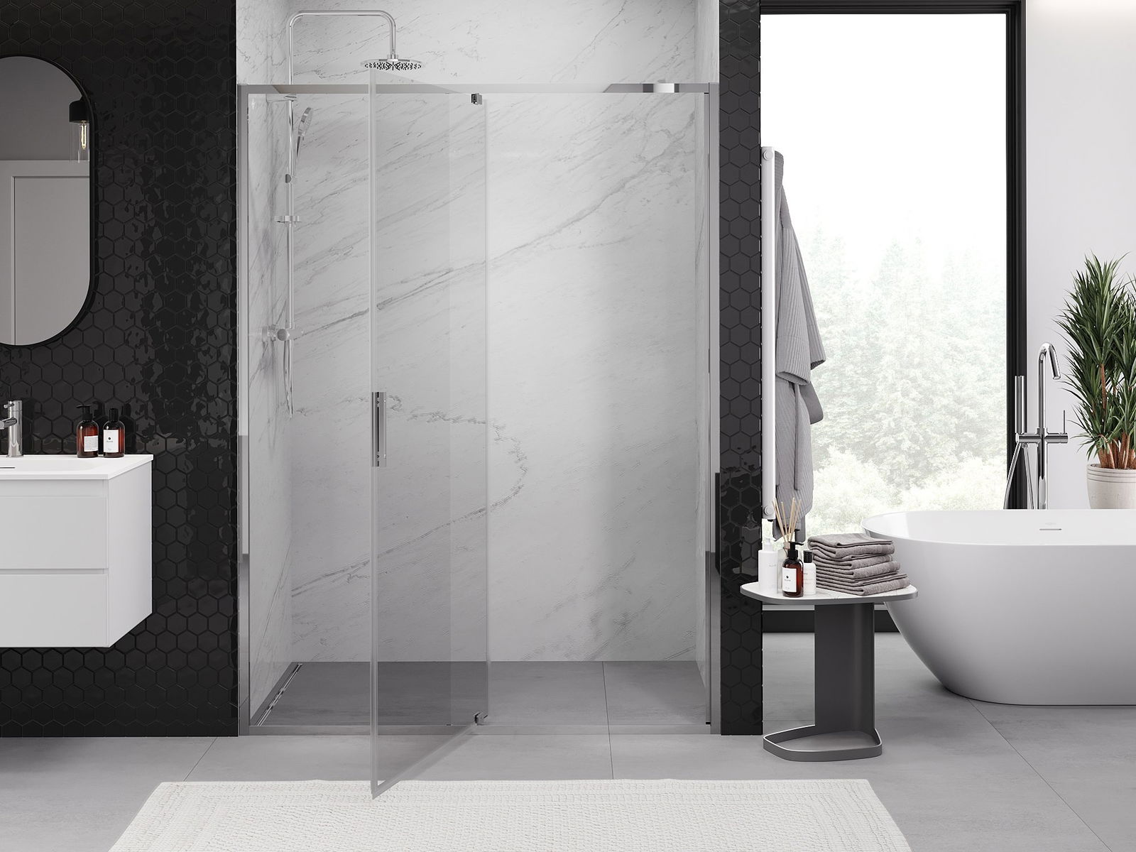 Dzięki zastosowaniu uniwersalnego systemu mocowania, drzwi prysznicowe mogą zostać zamontowane z prawej lub z lewej strony, zależnie od potrzeb. Dzięki temu możesz z łatwością zaprojektować prysznic dopasowany do przestrzeni łazienki.