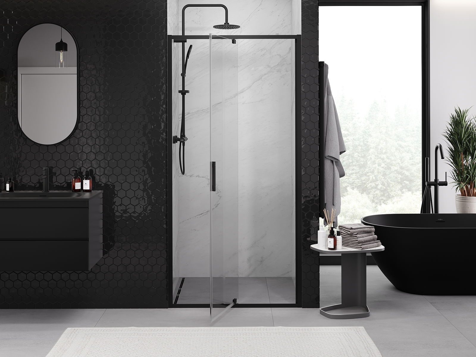 Poręczny i wygodny uchwyt został wykonany z trwałego i odpornego metalu. Modny kształt w połączeniu z wykończeniem dopasowanym do koloru profili nadaje całości nowoczesnego i stylowego wyglądu, podkreślając estetykę każdej łazienki.