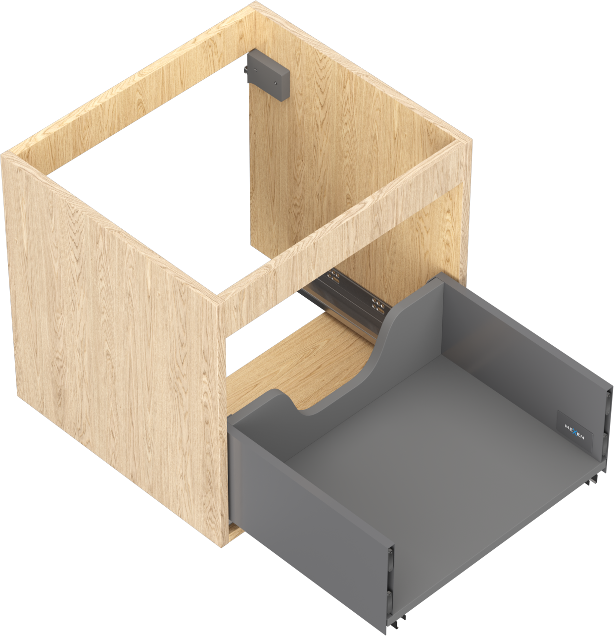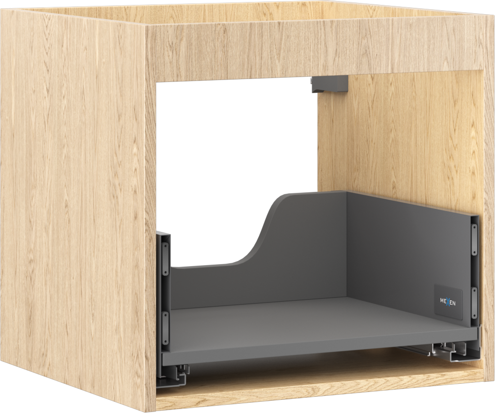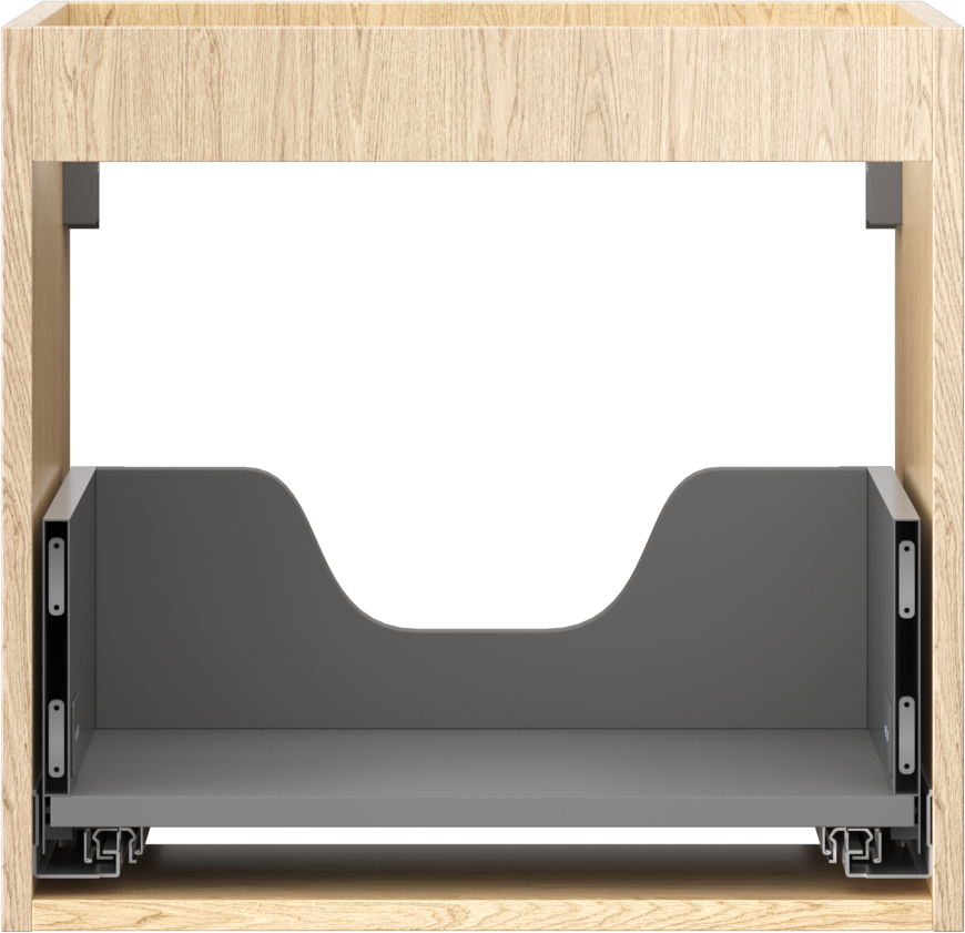 Wycięcie w szufladzie jest zaprojektowane w taki sposób, aby pomieścić syfon, który jest niezbędny w instalacjach umywalkowych. Dzięki temu mebel może być zamontowany w pełni funkcjonalnie, bez konieczności rezygnowania z przestrzeni w szufladzie na rzecz instalacji.