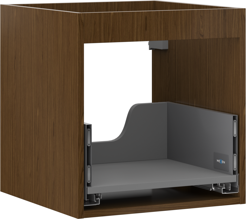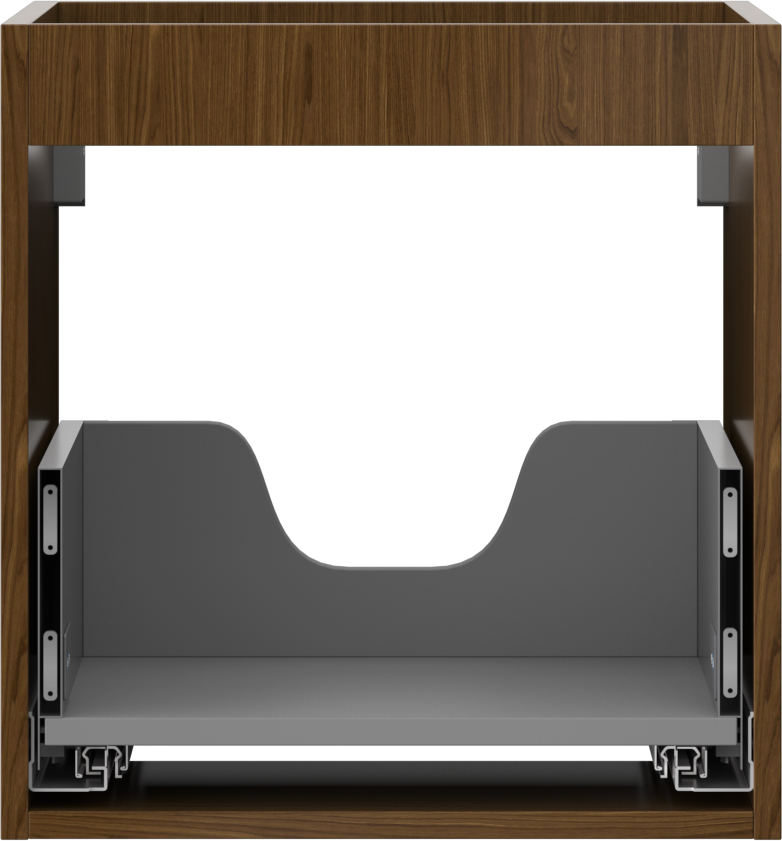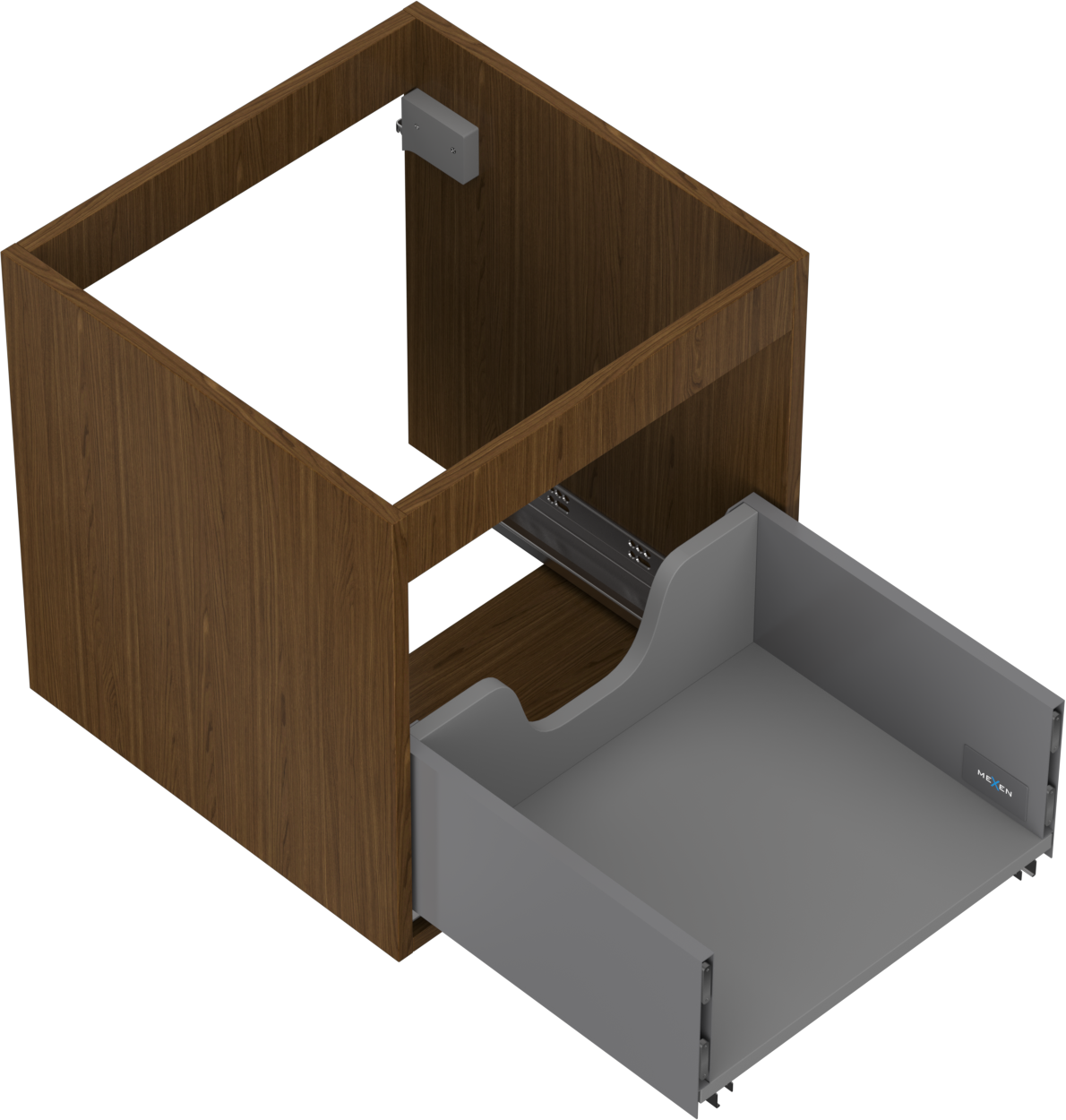 Wycięcie w szufladzie jest zaprojektowane w taki sposób, aby pomieścić syfon, który jest niezbędny w instalacjach umywalkowych. Dzięki temu mebel może być zamontowany w pełni funkcjonalnie, bez konieczności rezygnowania z przestrzeni w szufladzie na rzecz instalacji.