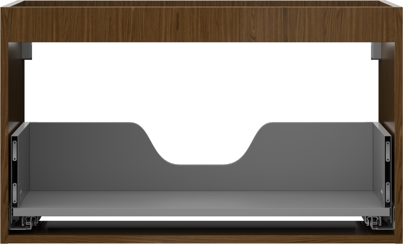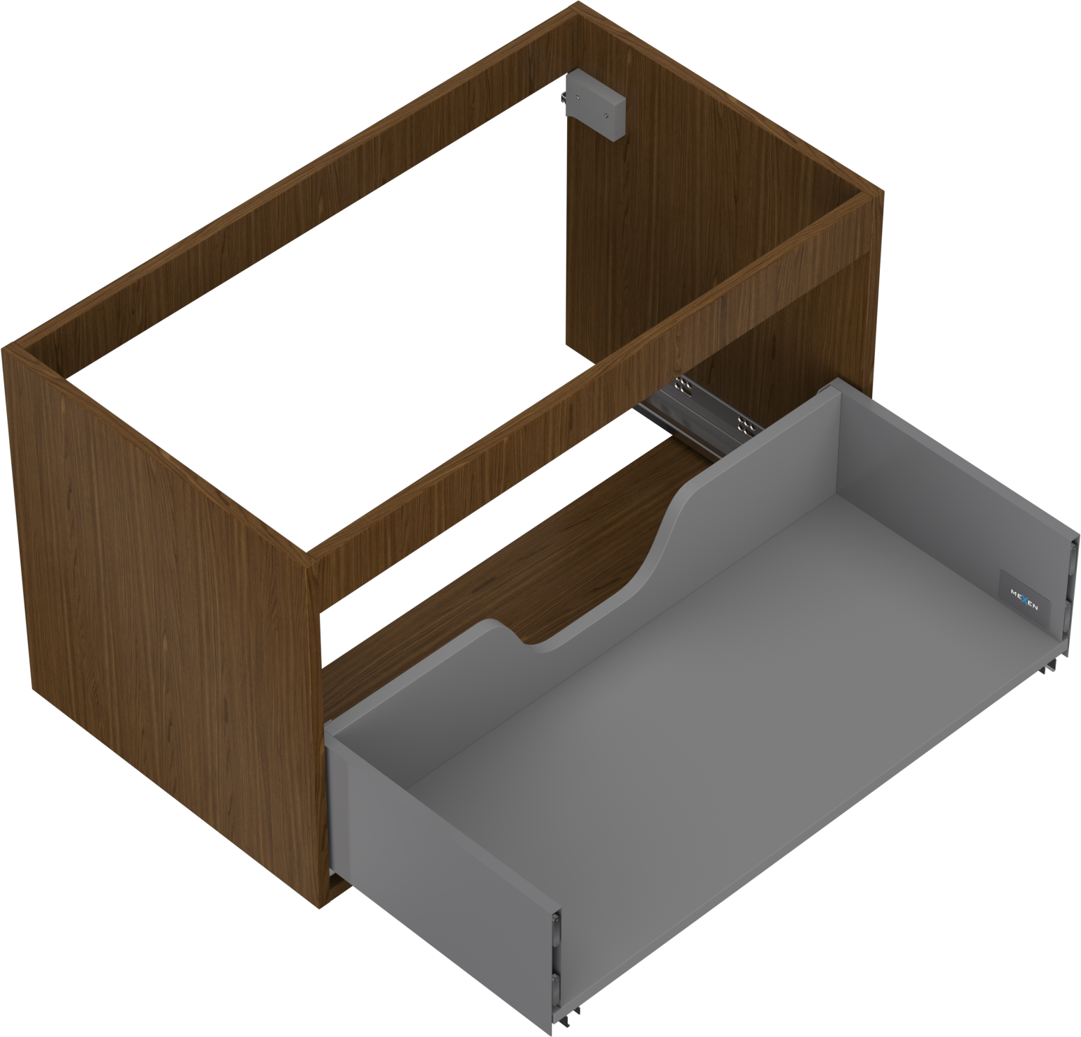 Wycięcie w szufladzie jest zaprojektowane w taki sposób, aby pomieścić syfon, który jest niezbędny w instalacjach umywalkowych. Dzięki temu mebel może być zamontowany w pełni funkcjonalnie, bez konieczności rezygnowania z przestrzeni w szufladzie na rzecz instalacji.