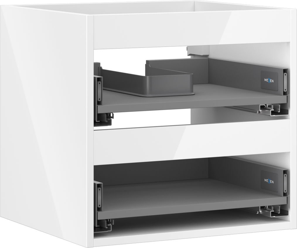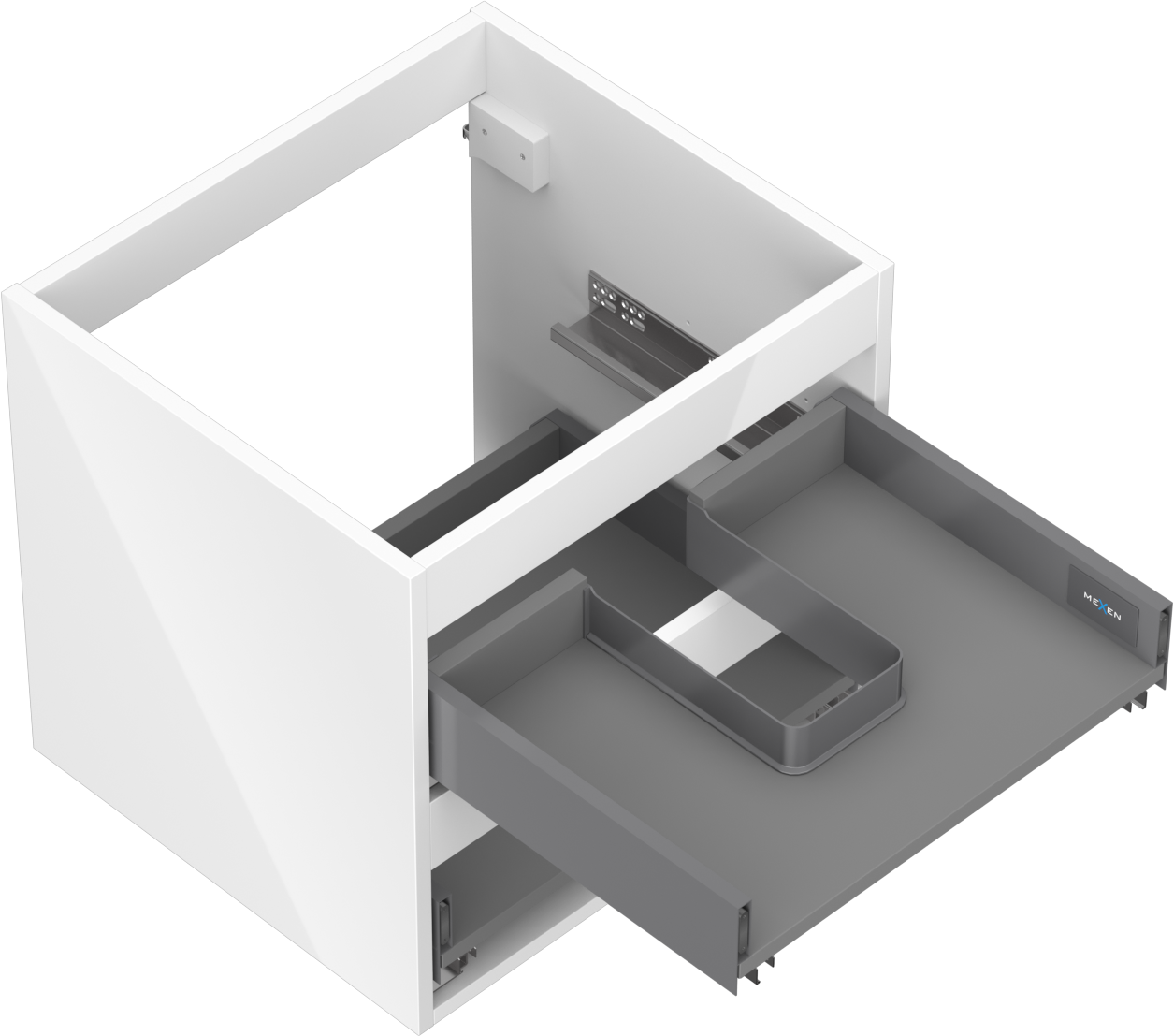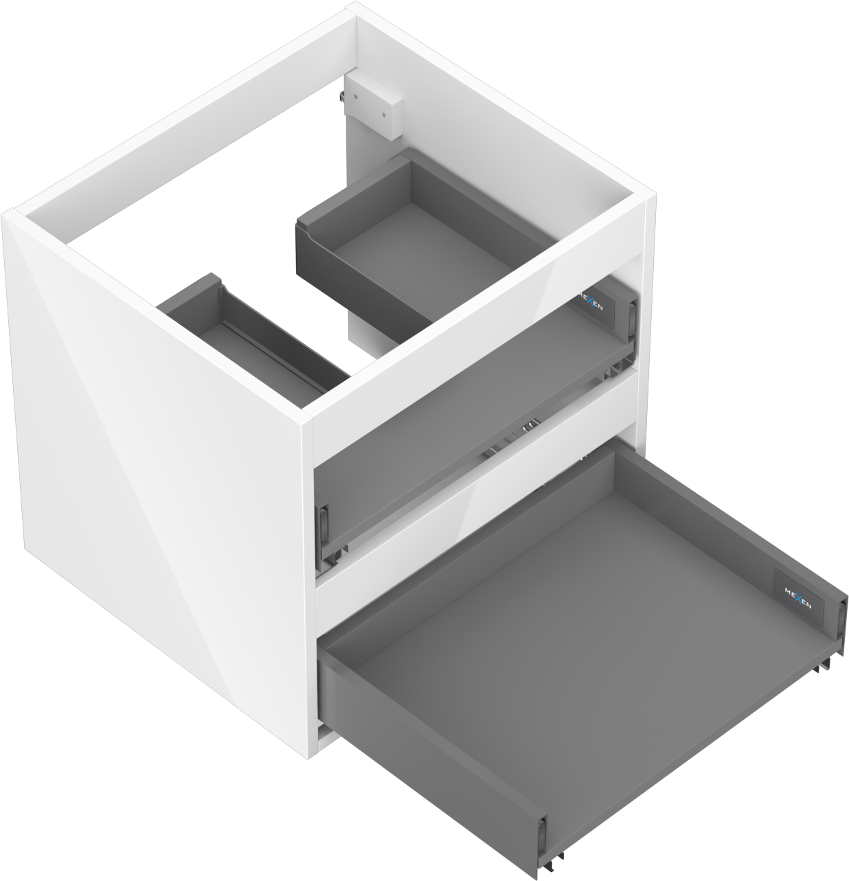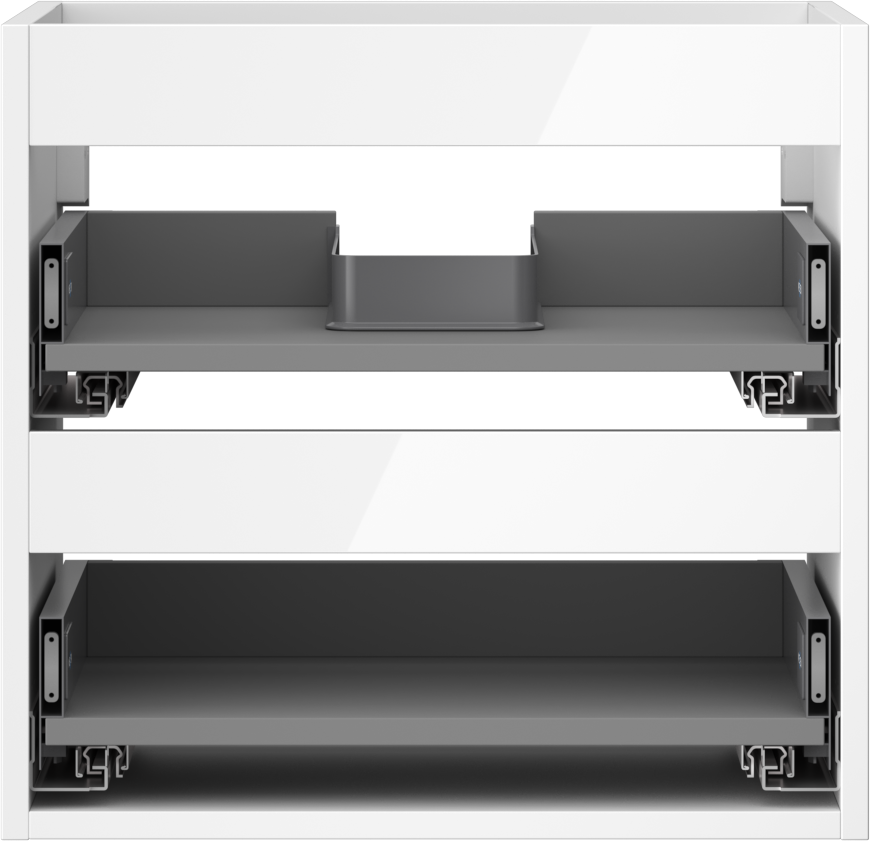 Wycięcie w szufladzie jest zaprojektowane w taki sposób, aby pomieścić syfon, który jest niezbędny w instalacjach umywalkowych. Dzięki temu mebel może być zamontowany w pełni funkcjonalnie, bez konieczności rezygnowania z przestrzeni w szufladzie na rzecz instalacji.