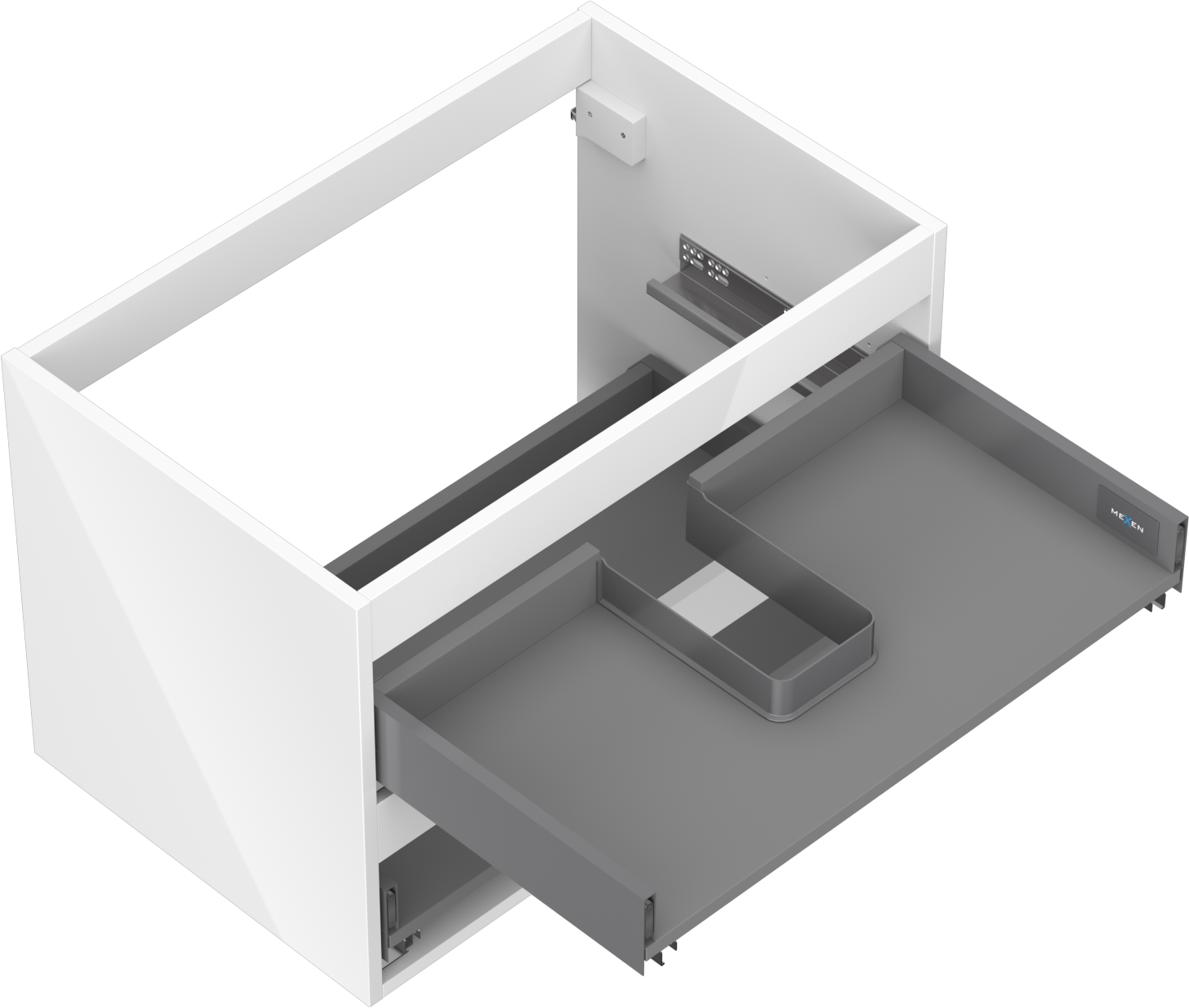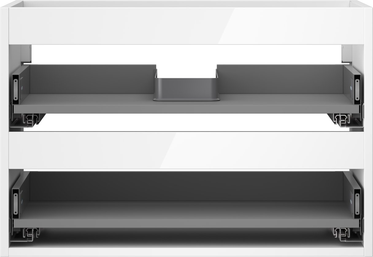 Wycięcie w szufladzie jest zaprojektowane w taki sposób, aby pomieścić syfon, który jest niezbędny w instalacjach umywalkowych. Dzięki temu mebel może być zamontowany w pełni funkcjonalnie, bez konieczności rezygnowania z przestrzeni w szufladzie na rzecz instalacji.
