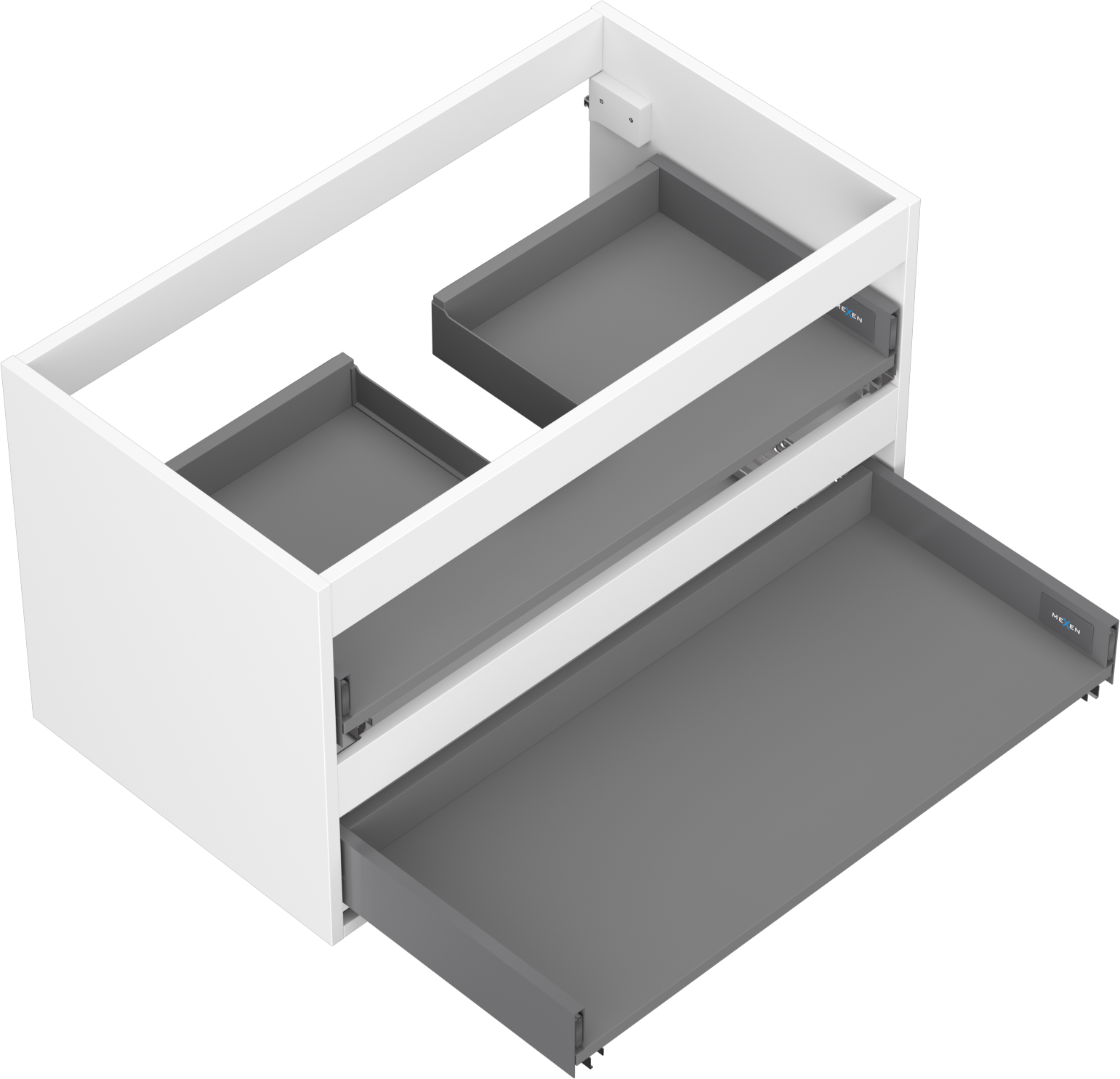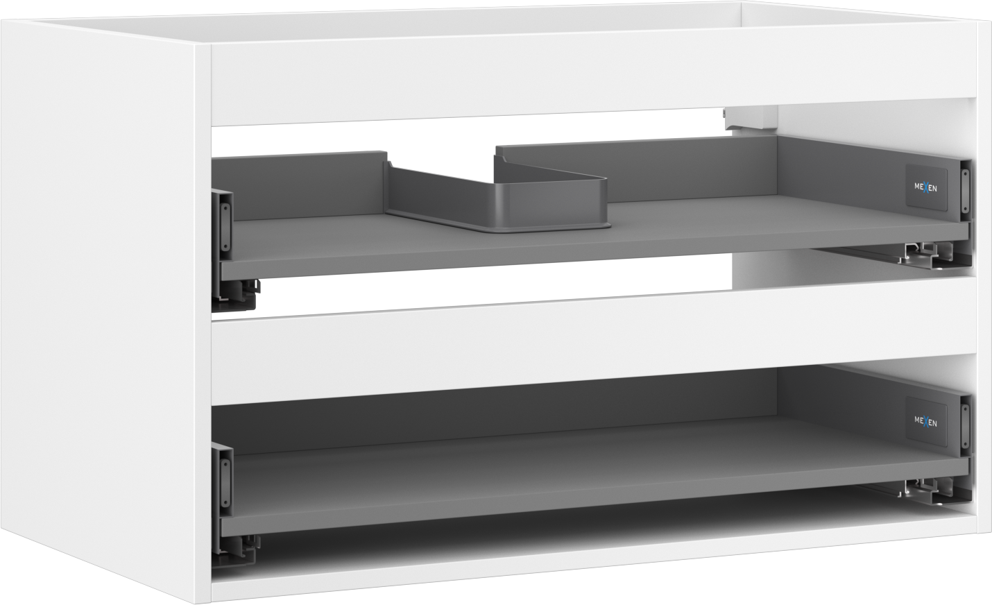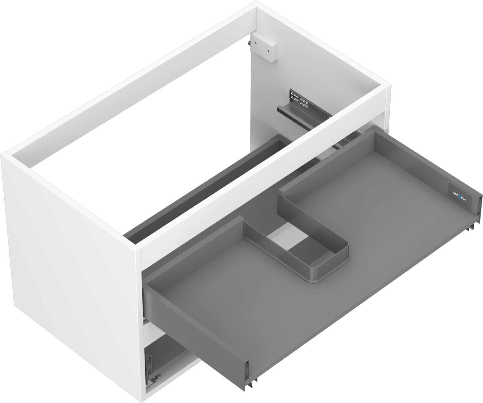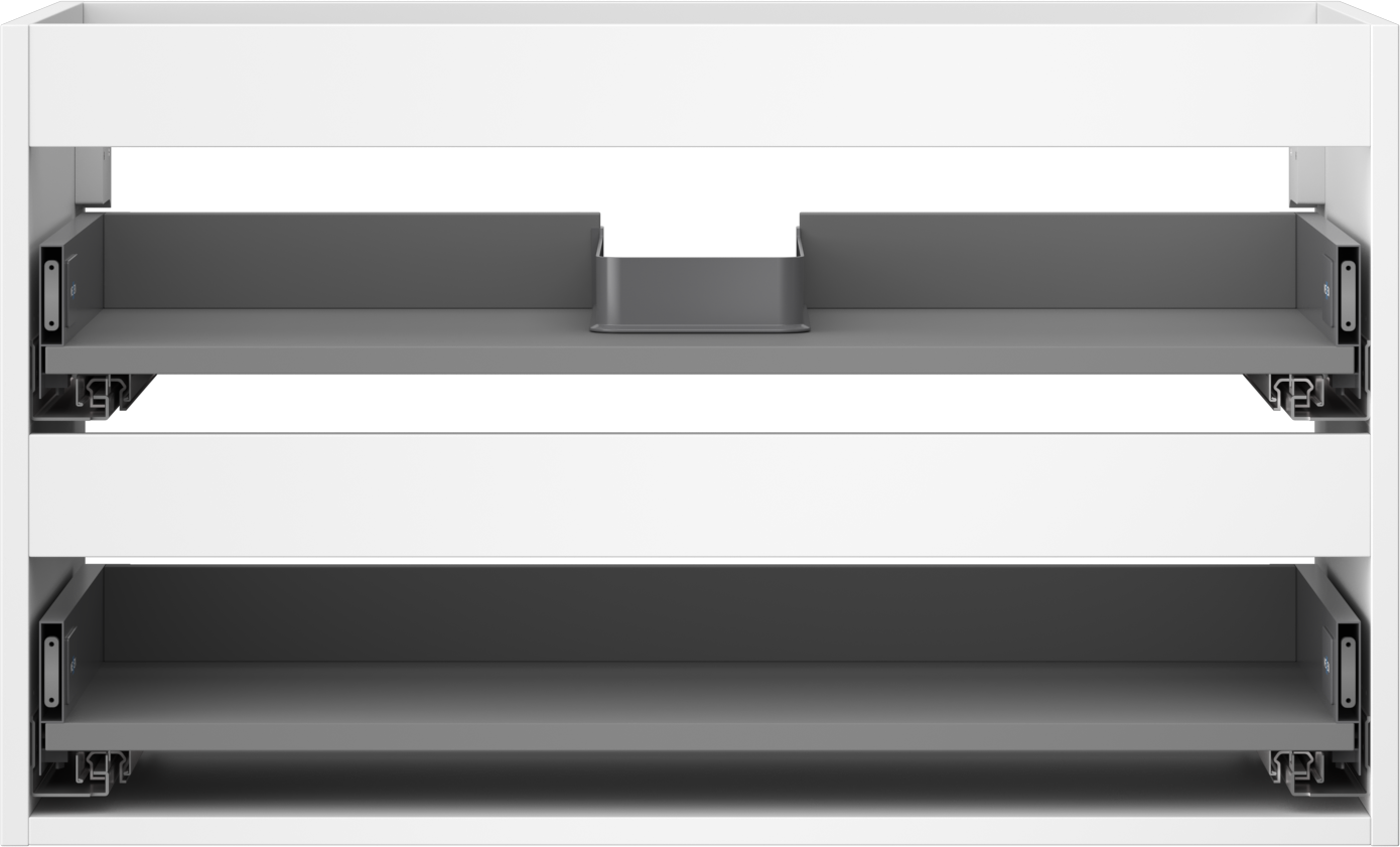 Wycięcie w szufladzie jest zaprojektowane w taki sposób, aby pomieścić syfon, który jest niezbędny w instalacjach umywalkowych. Dzięki temu mebel może być zamontowany w pełni funkcjonalnie, bez konieczności rezygnowania z przestrzeni w szufladzie na rzecz instalacji.