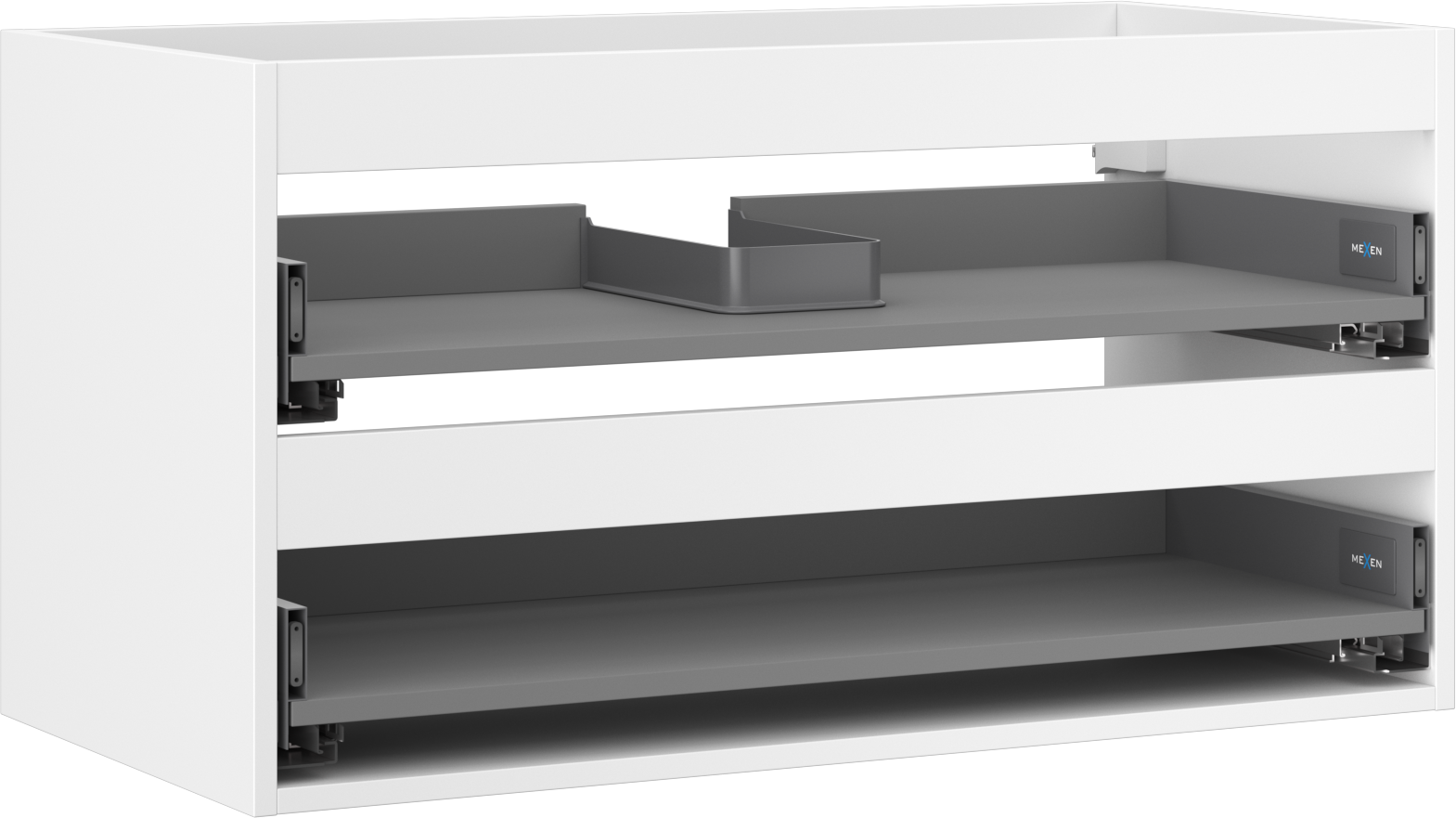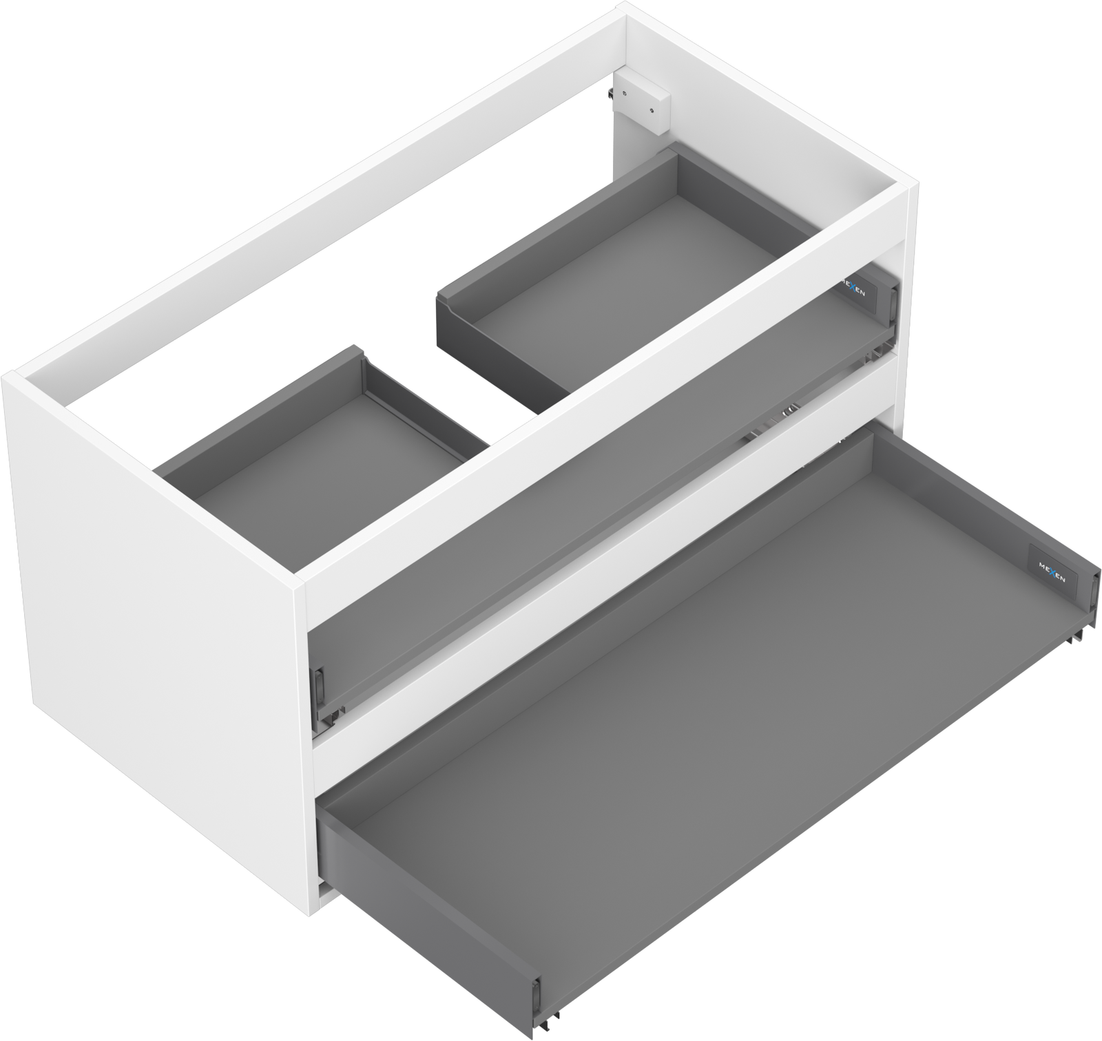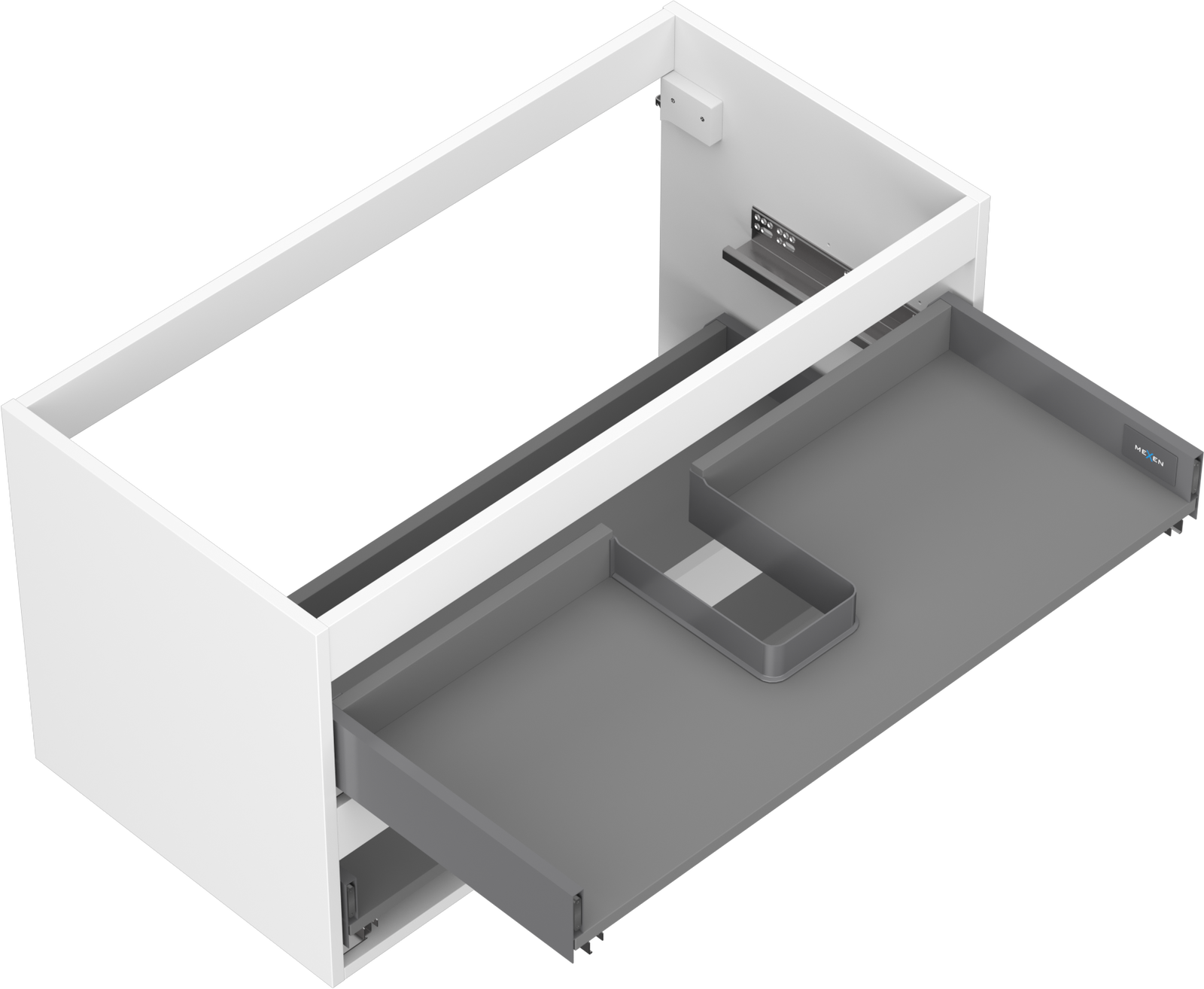 Wycięcie w szufladzie jest zaprojektowane w taki sposób, aby pomieścić syfon, który jest niezbędny w instalacjach umywalkowych. Dzięki temu mebel może być zamontowany w pełni funkcjonalnie, bez konieczności rezygnowania z przestrzeni w szufladzie na rzecz instalacji.