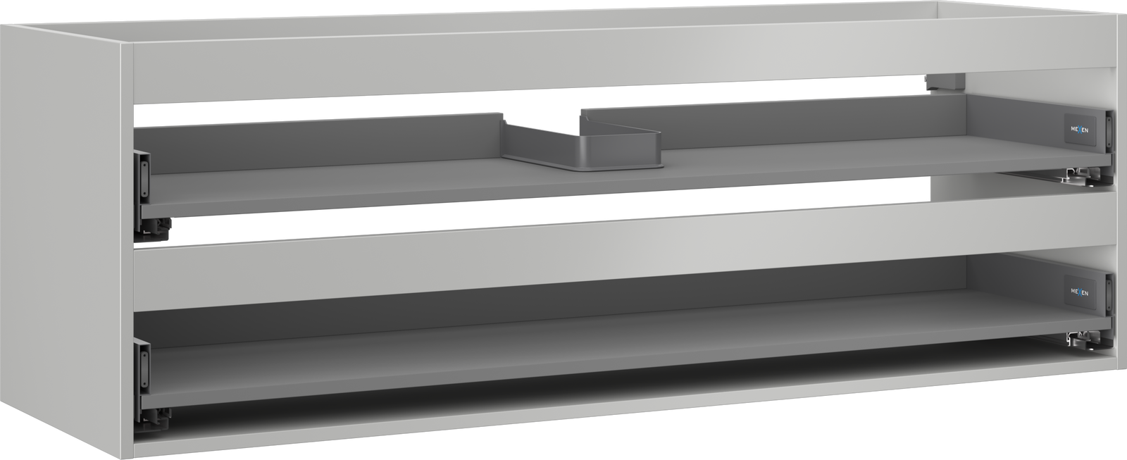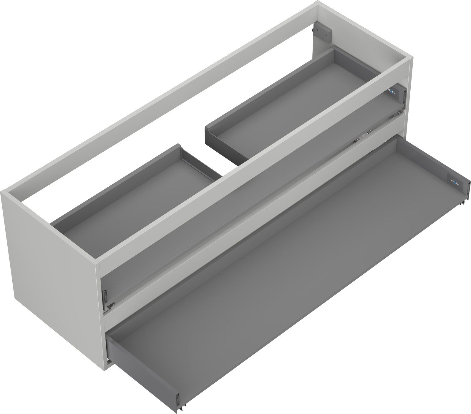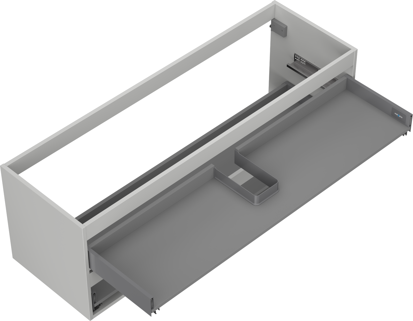Wycięcie w szufladzie jest zaprojektowane w taki sposób, aby pomieścić syfon, który jest niezbędny w instalacjach umywalkowych. Dzięki temu mebel może być zamontowany w pełni funkcjonalnie, bez konieczności rezygnowania z przestrzeni w szufladzie na rzecz instalacji.