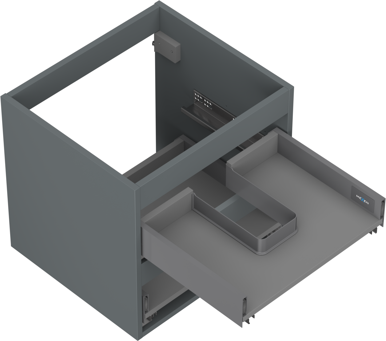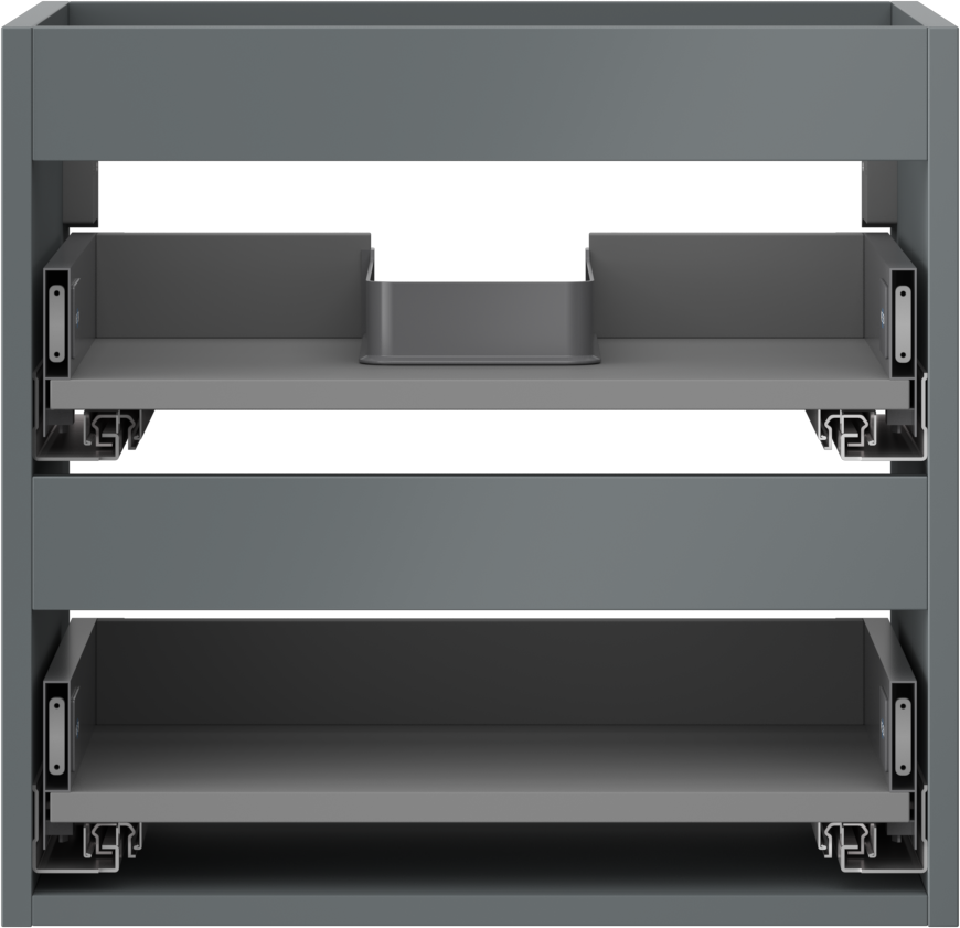 Wycięcie w szufladzie jest zaprojektowane w taki sposób, aby pomieścić syfon, który jest niezbędny w instalacjach umywalkowych. Dzięki temu mebel może być zamontowany w pełni funkcjonalnie, bez konieczności rezygnowania z przestrzeni w szufladzie na rzecz instalacji.