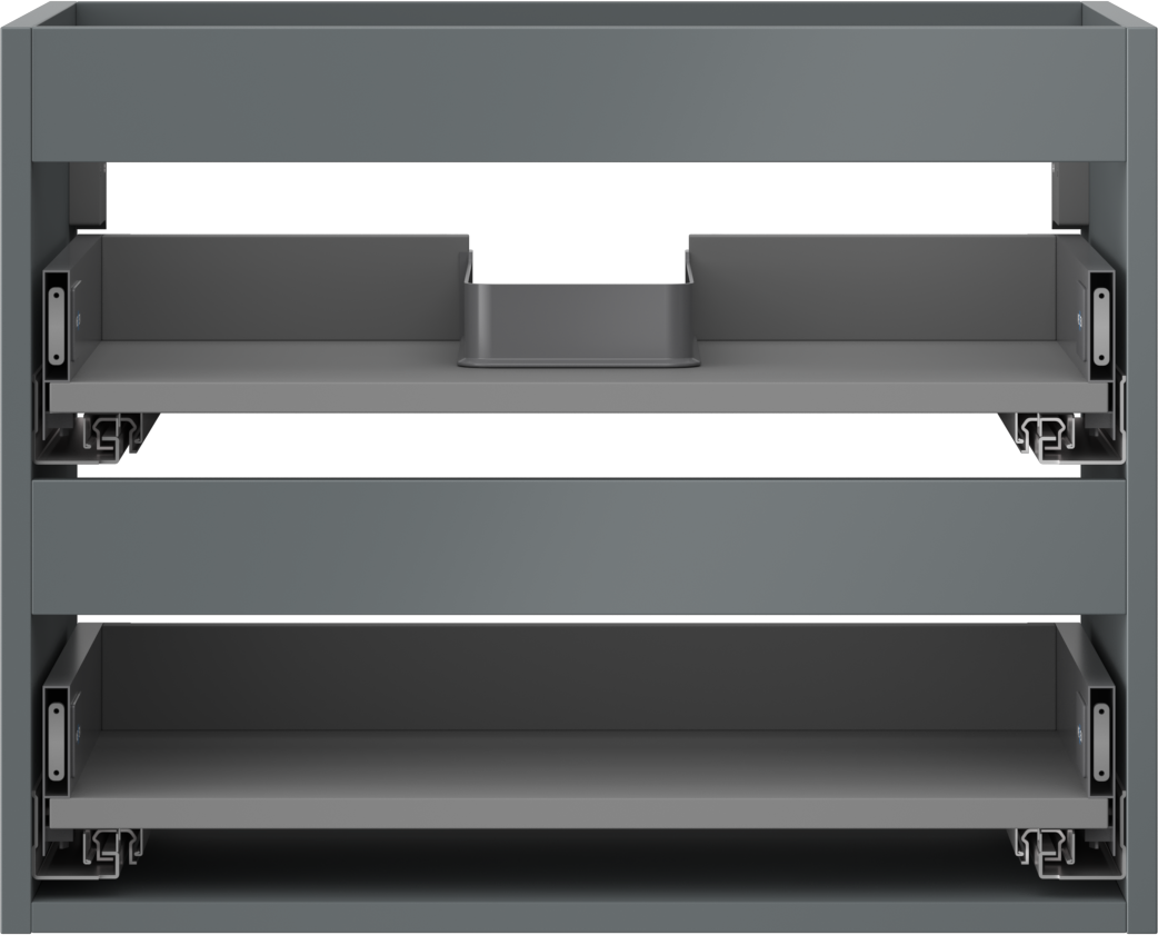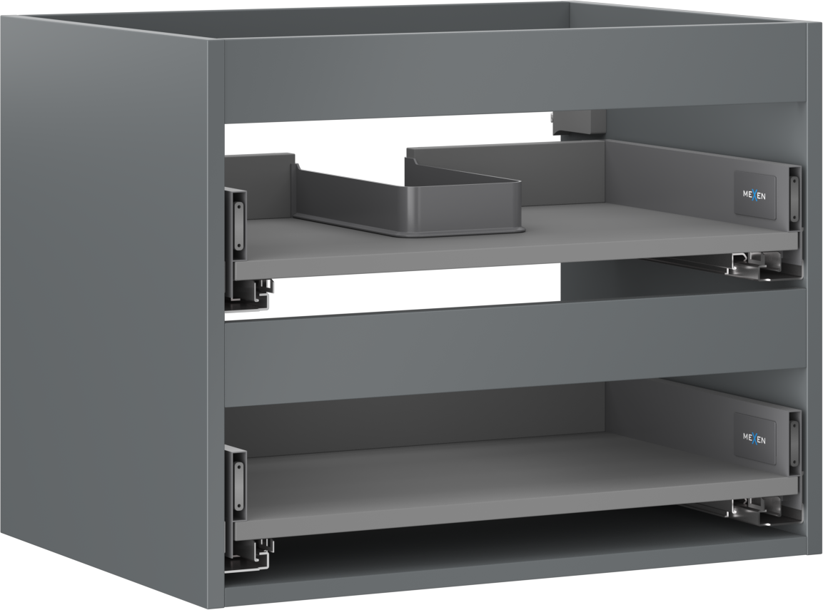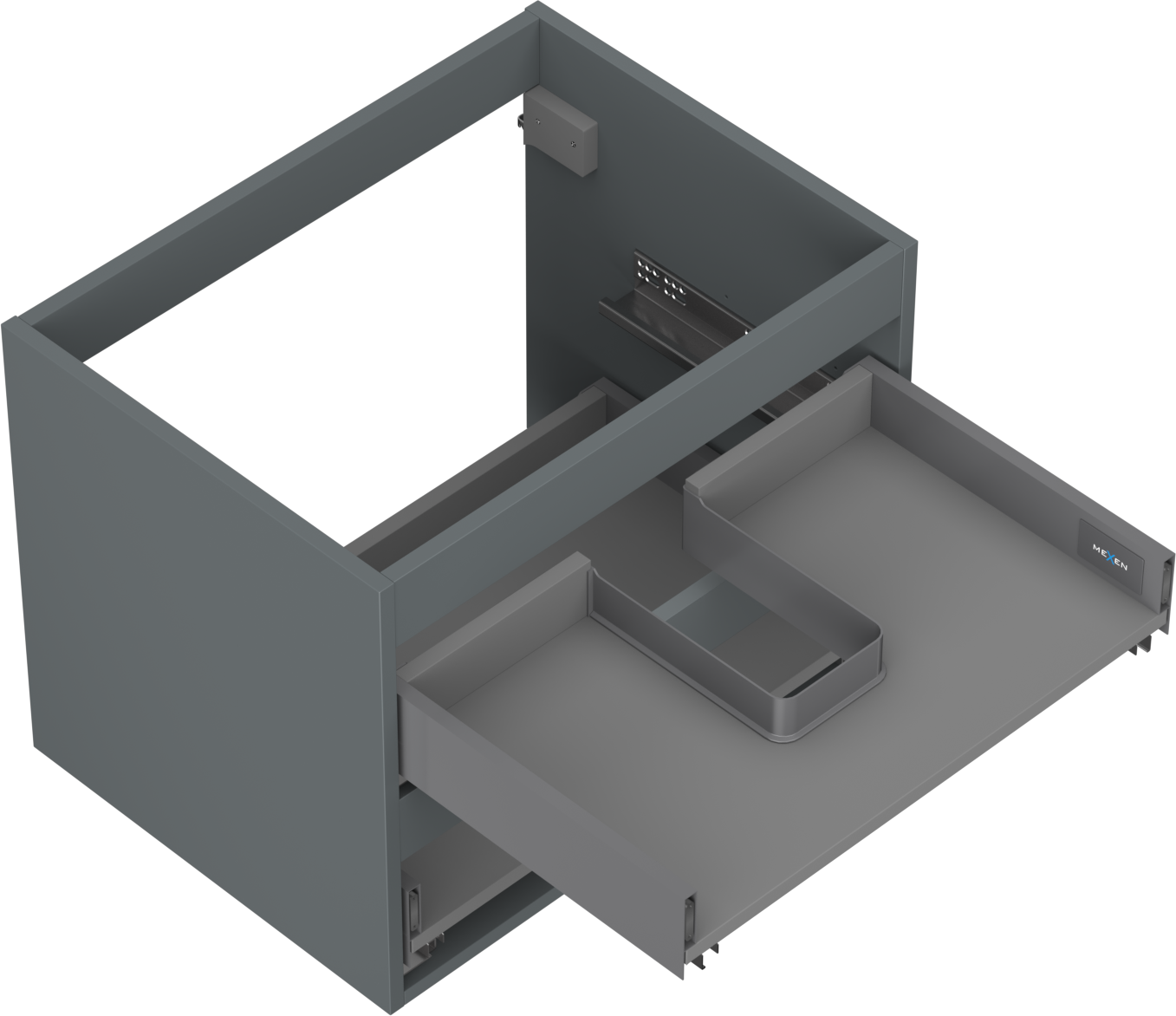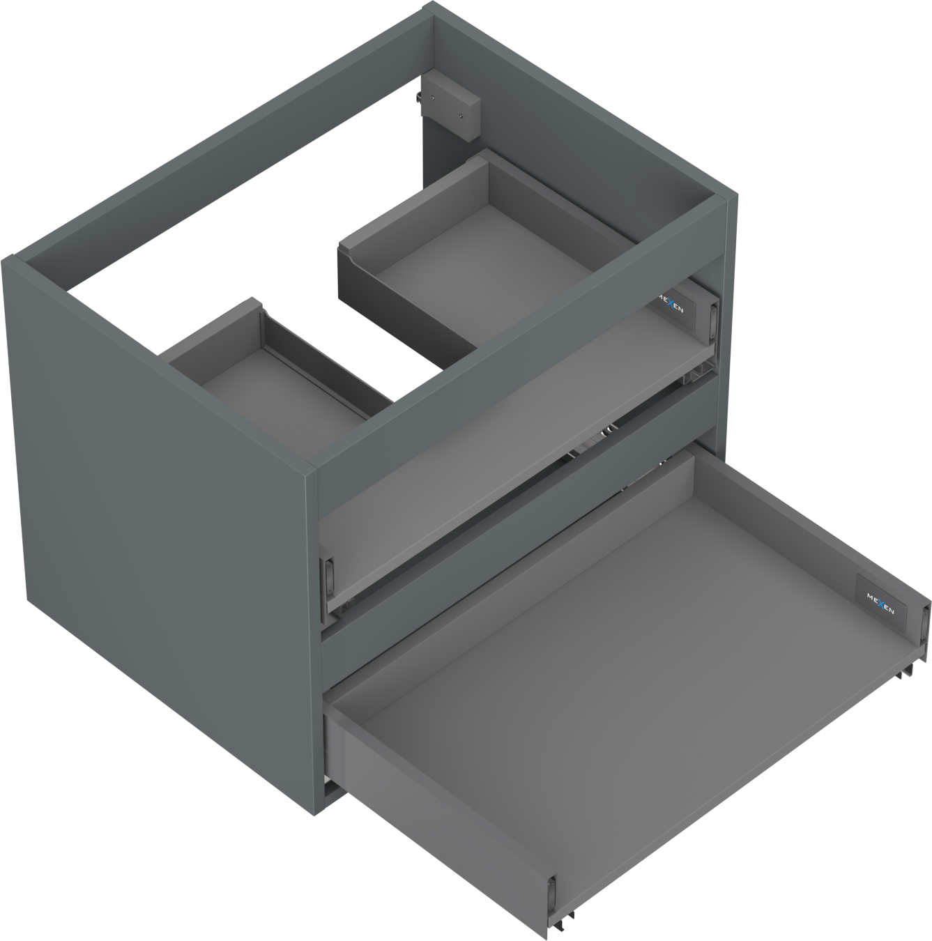 Wycięcie w szufladzie jest zaprojektowane w taki sposób, aby pomieścić syfon, który jest niezbędny w instalacjach umywalkowych. Dzięki temu mebel może być zamontowany w pełni funkcjonalnie, bez konieczności rezygnowania z przestrzeni w szufladzie na rzecz instalacji.