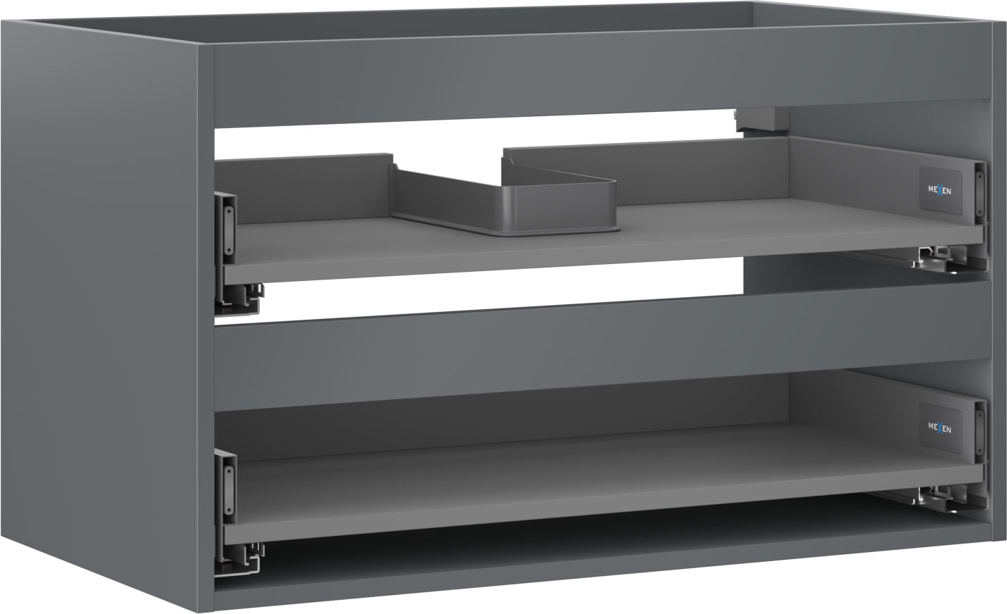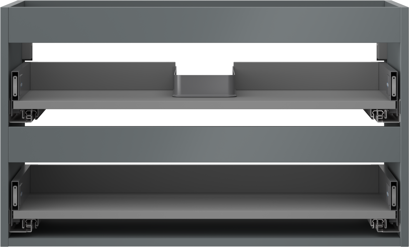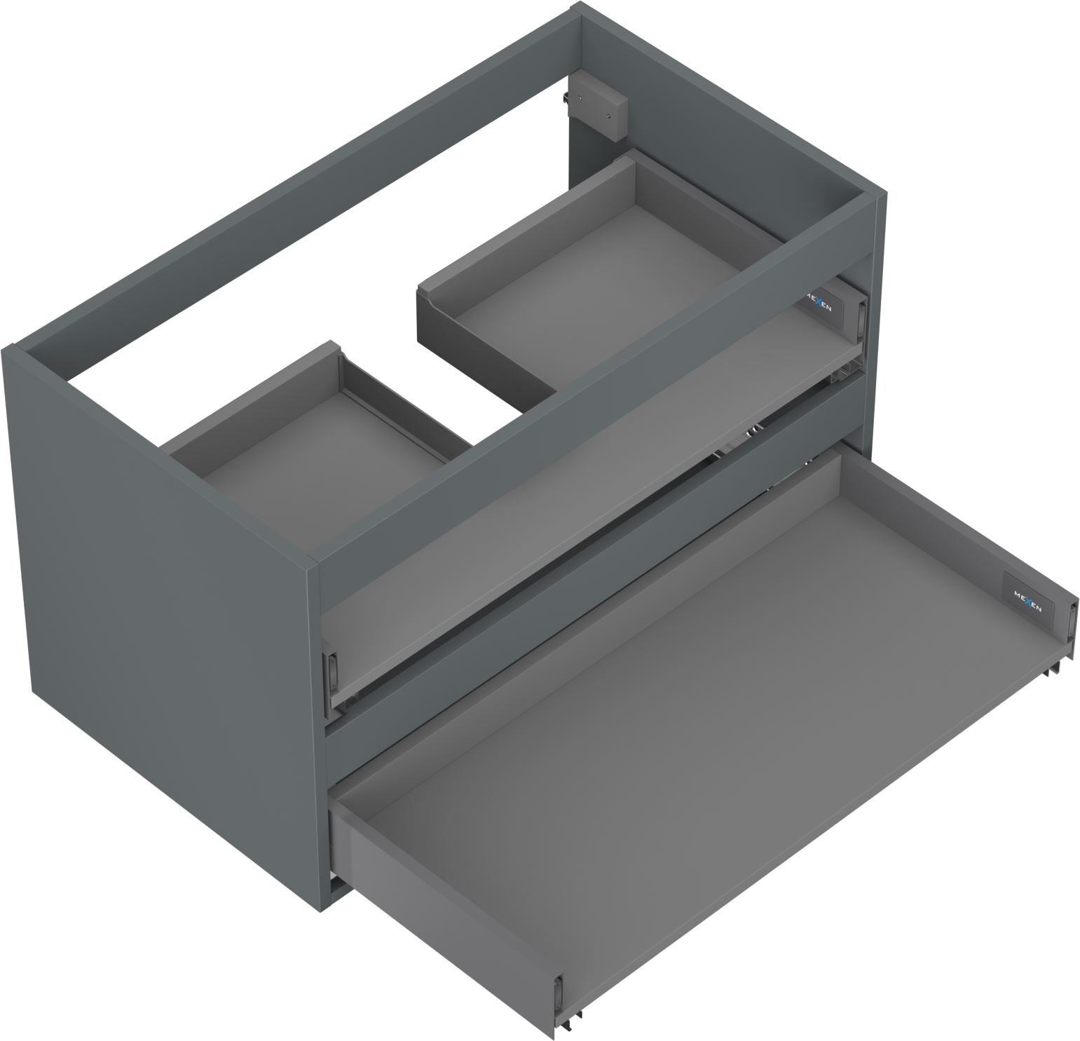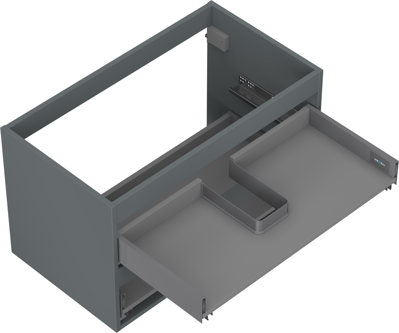 Wycięcie w szufladzie jest zaprojektowane w taki sposób, aby pomieścić syfon, który jest niezbędny w instalacjach umywalkowych. Dzięki temu mebel może być zamontowany w pełni funkcjonalnie, bez konieczności rezygnowania z przestrzeni w szufladzie na rzecz instalacji.