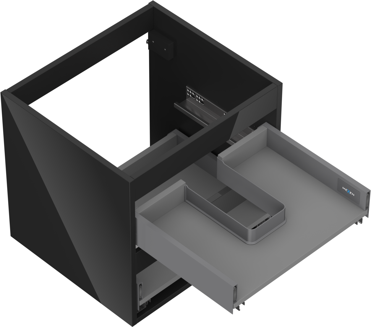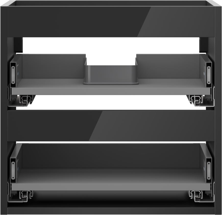 Wycięcie w szufladzie jest zaprojektowane w taki sposób, aby pomieścić syfon, który jest niezbędny w instalacjach umywalkowych. Dzięki temu mebel może być zamontowany w pełni funkcjonalnie, bez konieczności rezygnowania z przestrzeni w szufladzie na rzecz instalacji.