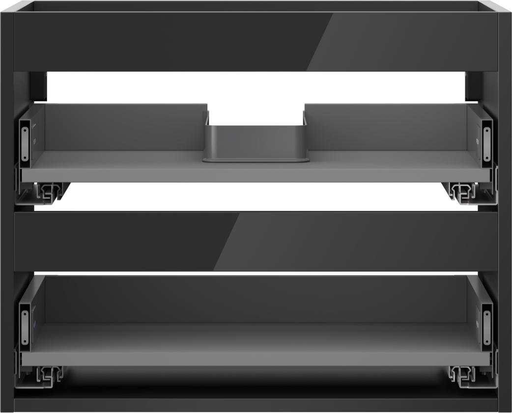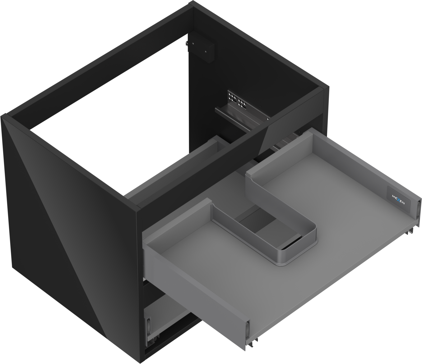 Wycięcie w szufladzie jest zaprojektowane w taki sposób, aby pomieścić syfon, który jest niezbędny w instalacjach umywalkowych. Dzięki temu mebel może być zamontowany w pełni funkcjonalnie, bez konieczności rezygnowania z przestrzeni w szufladzie na rzecz instalacji.