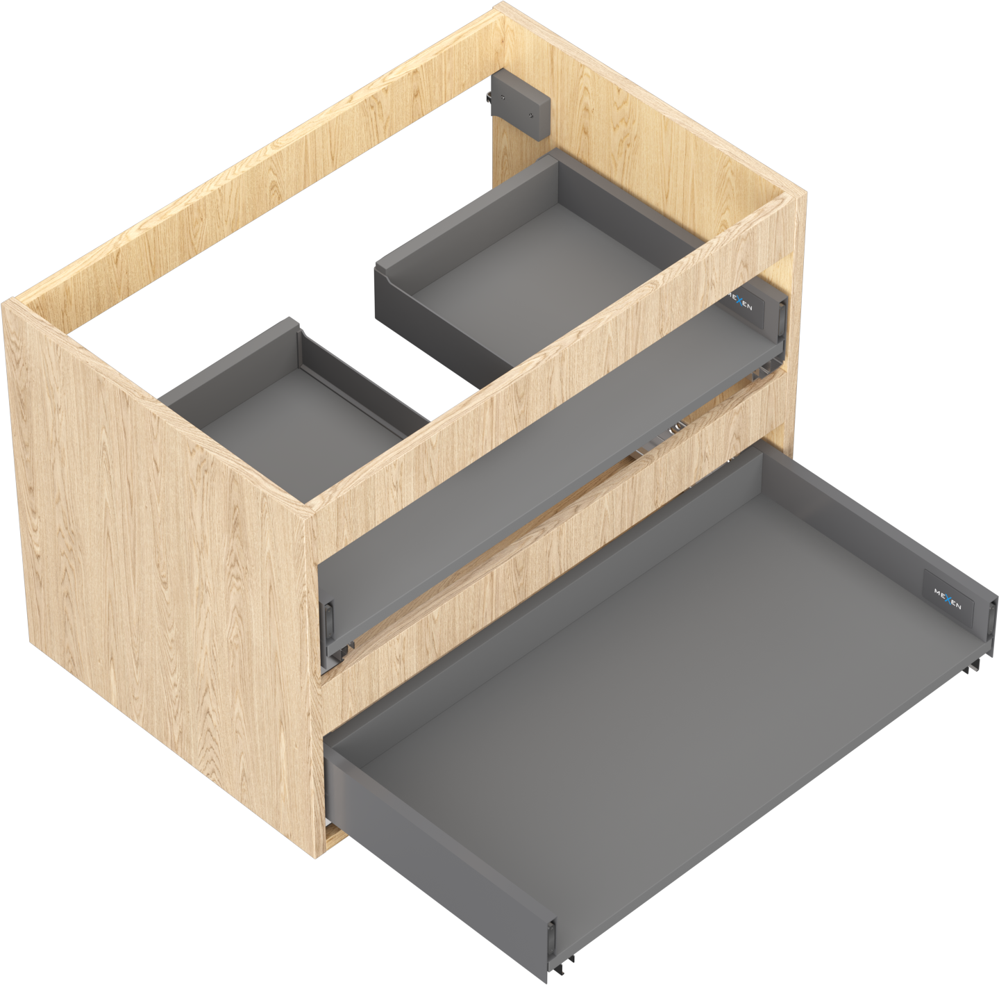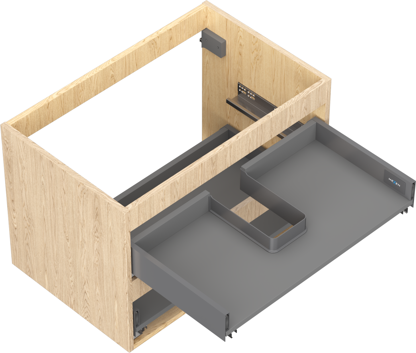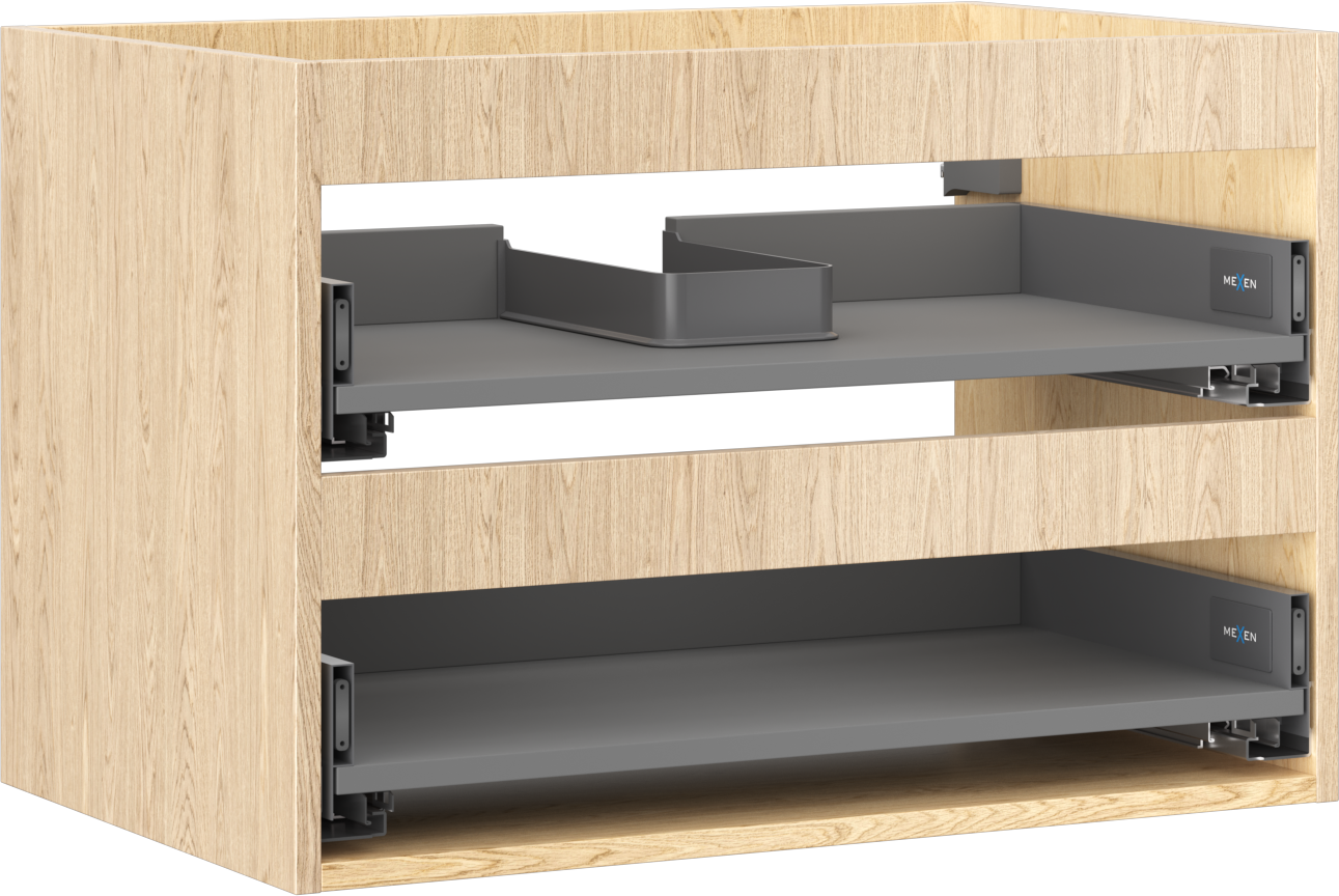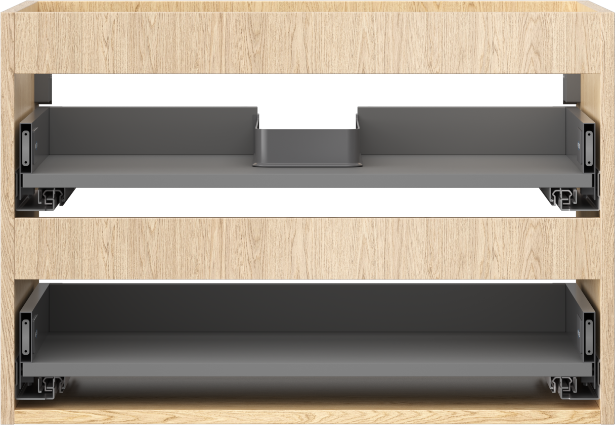 Wycięcie w szufladzie jest zaprojektowane w taki sposób, aby pomieścić syfon, który jest niezbędny w instalacjach umywalkowych. Dzięki temu mebel może być zamontowany w pełni funkcjonalnie, bez konieczności rezygnowania z przestrzeni w szufladzie na rzecz instalacji.