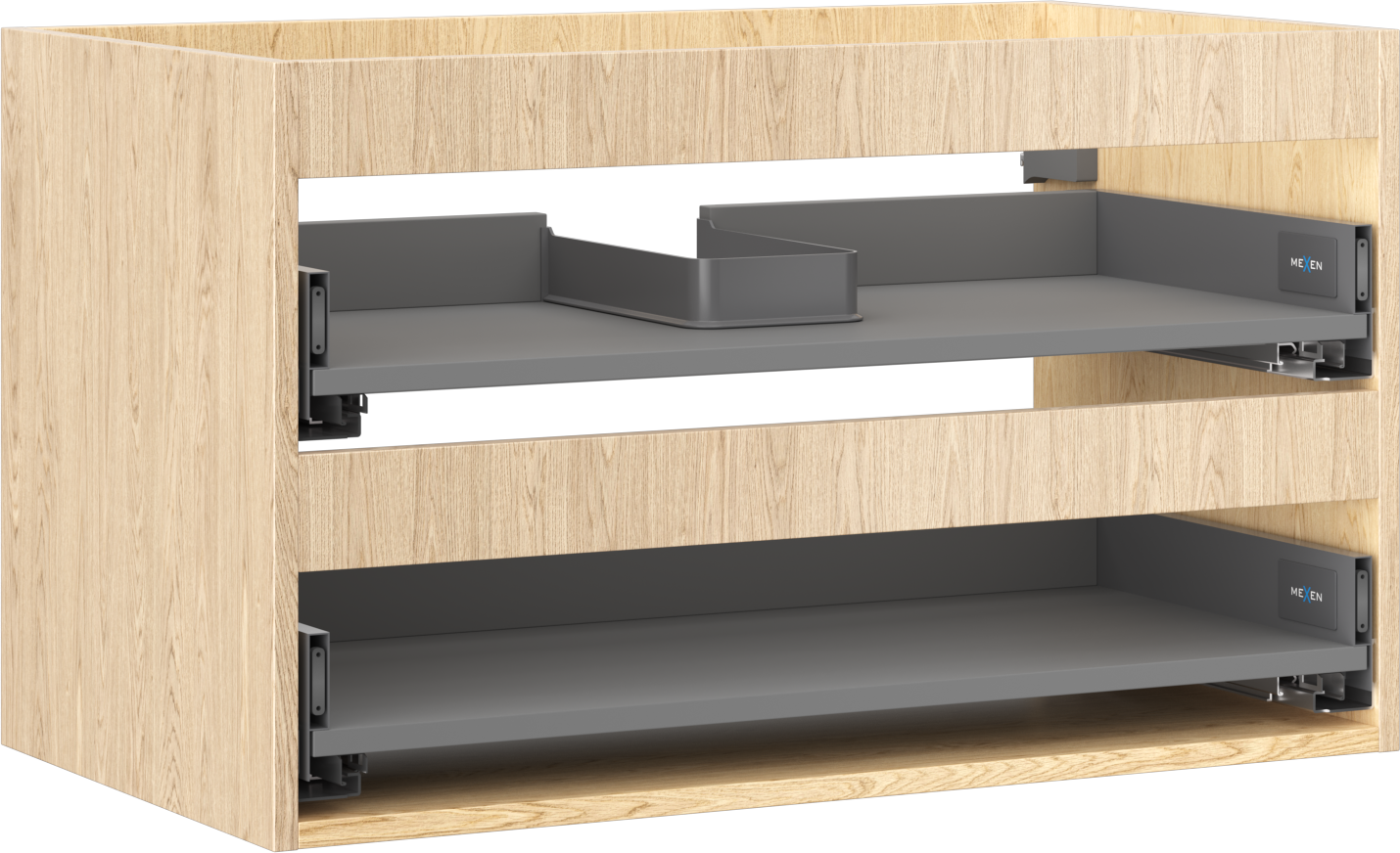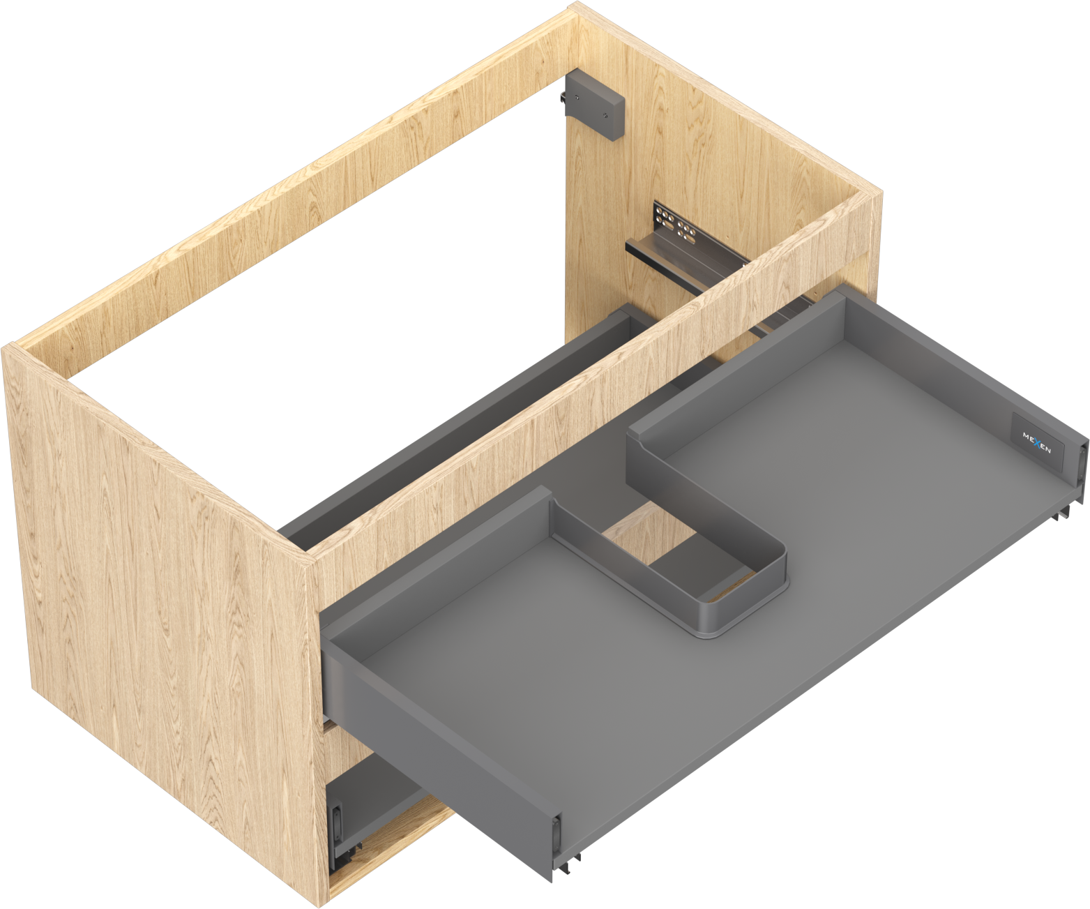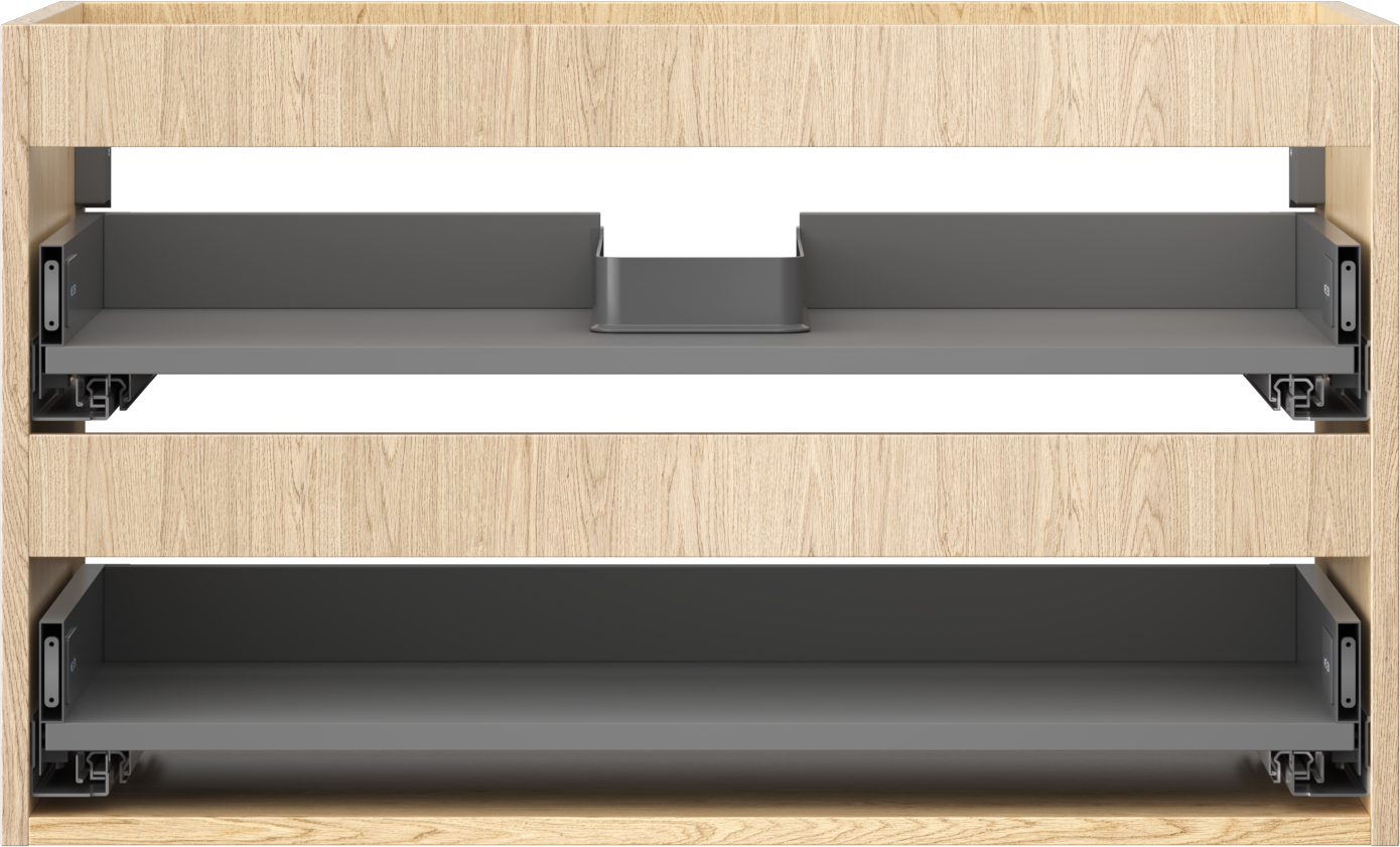 Wycięcie w szufladzie jest zaprojektowane w taki sposób, aby pomieścić syfon, który jest niezbędny w instalacjach umywalkowych. Dzięki temu mebel może być zamontowany w pełni funkcjonalnie, bez konieczności rezygnowania z przestrzeni w szufladzie na rzecz instalacji.