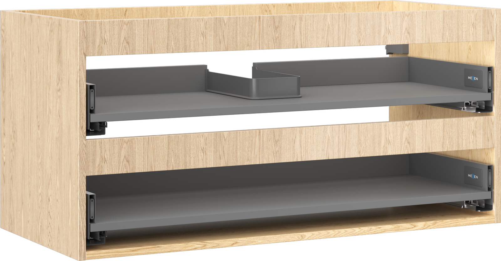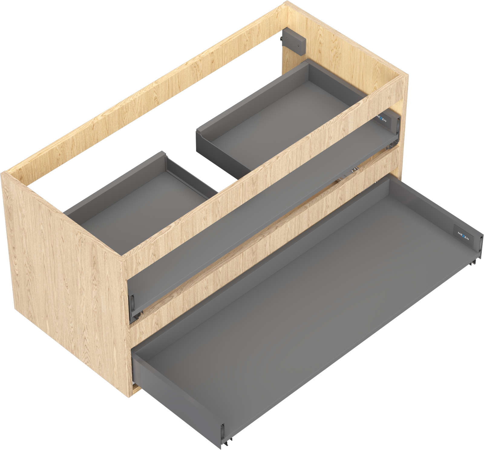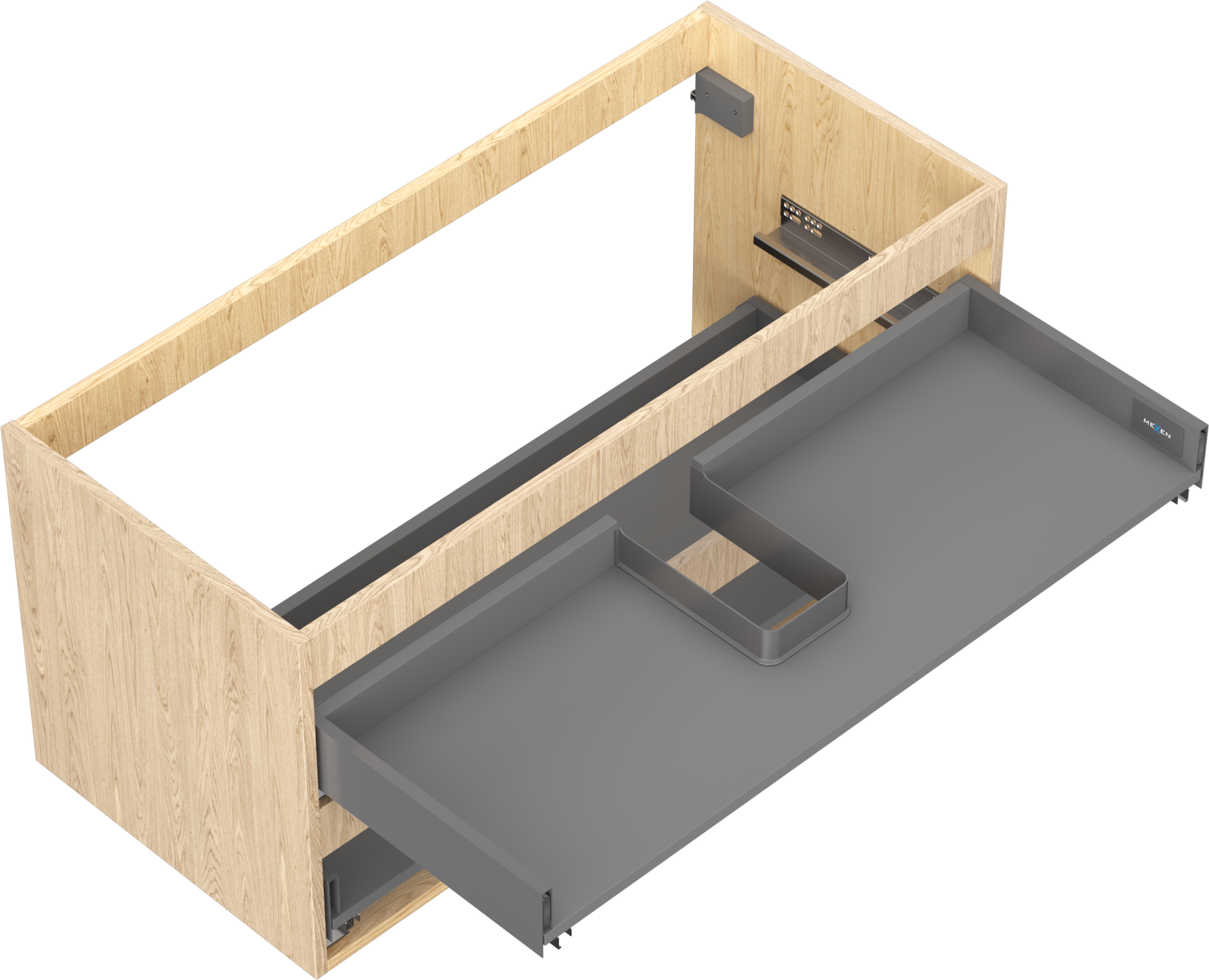 Wycięcie w szufladzie jest zaprojektowane w taki sposób, aby pomieścić syfon, który jest niezbędny w instalacjach umywalkowych. Dzięki temu mebel może być zamontowany w pełni funkcjonalnie, bez konieczności rezygnowania z przestrzeni w szufladzie na rzecz instalacji.