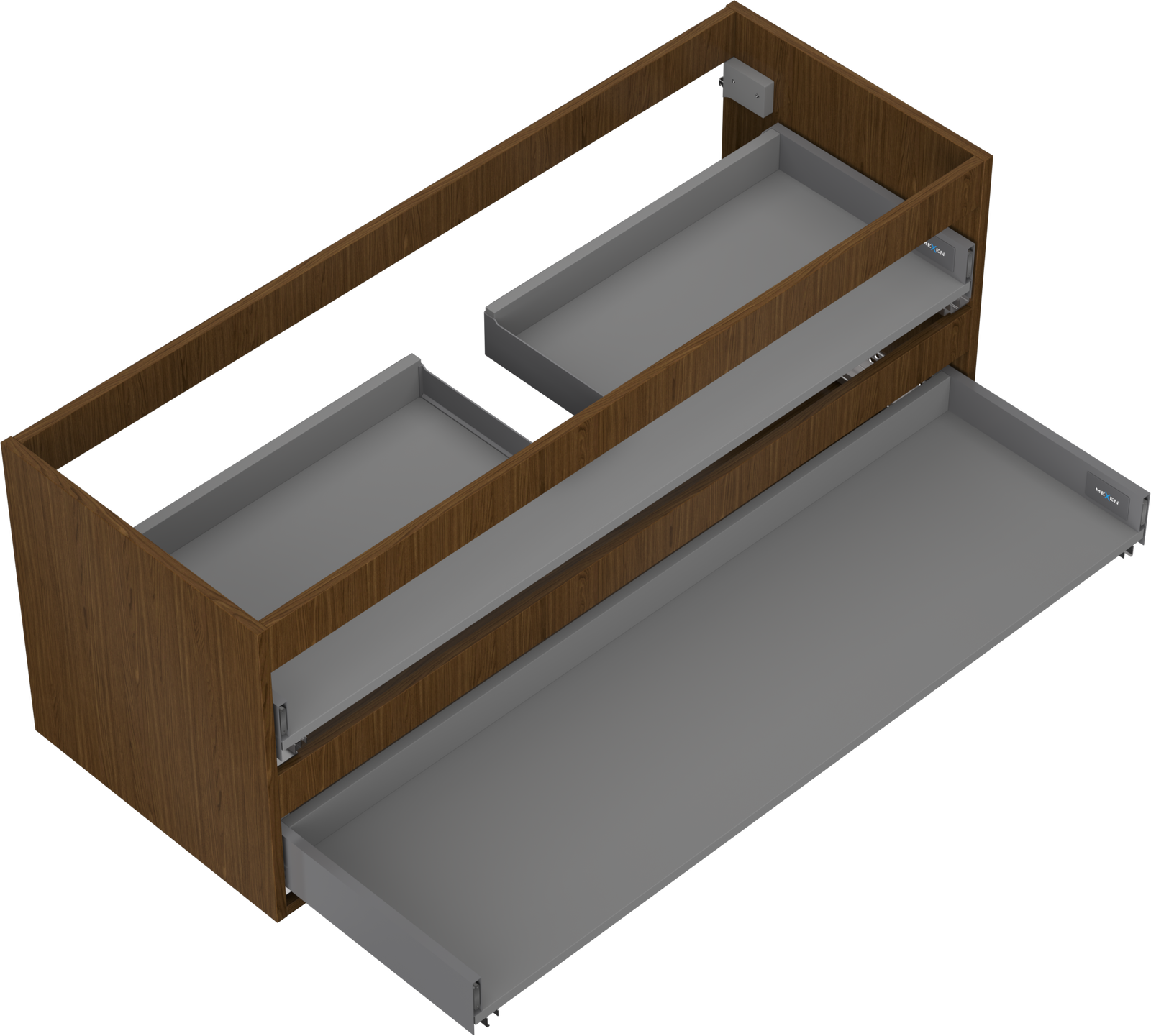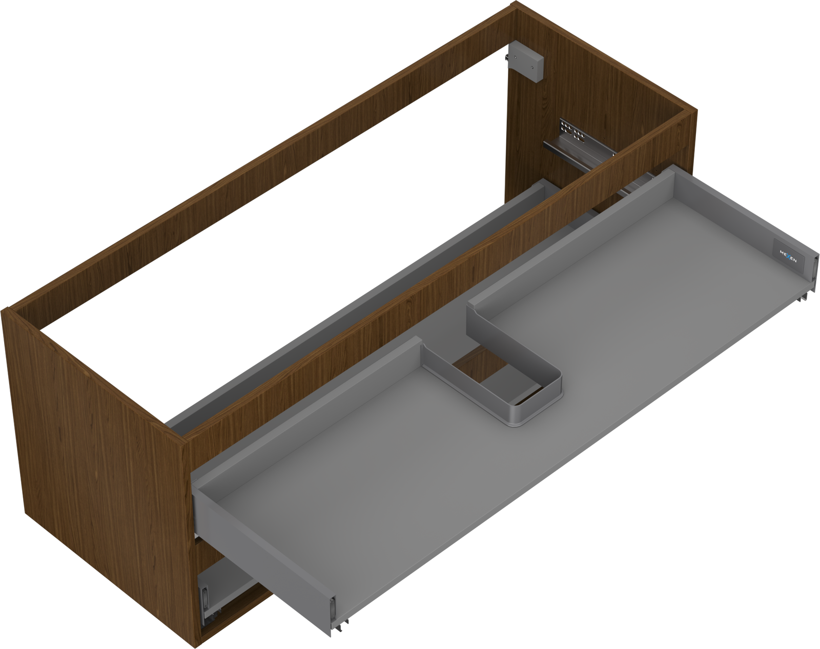 Wycięcie w szufladzie jest zaprojektowane w taki sposób, aby pomieścić syfon, który jest niezbędny w instalacjach umywalkowych. Dzięki temu mebel może być zamontowany w pełni funkcjonalnie, bez konieczności rezygnowania z przestrzeni w szufladzie na rzecz instalacji.