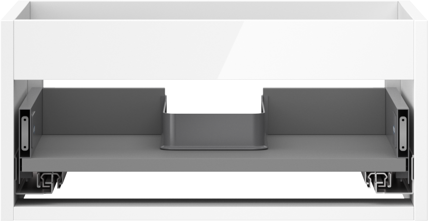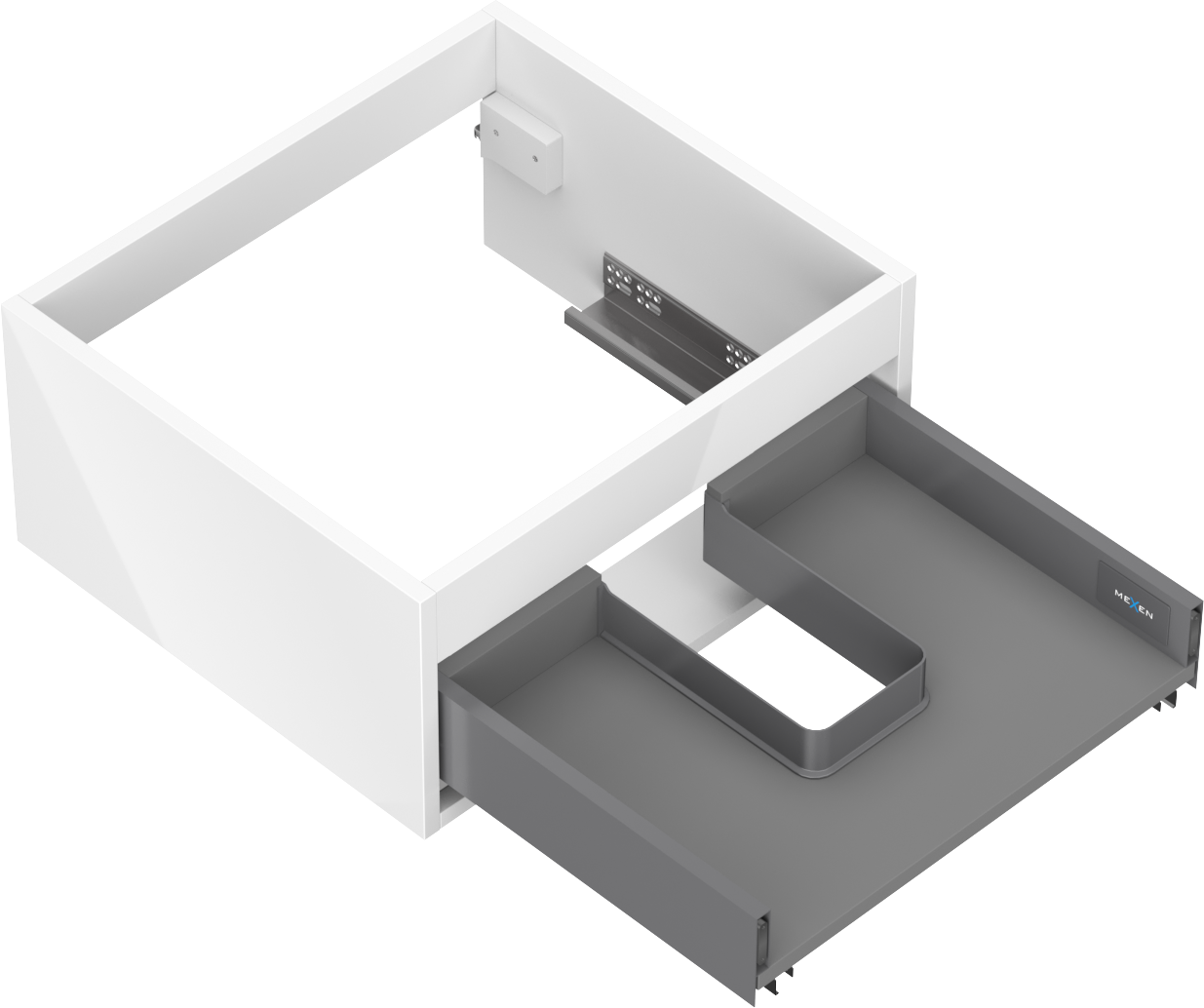 Wycięcie w szufladzie jest zaprojektowane w taki sposób, aby pomieścić syfon, który jest niezbędny w instalacjach umywalkowych. Dzięki temu mebel może być zamontowany w pełni funkcjonalnie, bez konieczności rezygnowania z przestrzeni w szufladzie na rzecz instalacji.