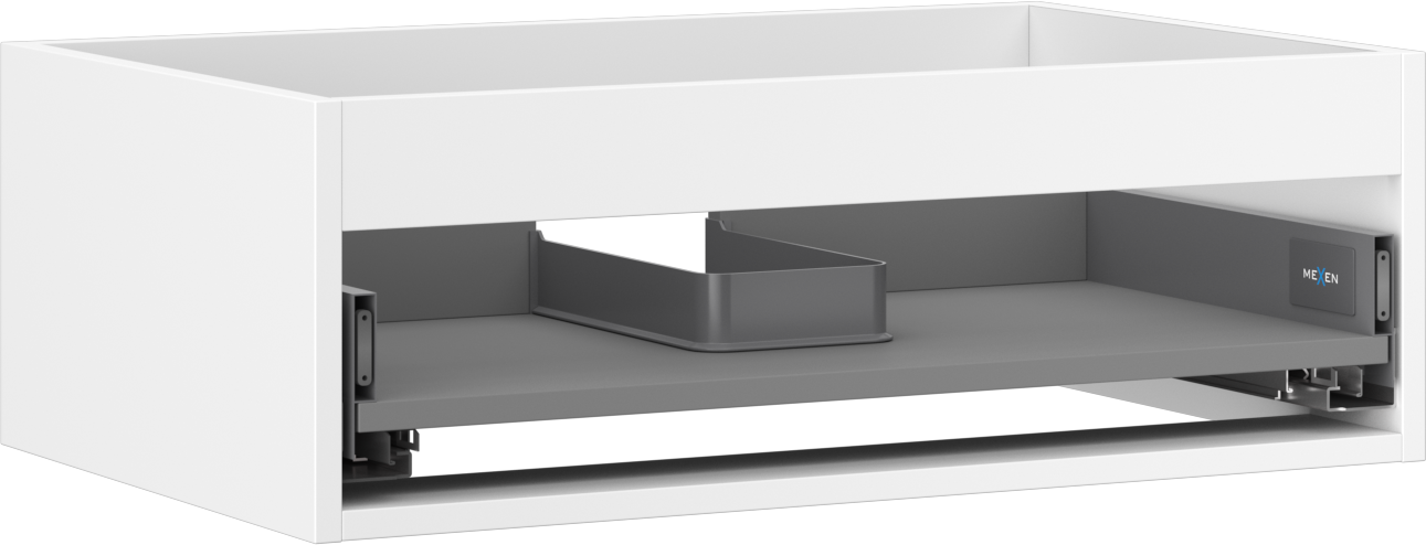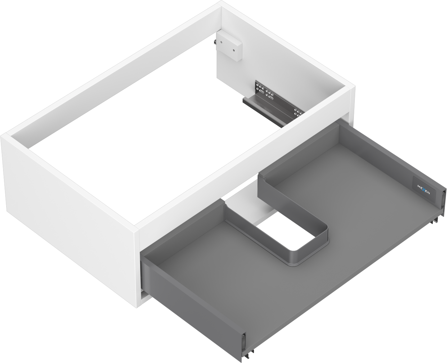 Wycięcie w szufladzie jest zaprojektowane w taki sposób, aby pomieścić syfon, który jest niezbędny w instalacjach umywalkowych. Dzięki temu mebel może być zamontowany w pełni funkcjonalnie, bez konieczności rezygnowania z przestrzeni w szufladzie na rzecz instalacji.
