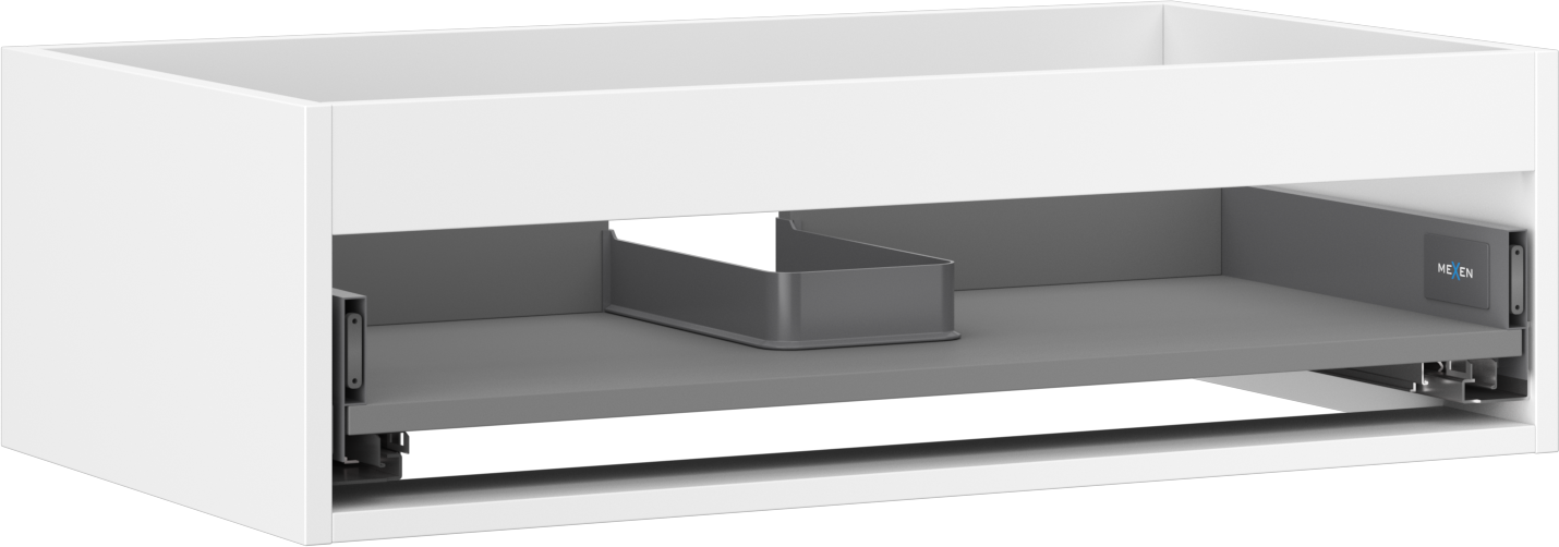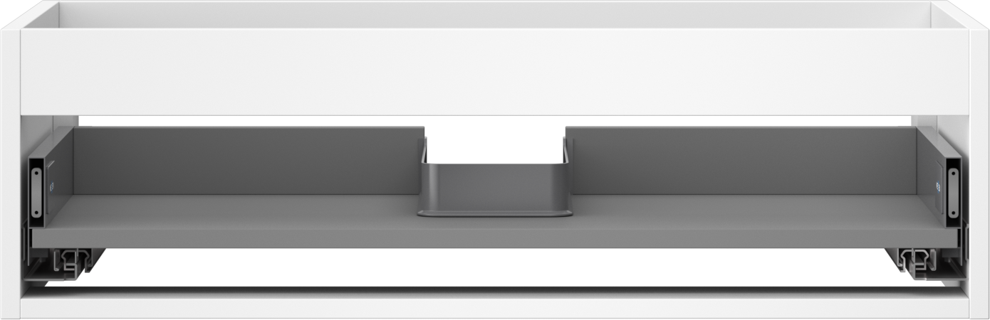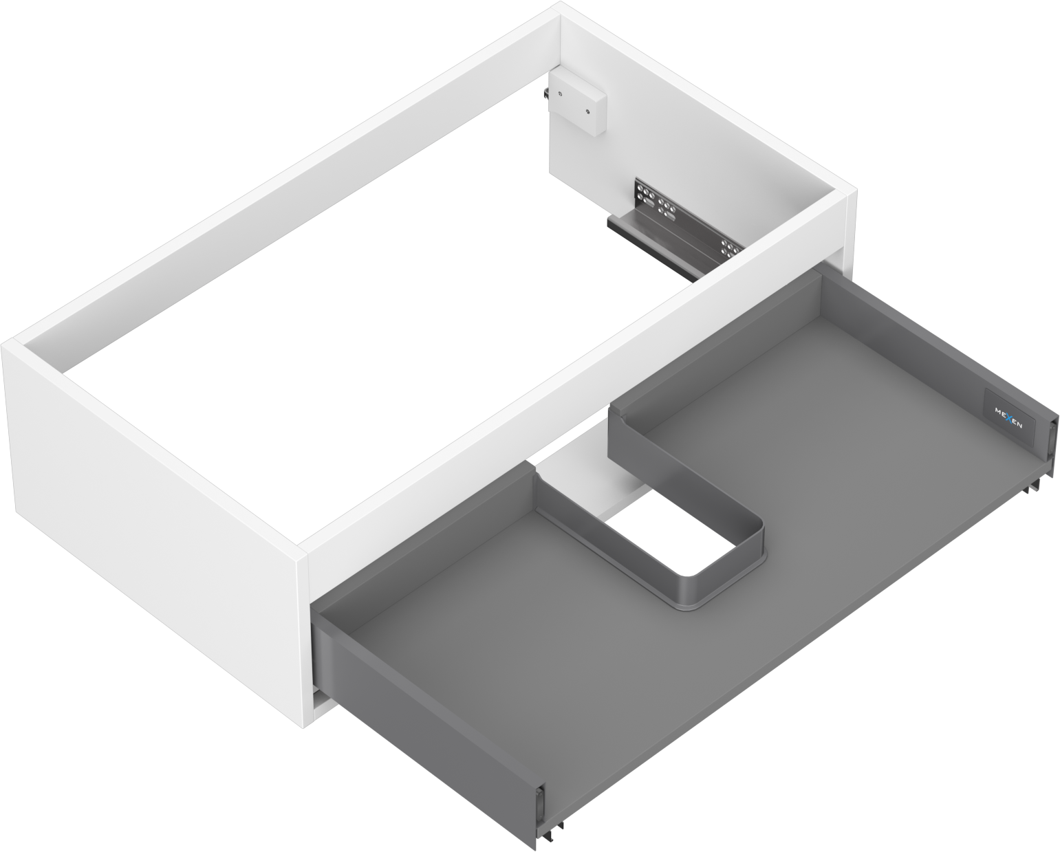 Wycięcie w szufladzie jest zaprojektowane w taki sposób, aby pomieścić syfon, który jest niezbędny w instalacjach umywalkowych. Dzięki temu mebel może być zamontowany w pełni funkcjonalnie, bez konieczności rezygnowania z przestrzeni w szufladzie na rzecz instalacji.