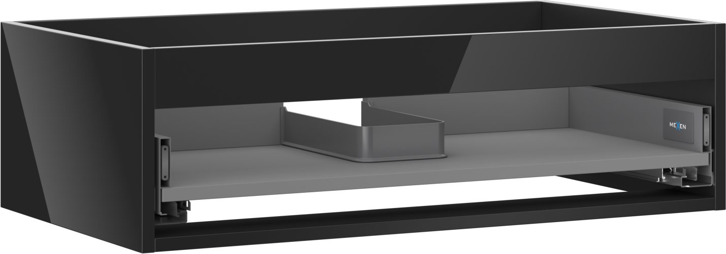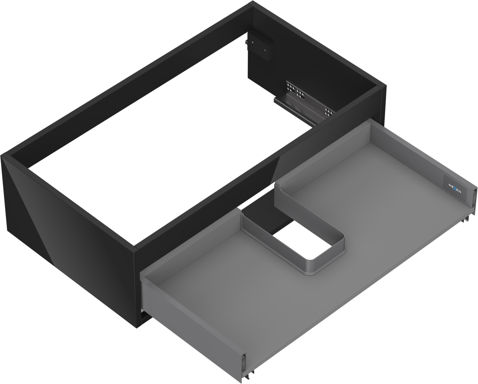 Wycięcie w szufladzie jest zaprojektowane w taki sposób, aby pomieścić syfon, który jest niezbędny w instalacjach umywalkowych. Dzięki temu mebel może być zamontowany w pełni funkcjonalnie, bez konieczności rezygnowania z przestrzeni w szufladzie na rzecz instalacji.