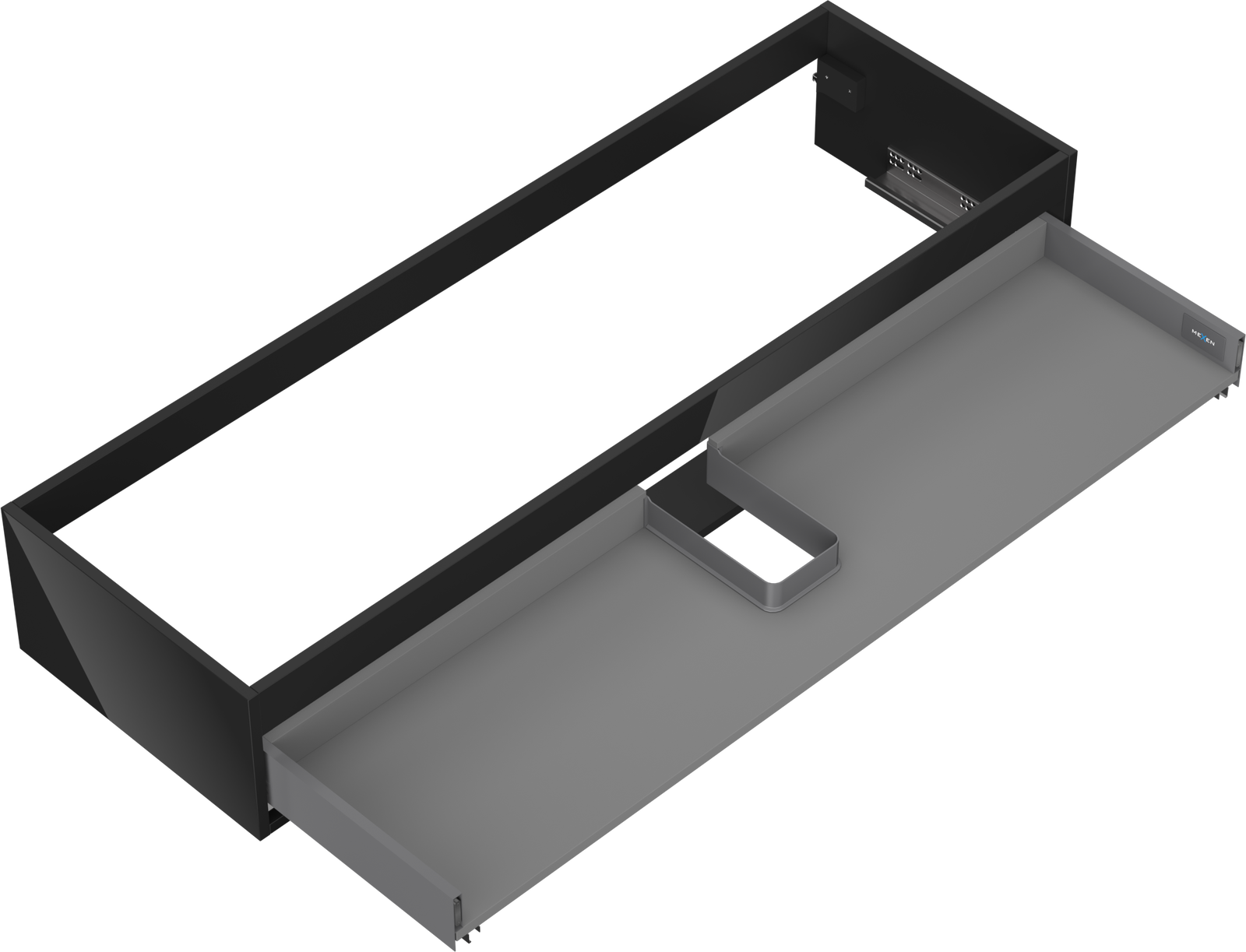 Wycięcie w szufladzie jest zaprojektowane w taki sposób, aby pomieścić syfon, który jest niezbędny w instalacjach umywalkowych. Dzięki temu mebel może być zamontowany w pełni funkcjonalnie, bez konieczności rezygnowania z przestrzeni w szufladzie na rzecz instalacji.