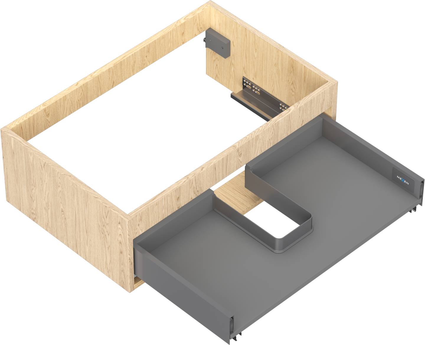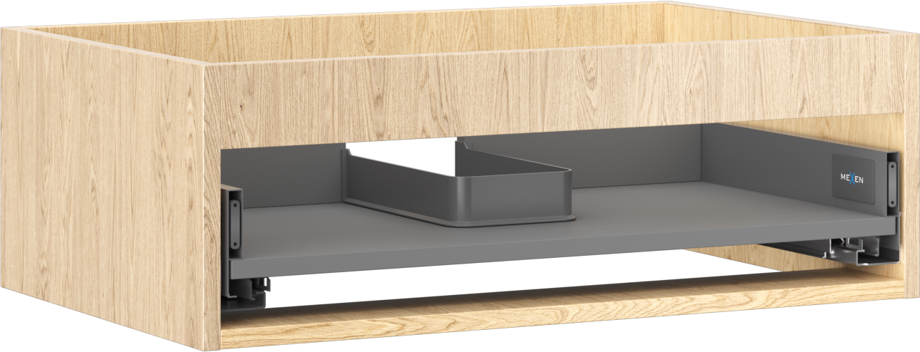 Wycięcie w szufladzie jest zaprojektowane w taki sposób, aby pomieścić syfon, który jest niezbędny w instalacjach umywalkowych. Dzięki temu mebel może być zamontowany w pełni funkcjonalnie, bez konieczności rezygnowania z przestrzeni w szufladzie na rzecz instalacji.