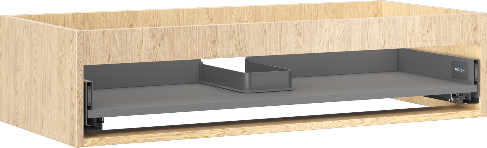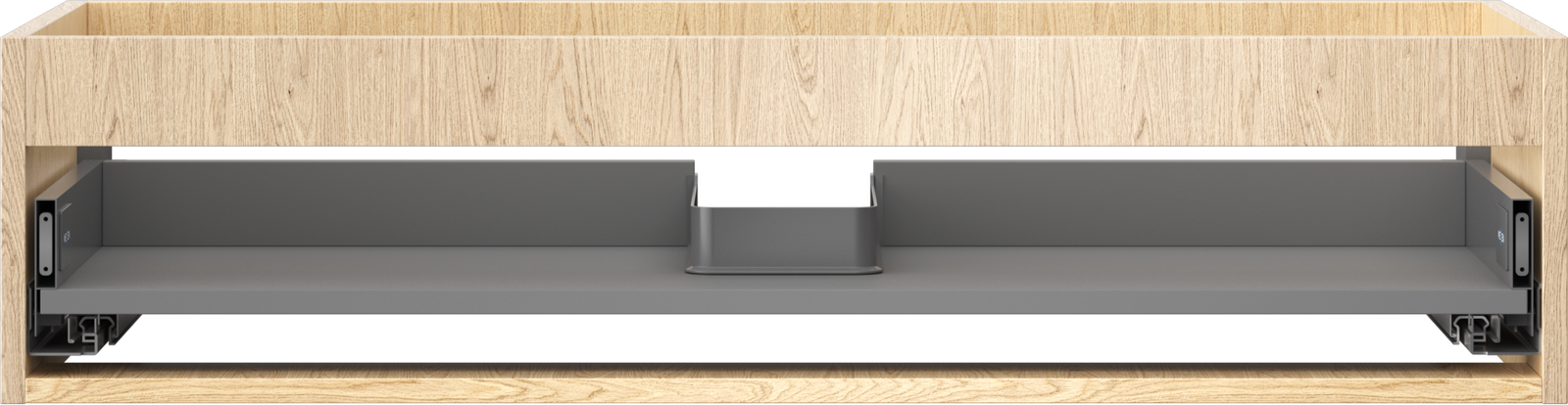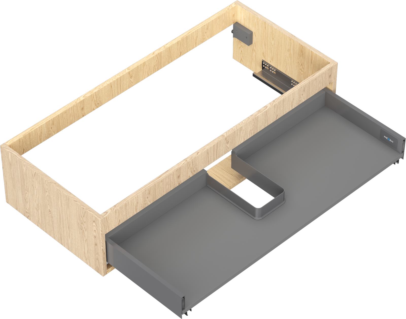 Wycięcie w szufladzie jest zaprojektowane w taki sposób, aby pomieścić syfon, który jest niezbędny w instalacjach umywalkowych. Dzięki temu mebel może być zamontowany w pełni funkcjonalnie, bez konieczności rezygnowania z przestrzeni w szufladzie na rzecz instalacji.