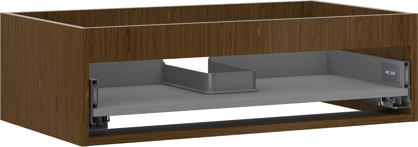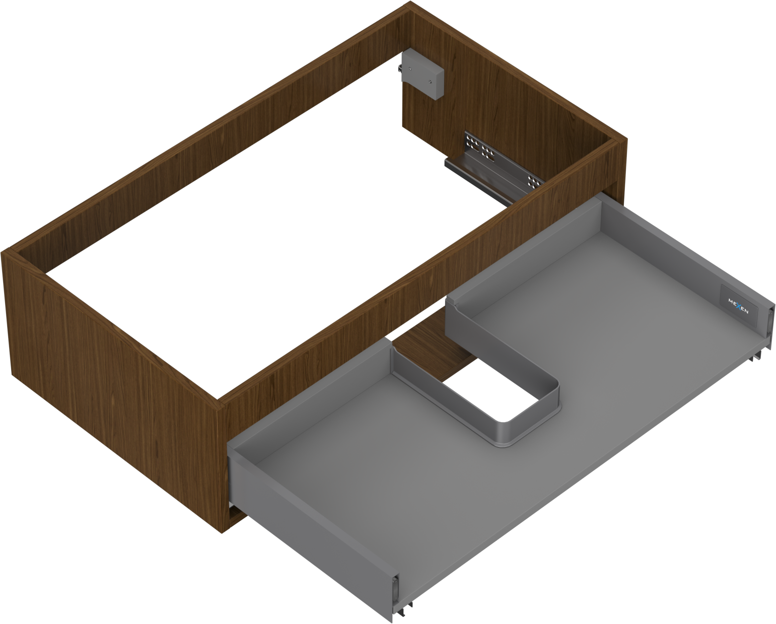 Wycięcie w szufladzie jest zaprojektowane w taki sposób, aby pomieścić syfon, który jest niezbędny w instalacjach umywalkowych. Dzięki temu mebel może być zamontowany w pełni funkcjonalnie, bez konieczności rezygnowania z przestrzeni w szufladzie na rzecz instalacji.