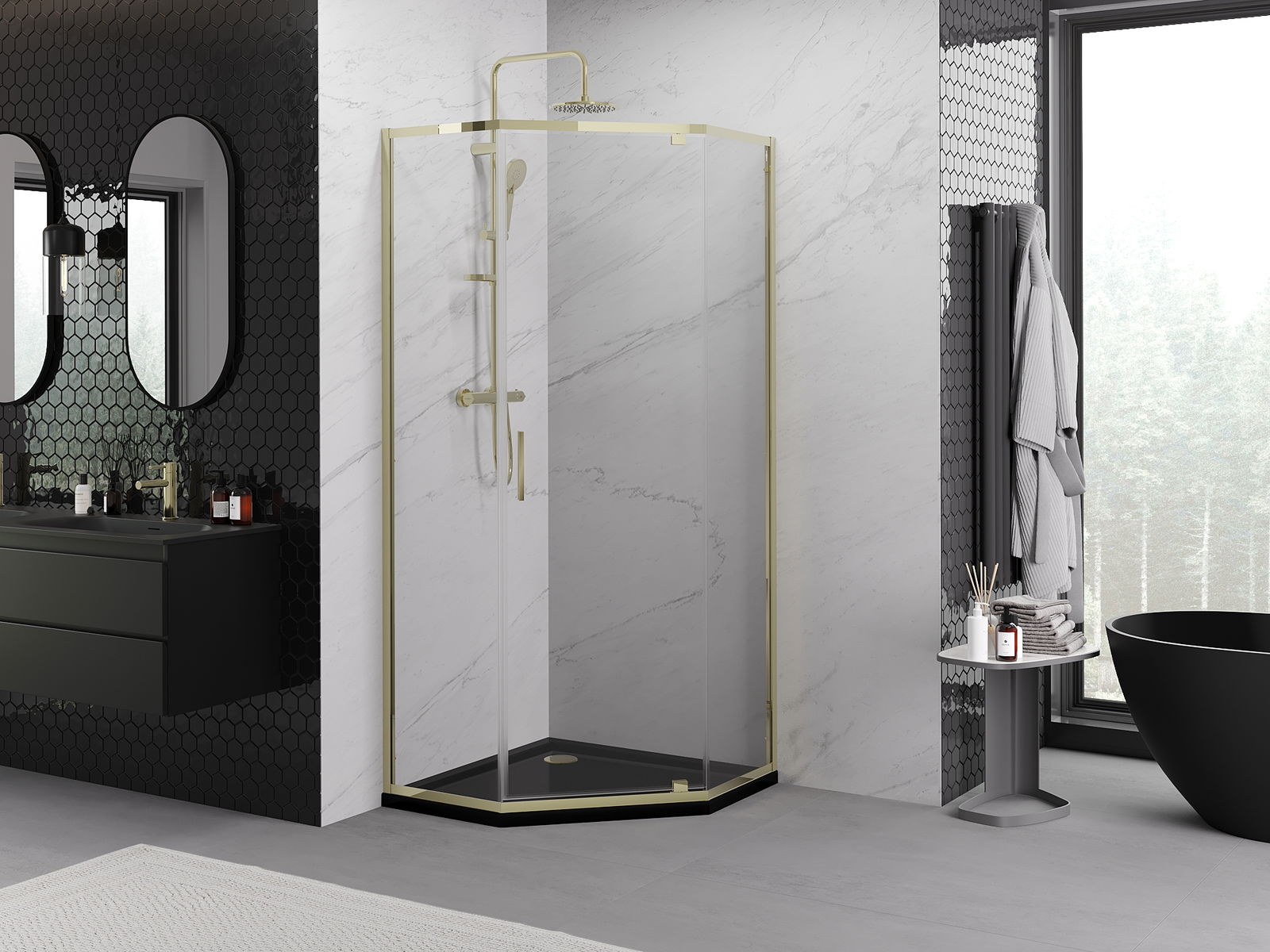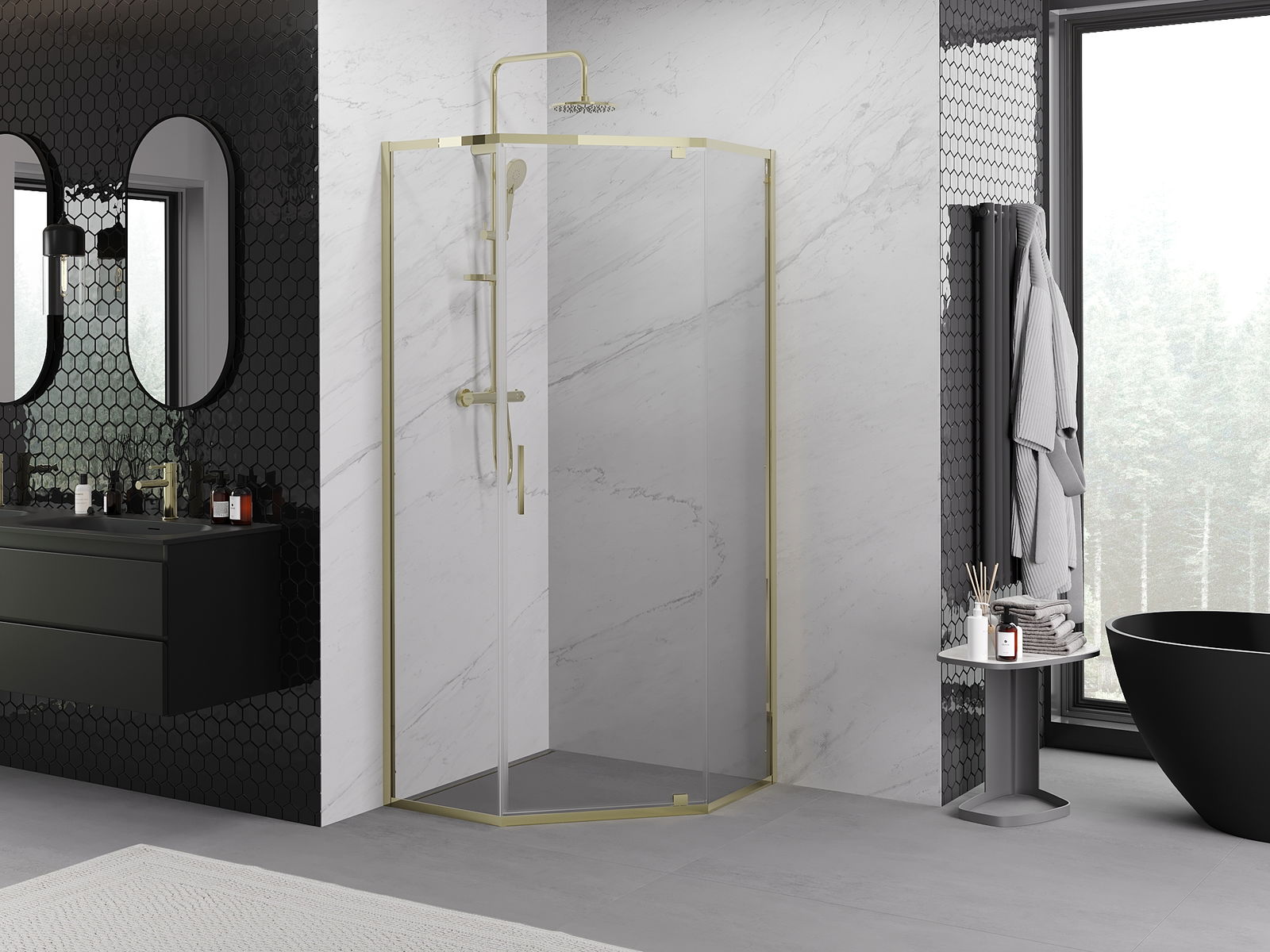 Mexen Exo kabina prysznicowa pięciokątna uchylna 90 x 90 cm, transparent, złota - 812-090-090-50-00