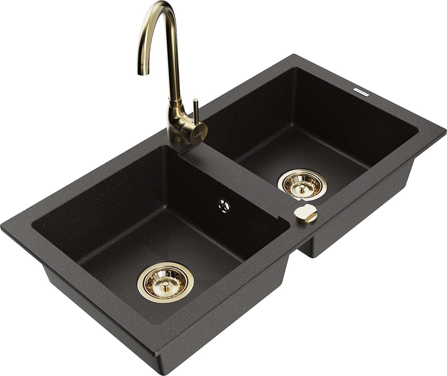 • Mexen Mario zlewozmywak granitowy 2-komorowy z baterią kuchenną Telma, czarny/złoty - 6504-75-670200-50