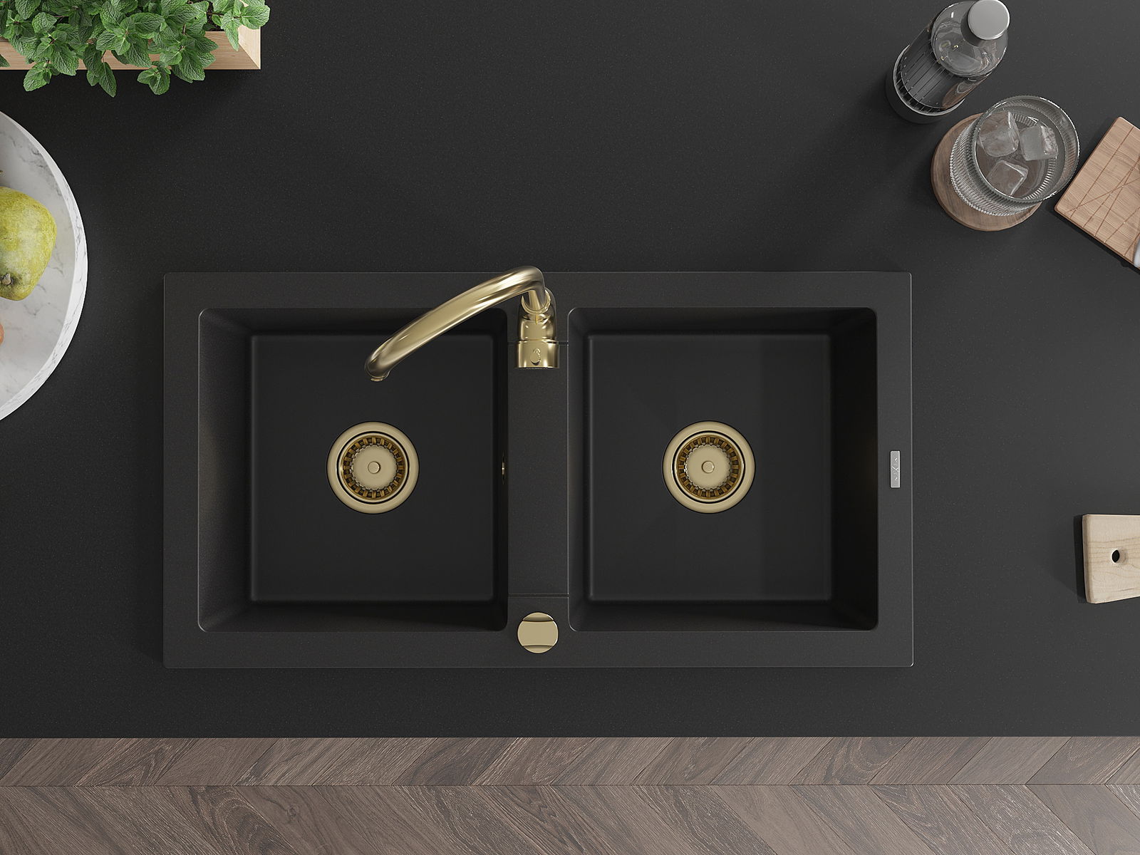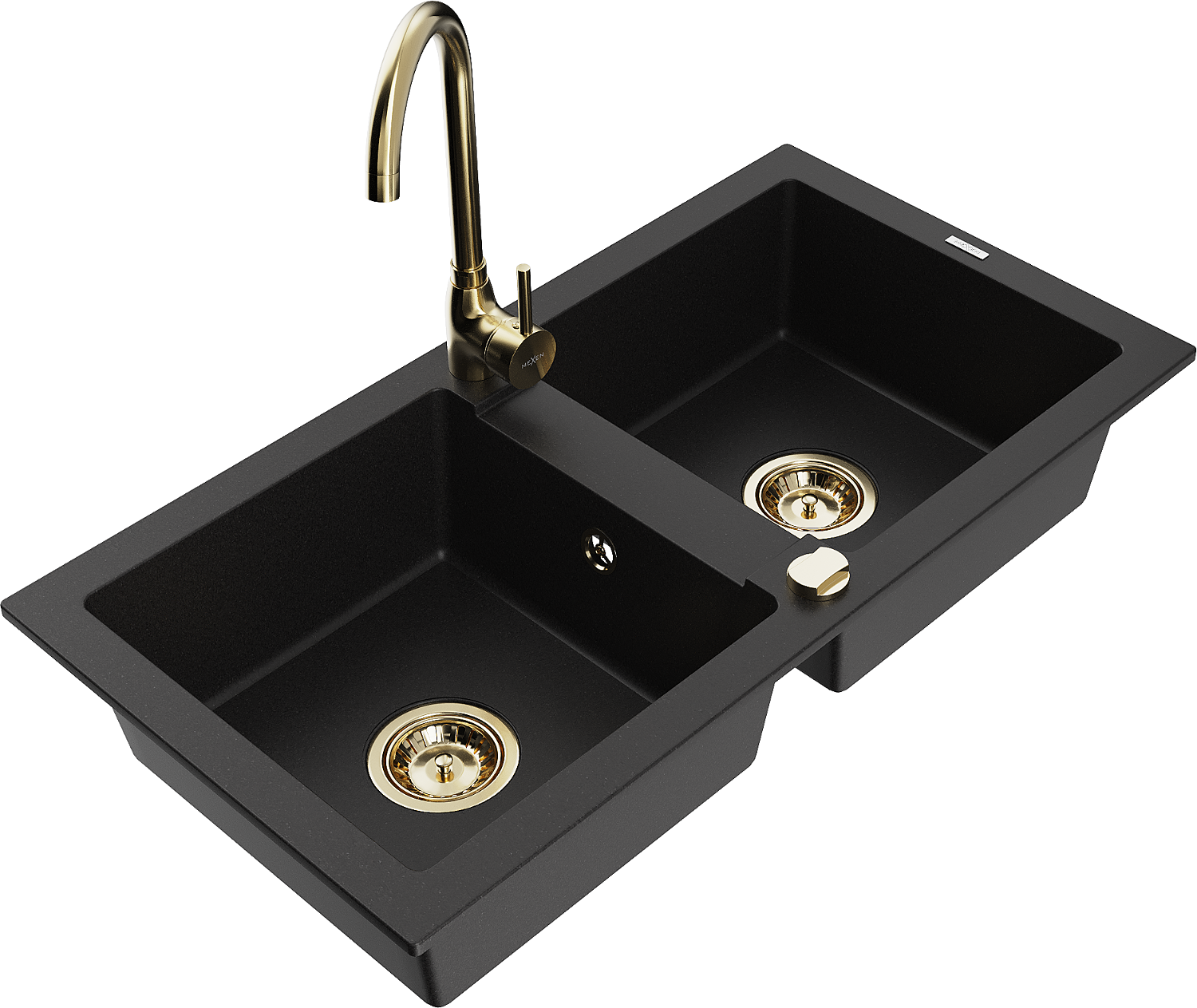 Mexen Mario zlewozmywak granitowy 2-komorowy z baterią kuchenną Telma, czarny - 6504-77-670200-50
