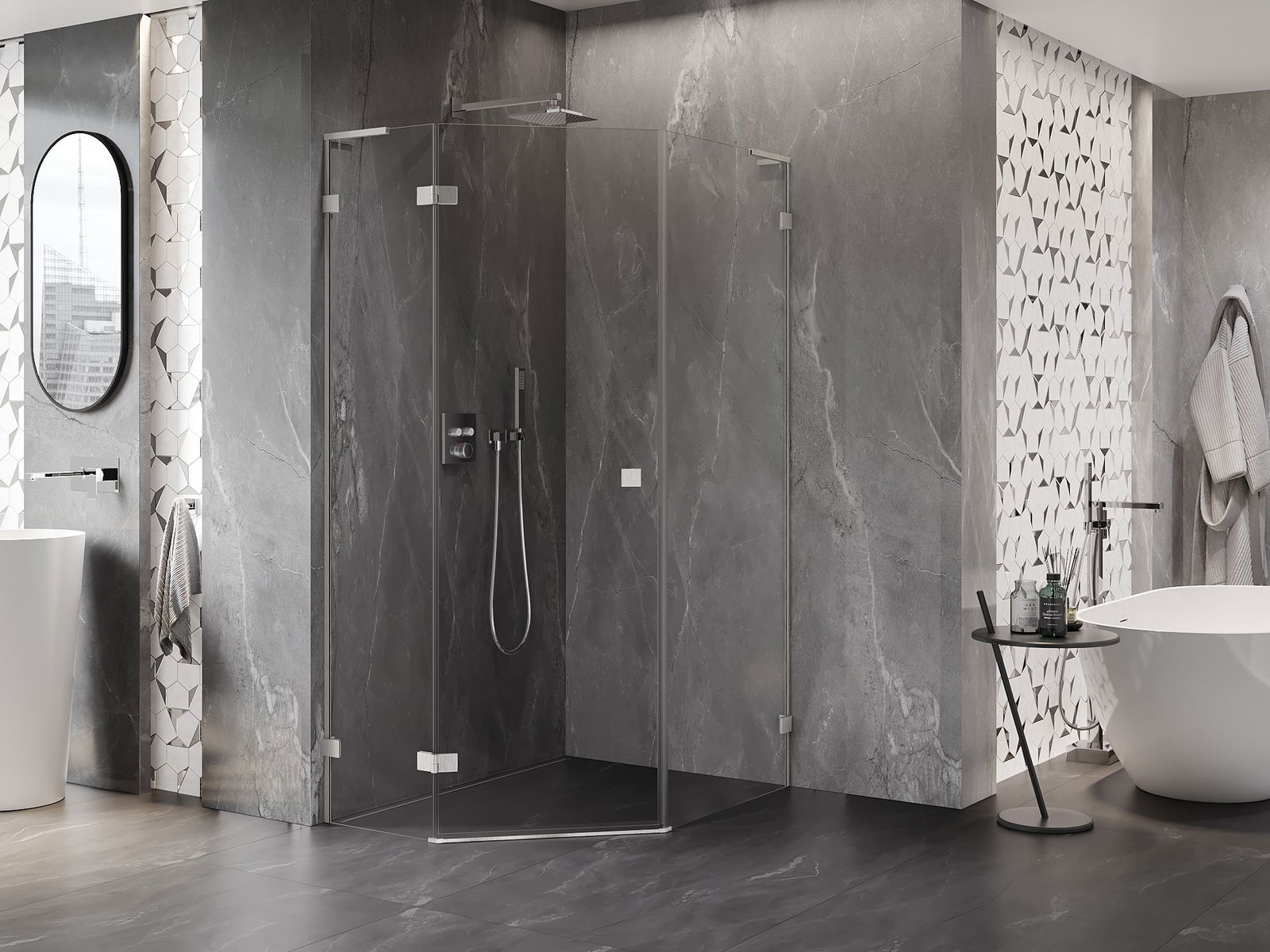 Poręczny i wygodny uchwyt został wykonany z trwałego i odpornego metalu. Modny kształt w połączeniu z wykończeniem dopasowanym do koloru profili nadaje całości nowoczesnego i stylowego wyglądu, podkreślając estetykę każdej łazienki.
