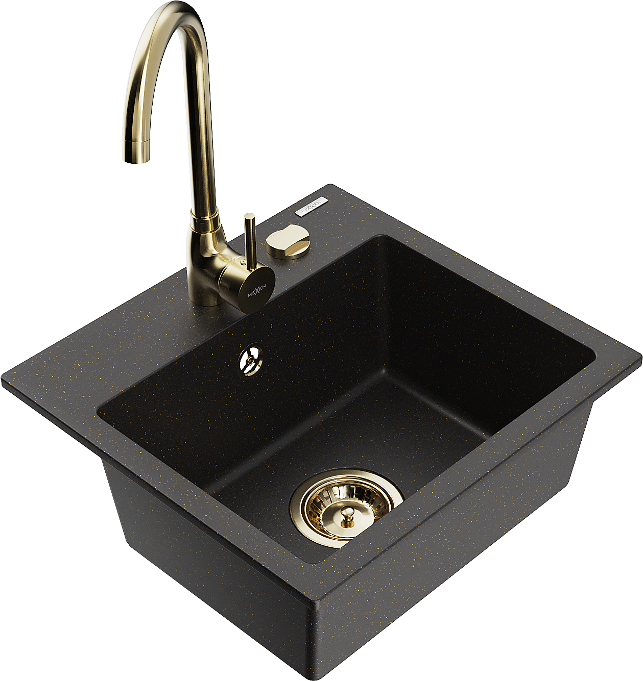 Mexen Milo zlewozmywak granitowy 1-komorowy z baterią kuchenną Telma, czarny/złoty - 6505-75-670200-50