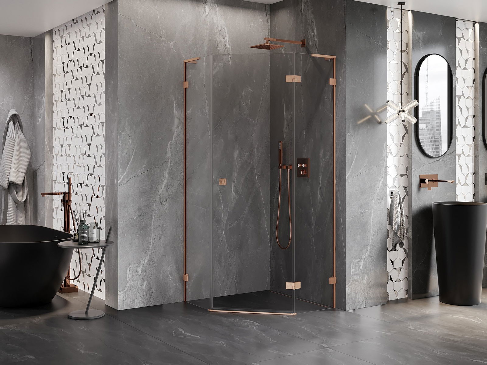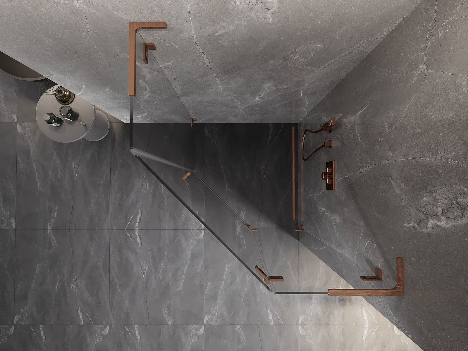 Mexen Lunar L kabina prysznicowa pięciokątna uchylna prawa 100x100 cm, transparent, miedź szczotkowana - 831L-100P-100L-65-00-P
