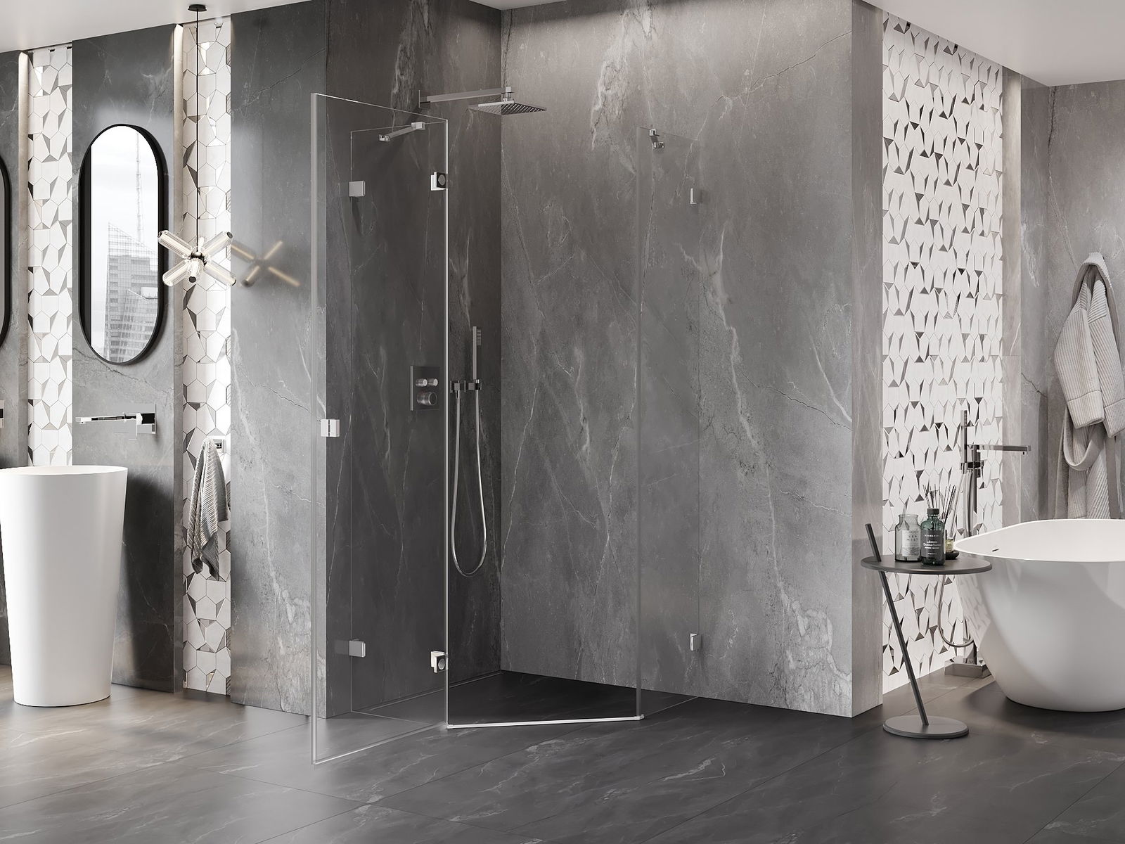 Poręczny i wygodny uchwyt został wykonany z trwałego i odpornego metalu. Modny kształt w połączeniu z wykończeniem dopasowanym do koloru profili nadaje całości nowoczesnego i stylowego wyglądu, podkreślając estetykę każdej łazienki.