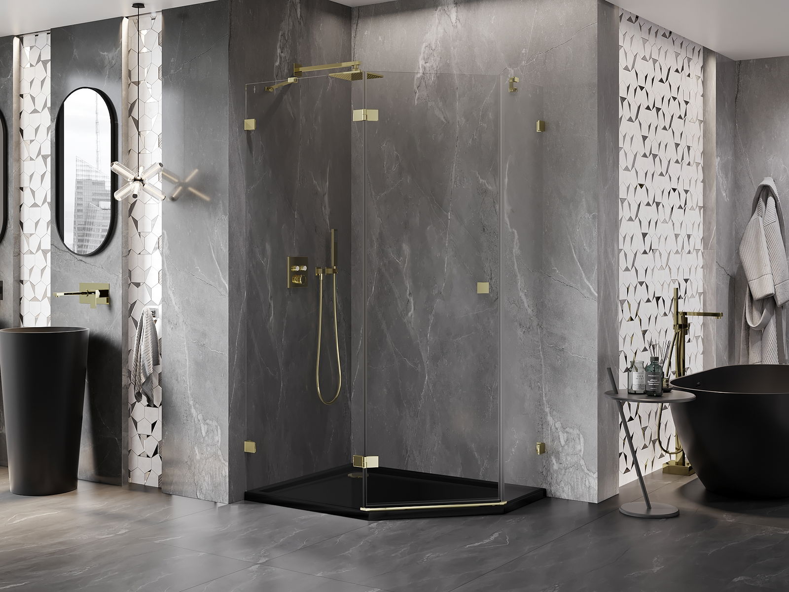 Mexen Lunar kabina prysznicowa pięciokątna uchylna lewa 90 x 80 cm, transparent, złota - 831-090L-080P-50-00-L