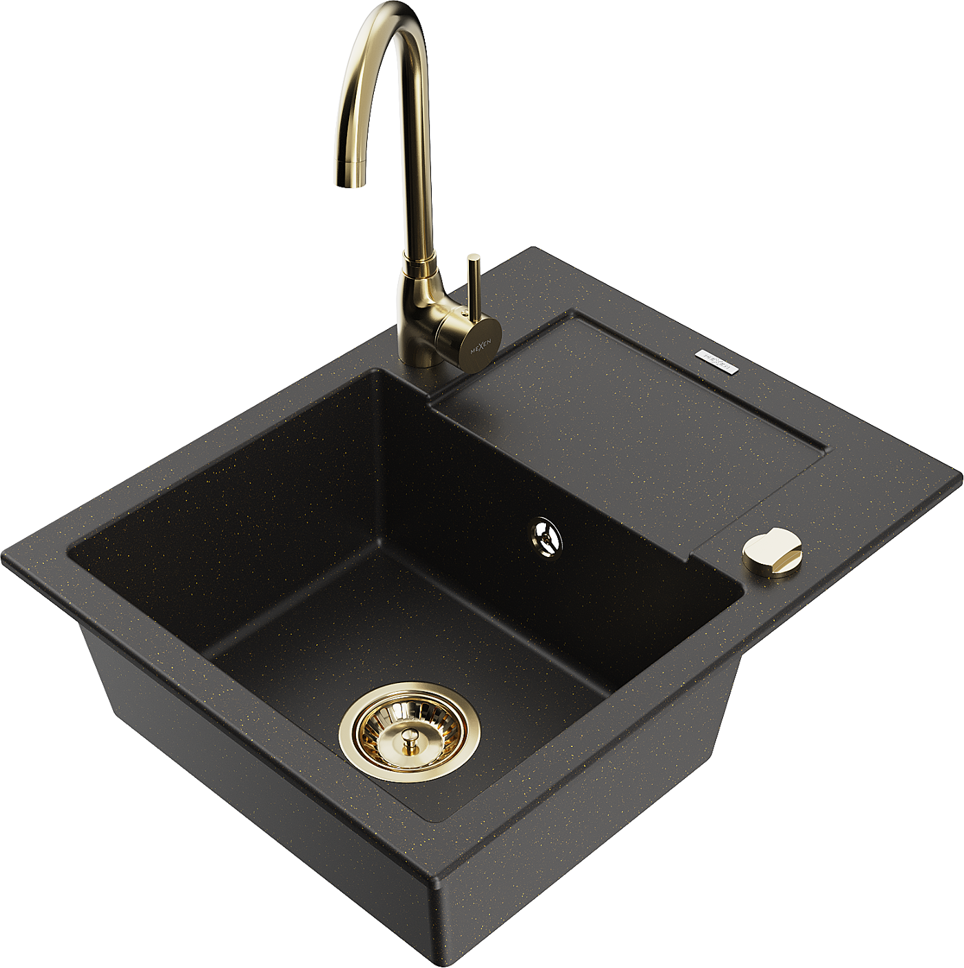Mexen Enzo zlewozmywak granitowy 1-komorowy z ociekaczem i baterią kuchenną Telma, czarny/złoty - 6506-75-670200-50