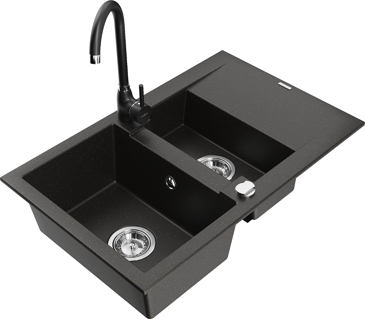 Mexen Gaspar zlewozmywak granitowy 1,5-komorowy z ociekaczem i baterią kuchenną Telma, czarny/złoty - 6507-75-670200-70