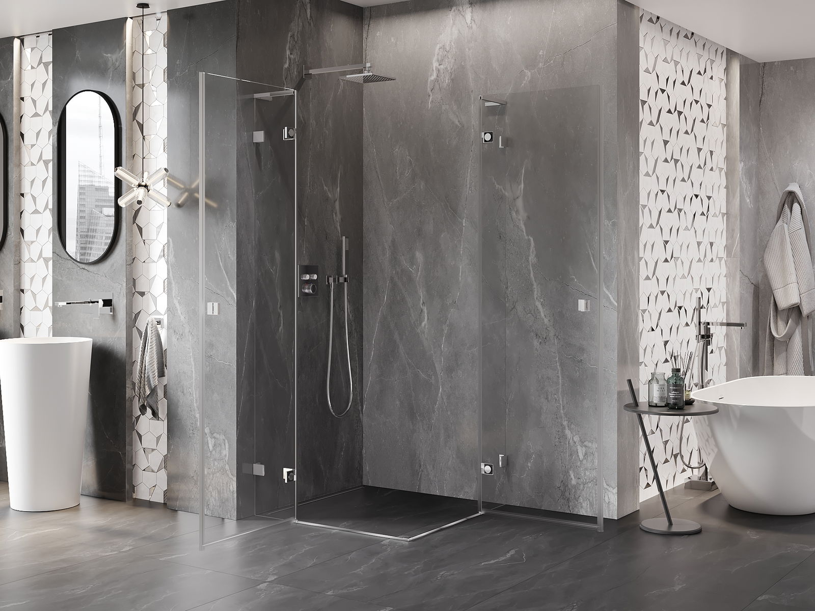 Klamry i zawiasy zostały wykonane z bardzo trwałego mosiądzu, a dodatkowo tworzą zlicowaną taflę szkła. Jest to doskonały wybór, który łączy elegancję, trwałość i nowoczesny design. Dzięki takim rozwiązaniom prysznic zyskuje na estetyce, a jednocześnie ułatwiają utrzymanie czystości.