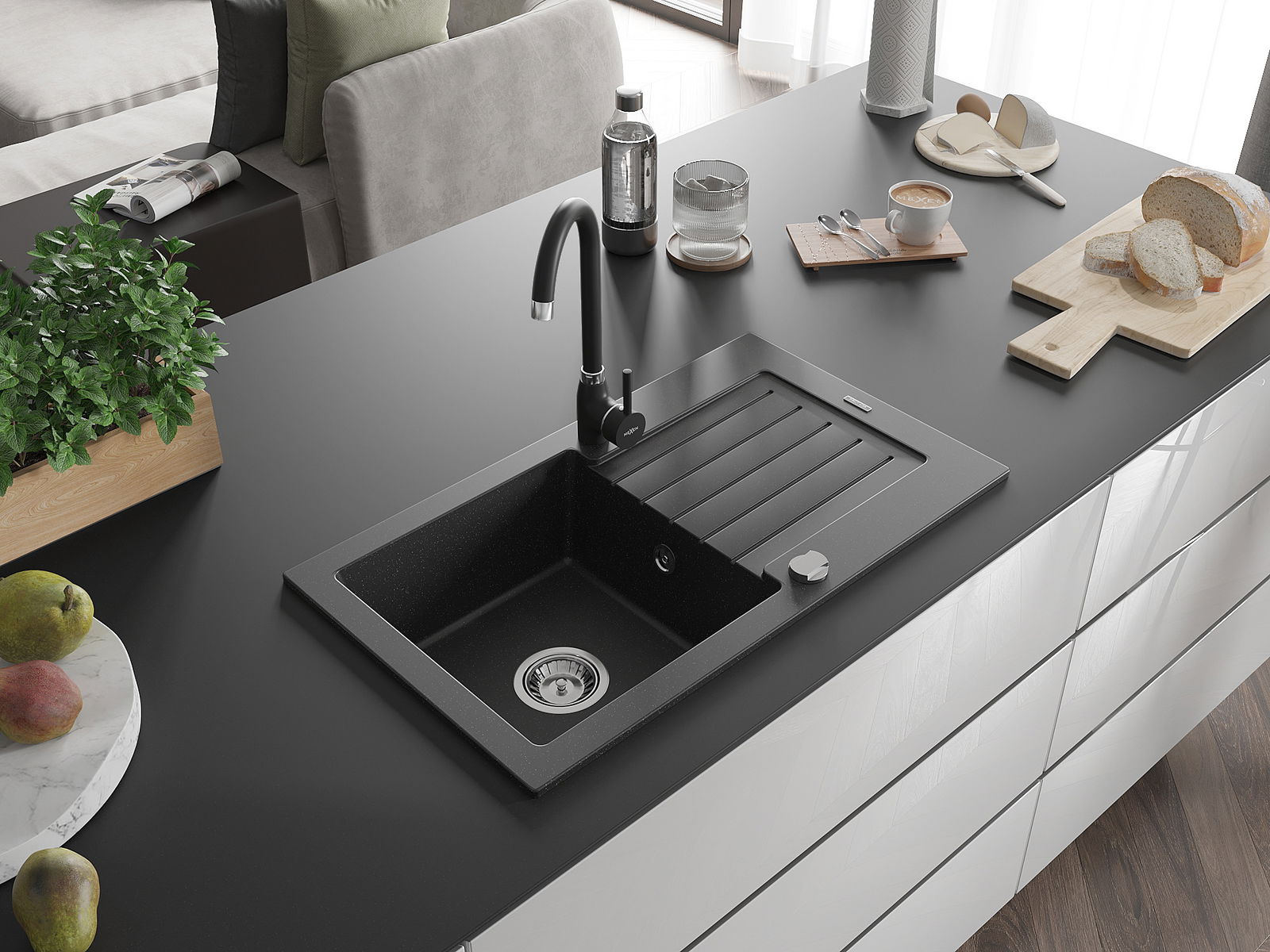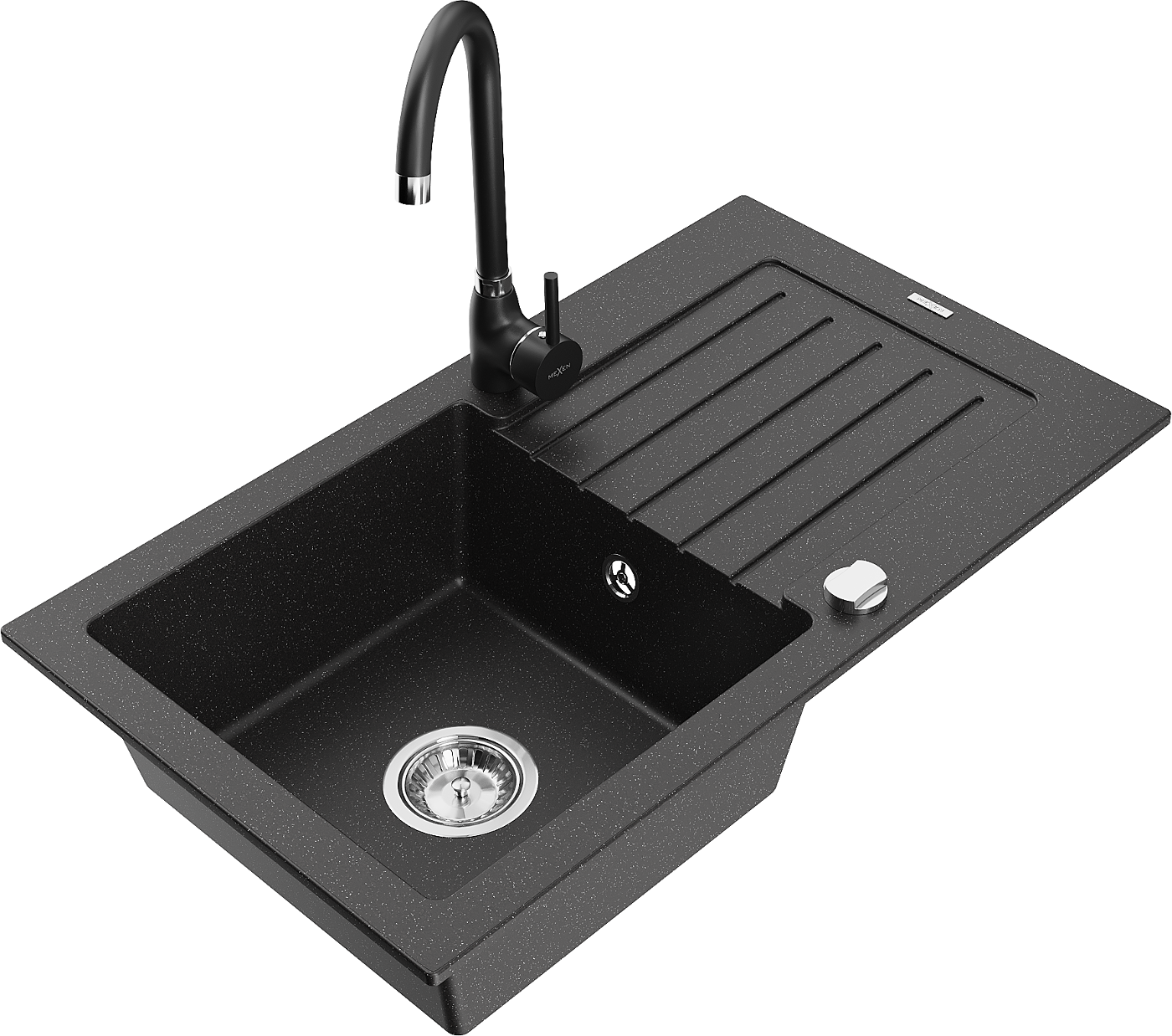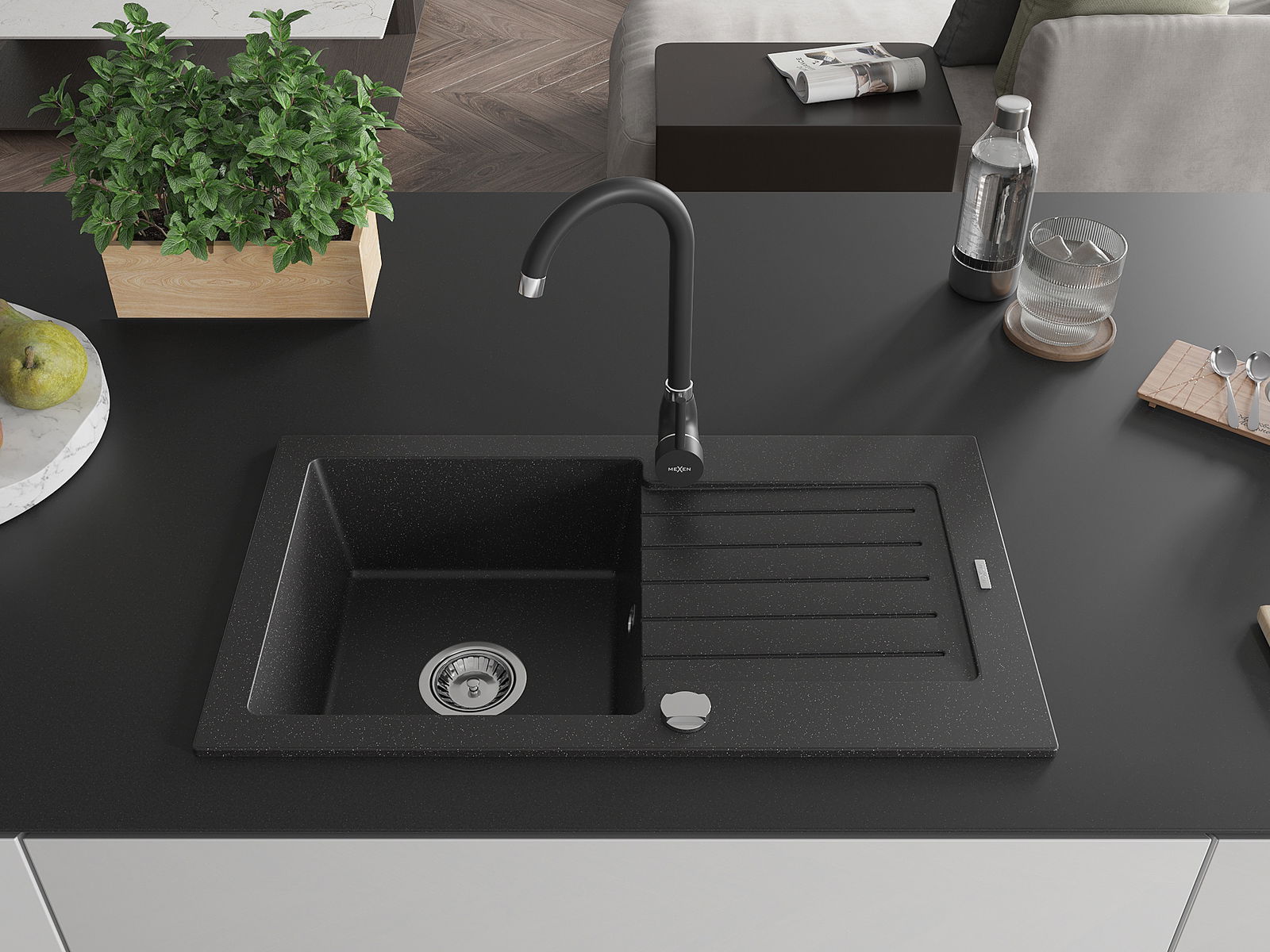 Mexen Pablo zlewozmywak granitowy 1-komorowy z ociekaczem i baterią kuchenną Telma, czarny/srebrny - 6510-73-670200-70
