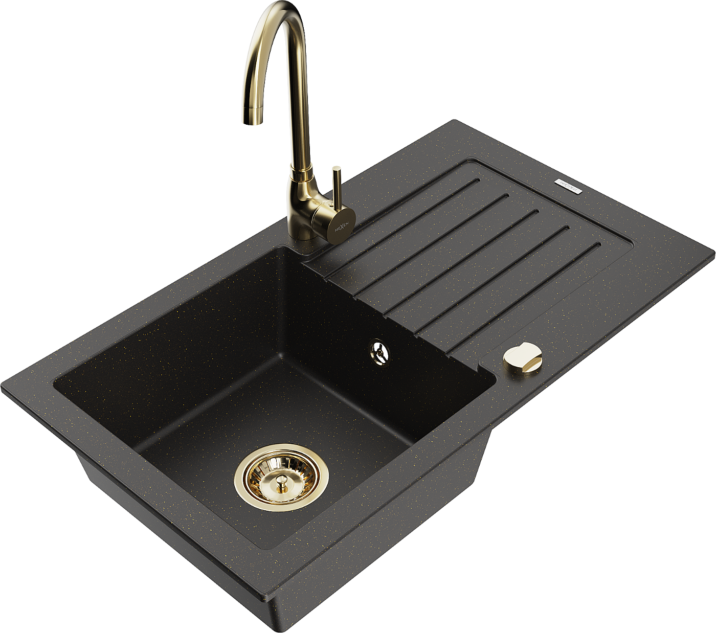 Mexen Pablo zlewozmywak granitowy 1-komorowy z ociekaczem i baterią kuchenną Telma, czarny/złoty - 6510-75-670200-50