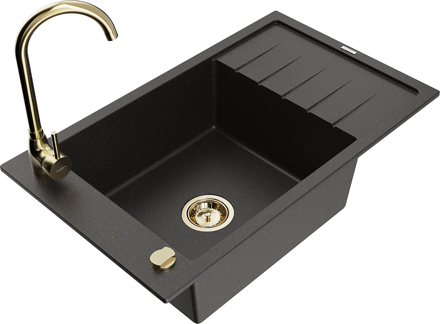 Mexen Elias zlewozmywak granitowy 1-komorowy z ociekaczem i baterią kuchenną Telma, czarny/złoty - 6511-75-670200-50