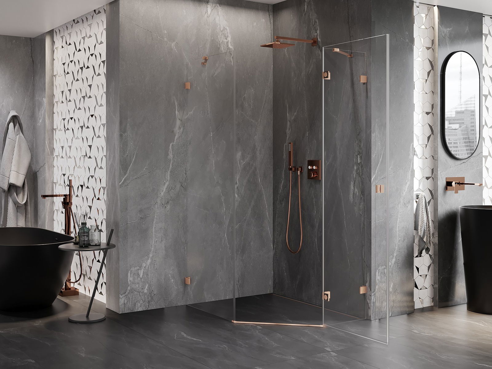 Klamry i zawiasy zostały wykonane z bardzo trwałego mosiądzu, a dodatkowo tworzą zlicowaną taflę szkła. Jest to doskonały wybór, który łączy elegancję, trwałość i nowoczesny design. Dzięki takim rozwiązaniom prysznic zyskuje na estetyce, a jednocześnie ułatwiają utrzymanie czystości.